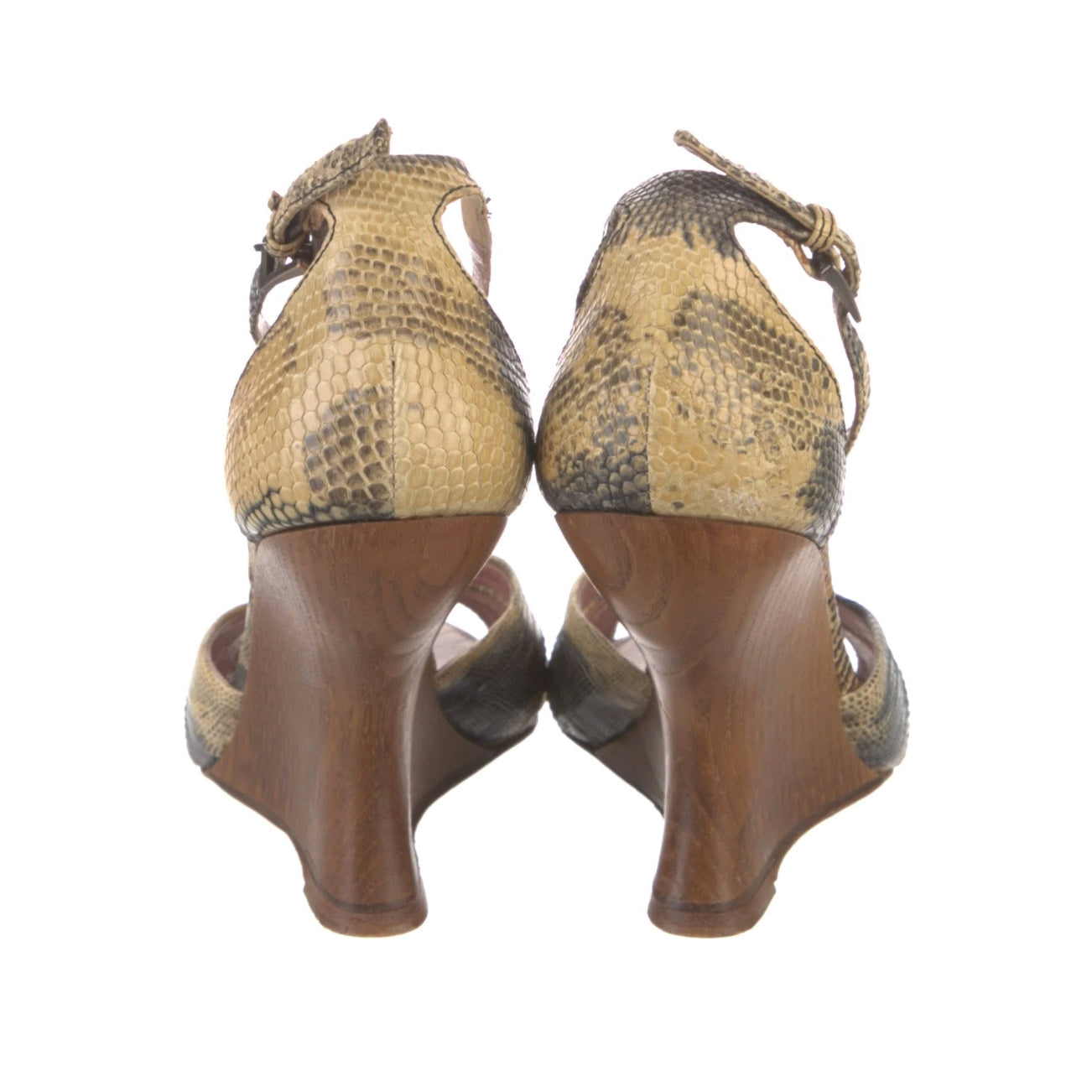 Description - Vintage neutral python leather sandals with adjustable buckle straps at ankles, wooden wedge sole, crossover detail and rounded peep toes.