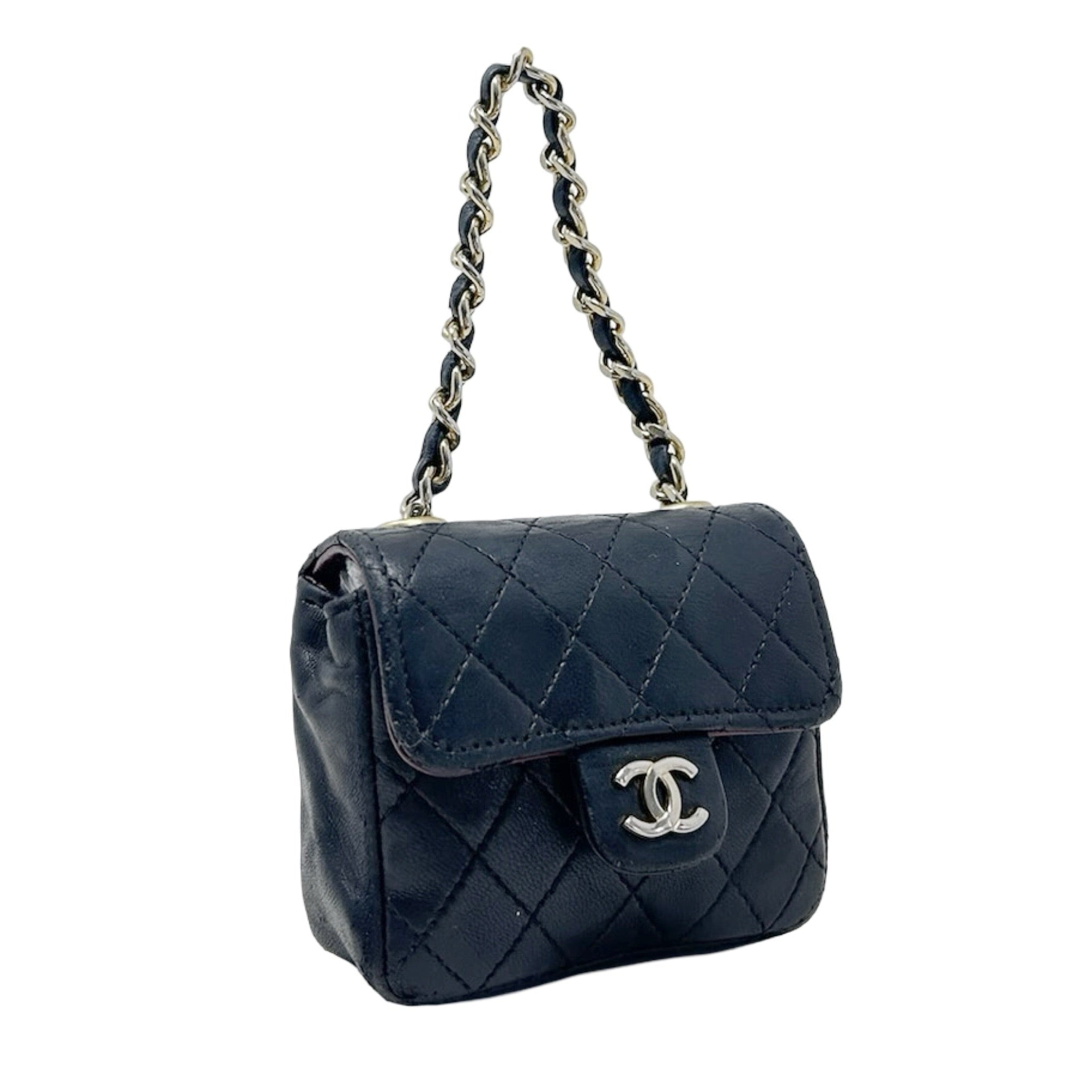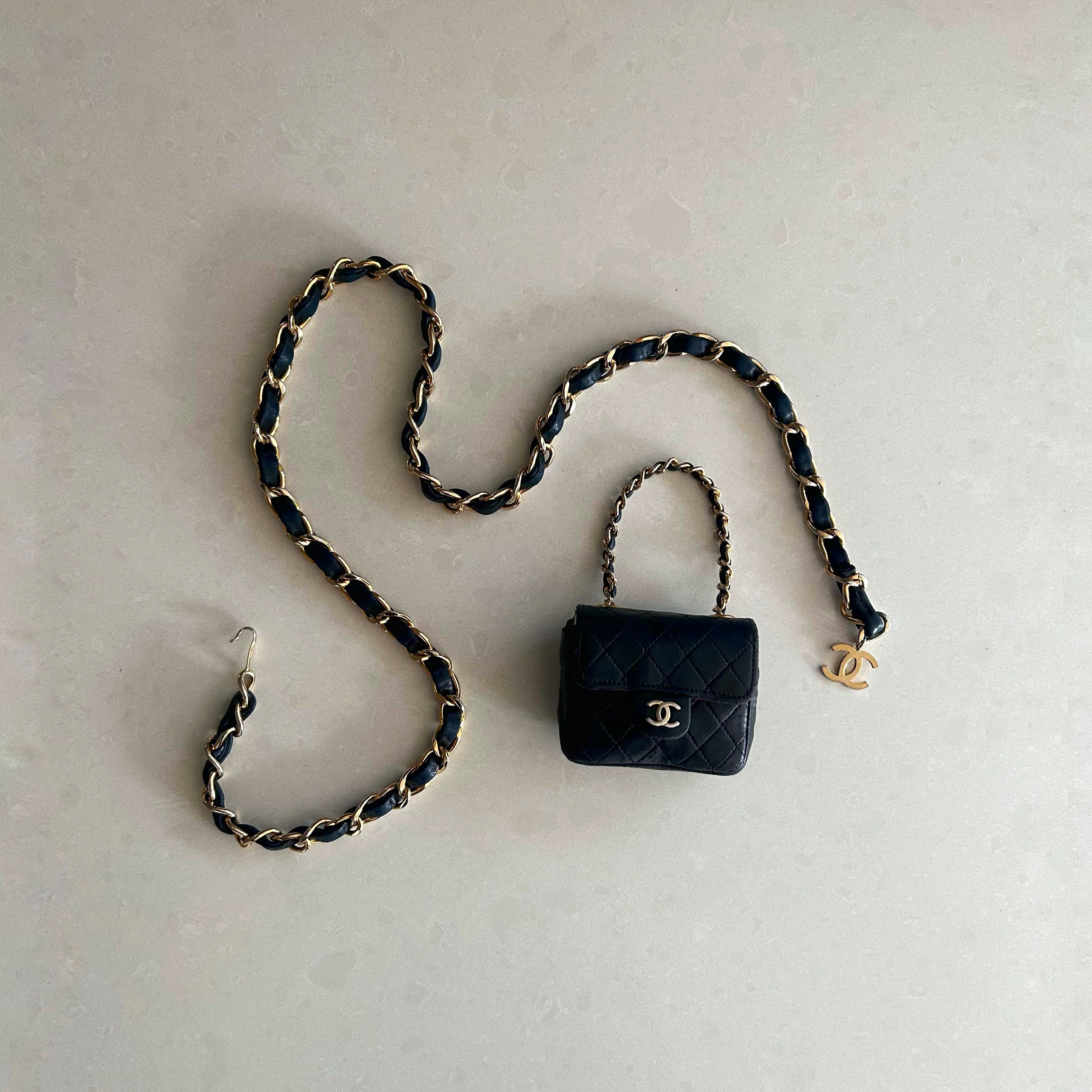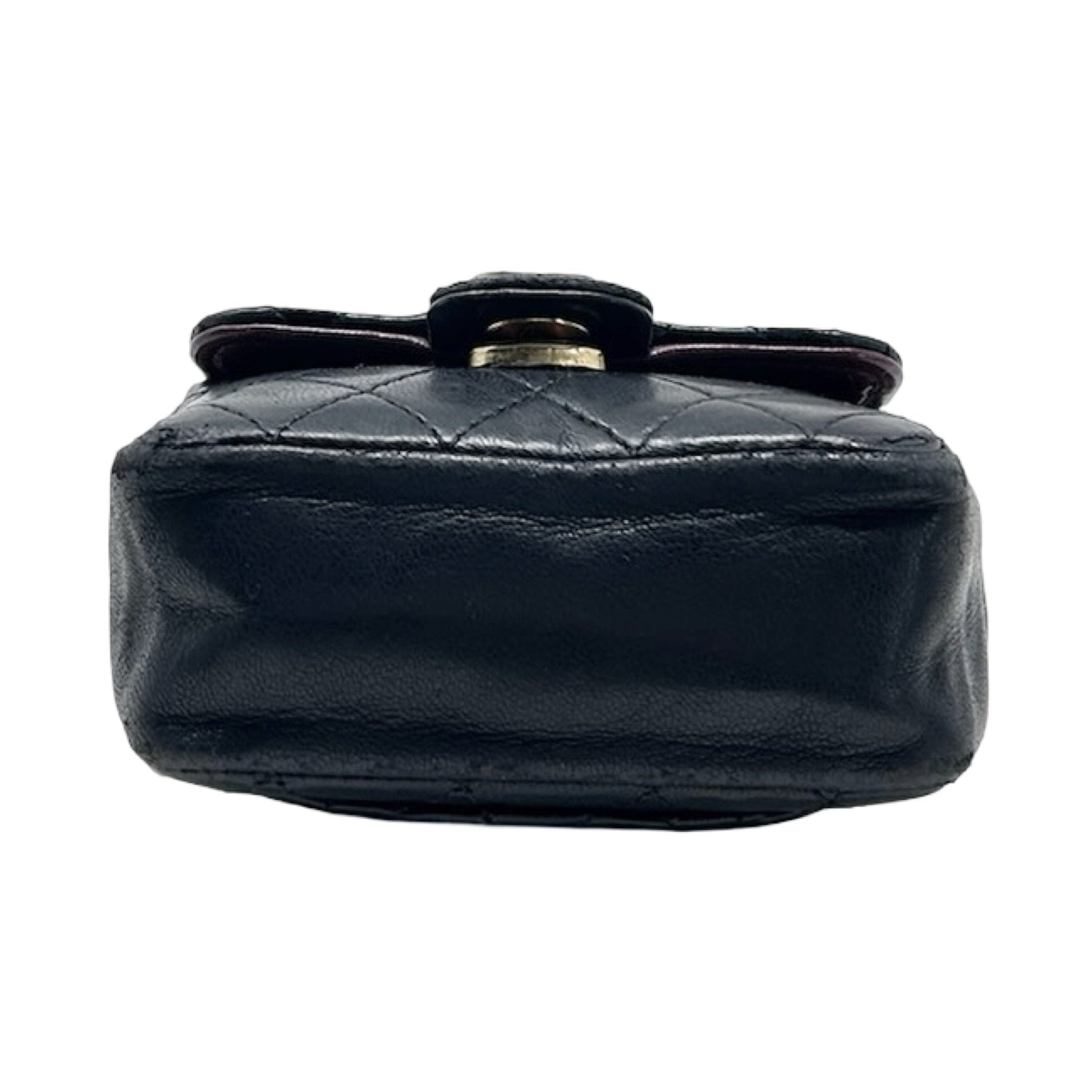 Description - Late 1990's black quilted leather Chanel classic micro flap bag with tonal chain link shoulder strap, gold tone hardware, cc logo embellishment at centre front, snap closure at front, burgundy leather lining, and slip pocket on back. Comes with detachable - adjustable gold tone chain link belt with leather embellishments and CC detail.