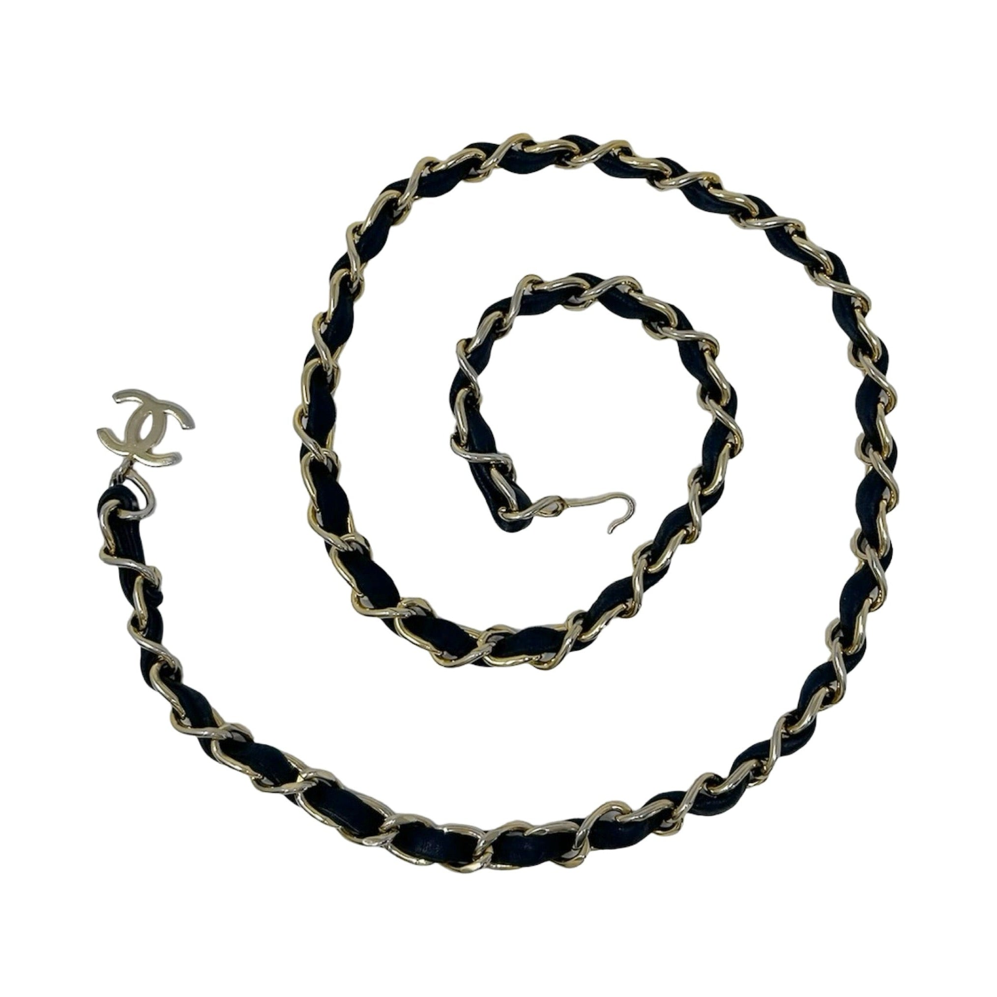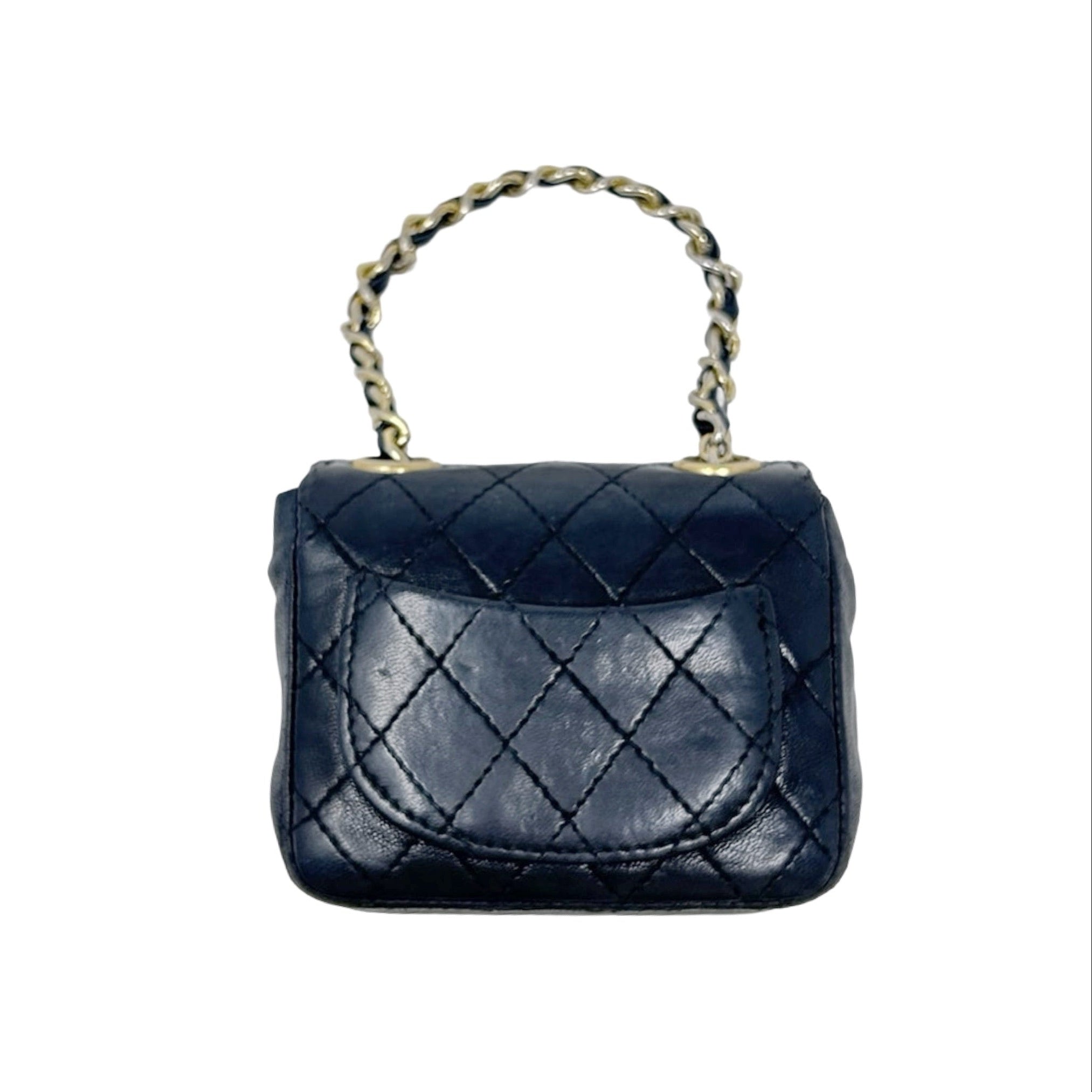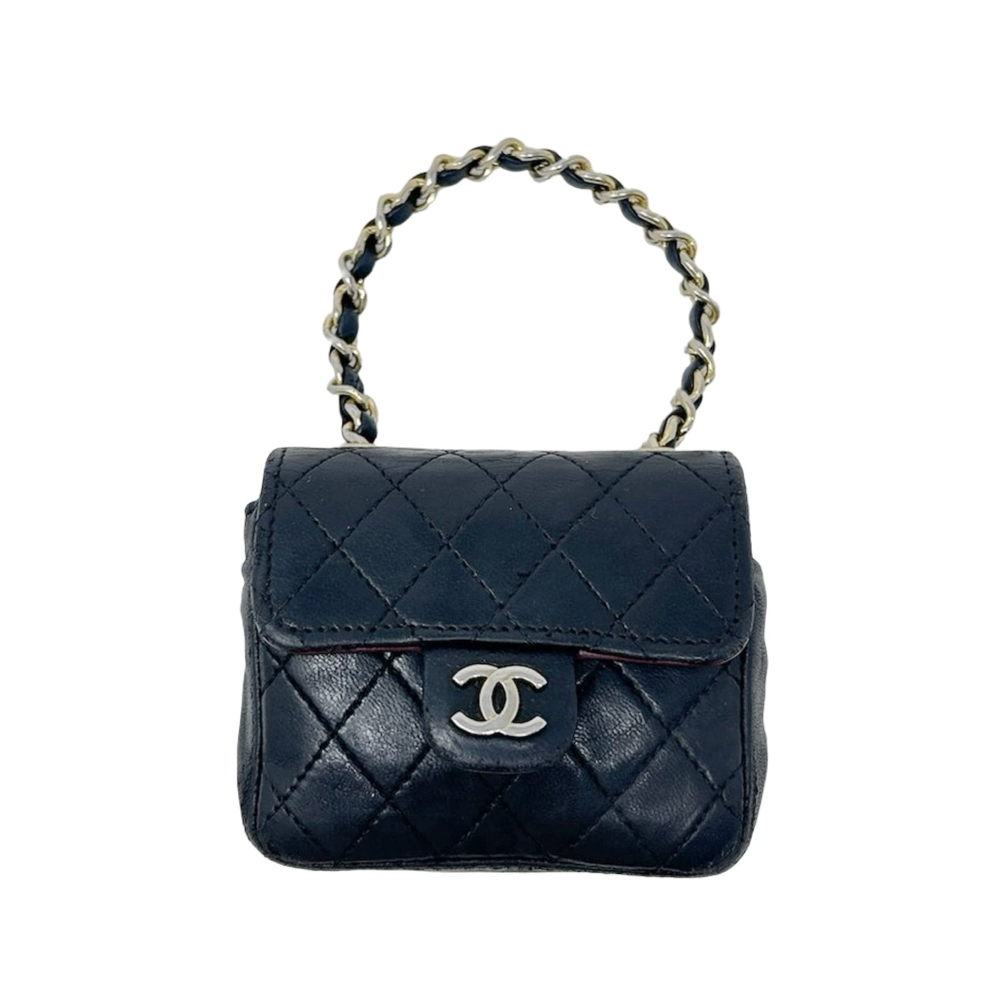 Description - Late 1990's black quilted leather Chanel classic micro flap bag with tonal chain link shoulder strap, gold tone hardware, cc logo embellishment at centre front, snap closure at front, burgundy leather lining, and slip pocket on back. Comes with detachable - adjustable gold tone chain link belt with leather embellishments and CC detail.