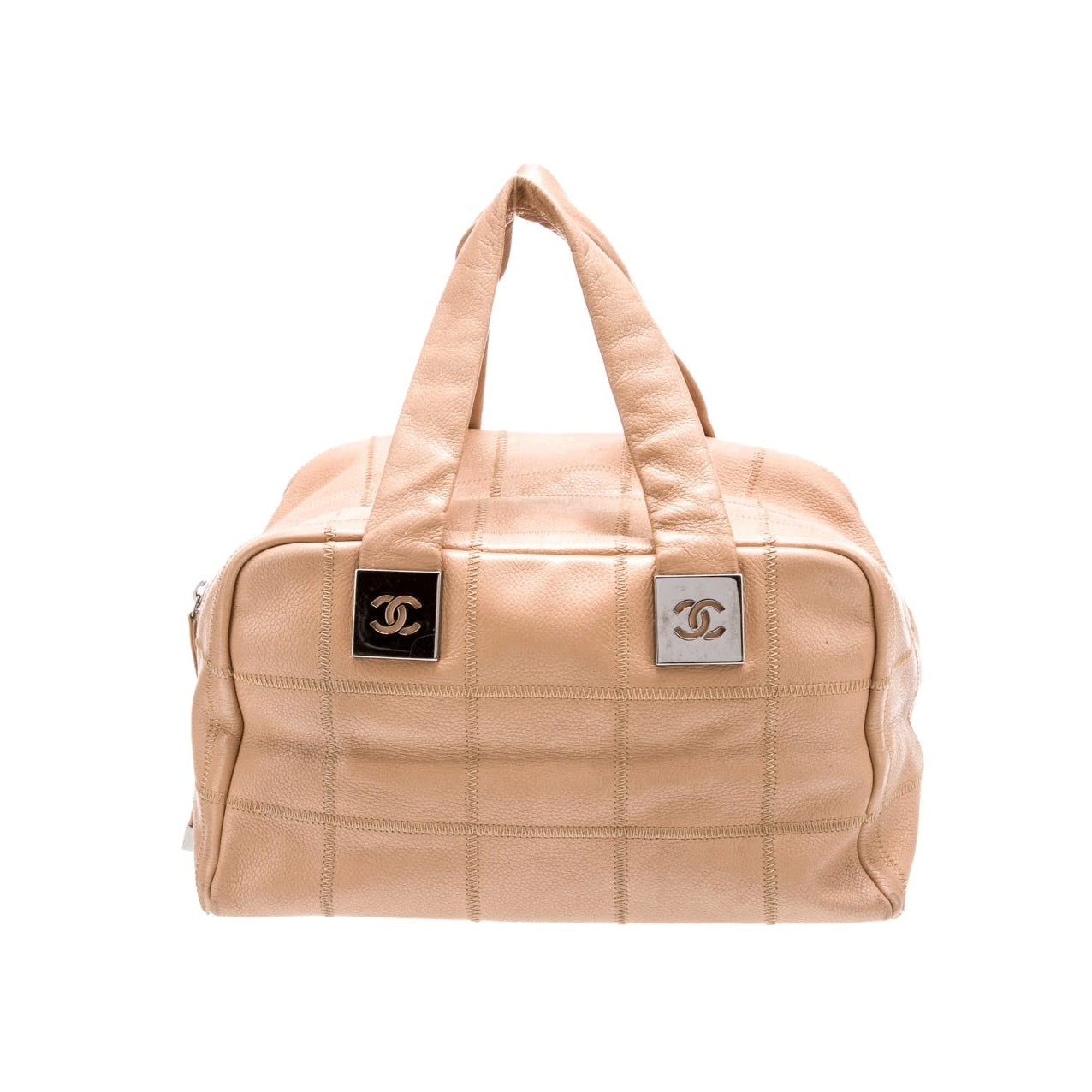 Description - Vintage Chanel CC lambskin quilted bowler bag in neutral leather with interlocking CC logo plates at base of straps, silver tone hardware, dual flat leather straps, zip closure at top, satin lining and single interior pocket.