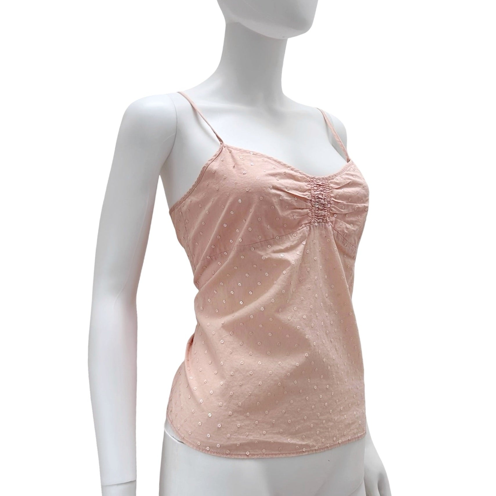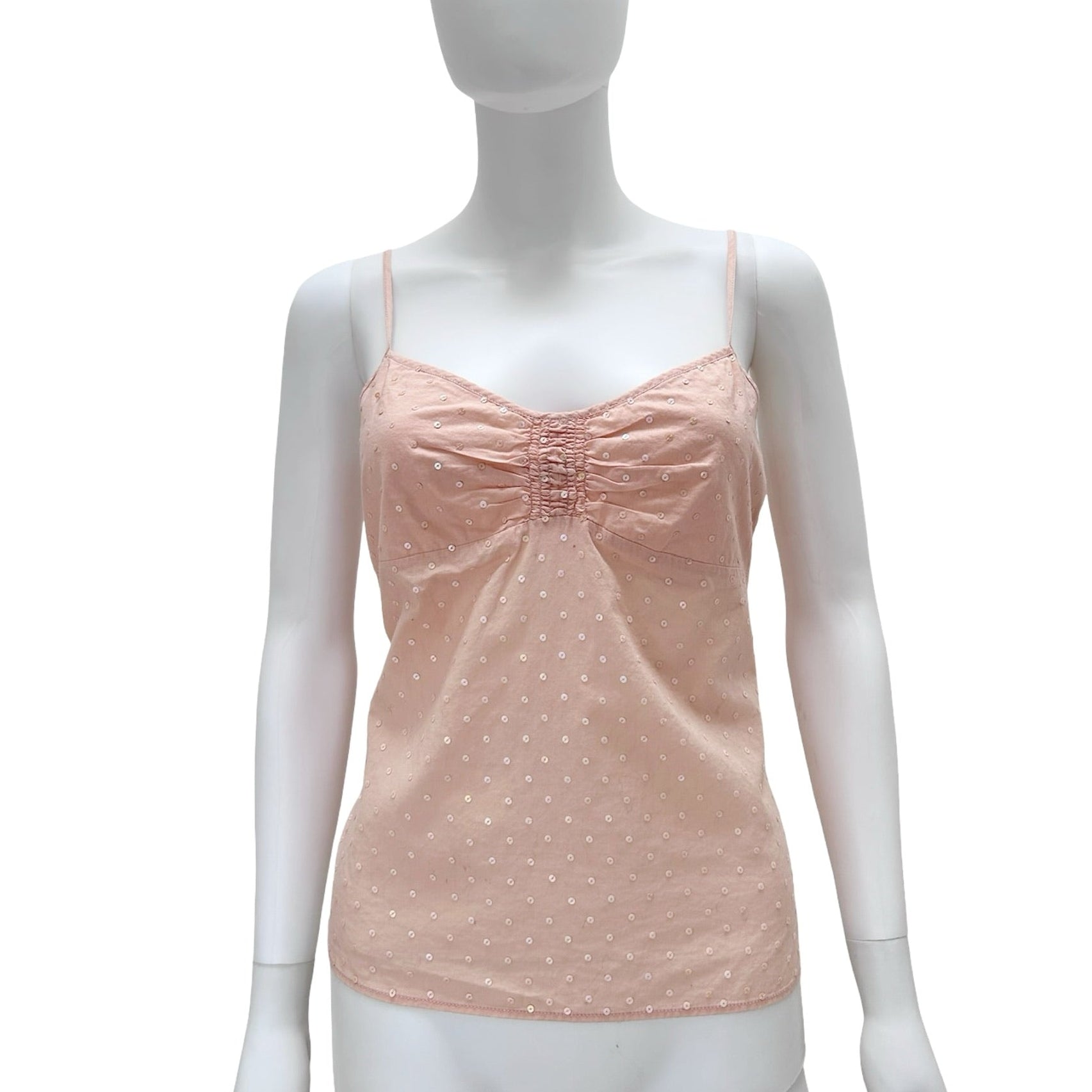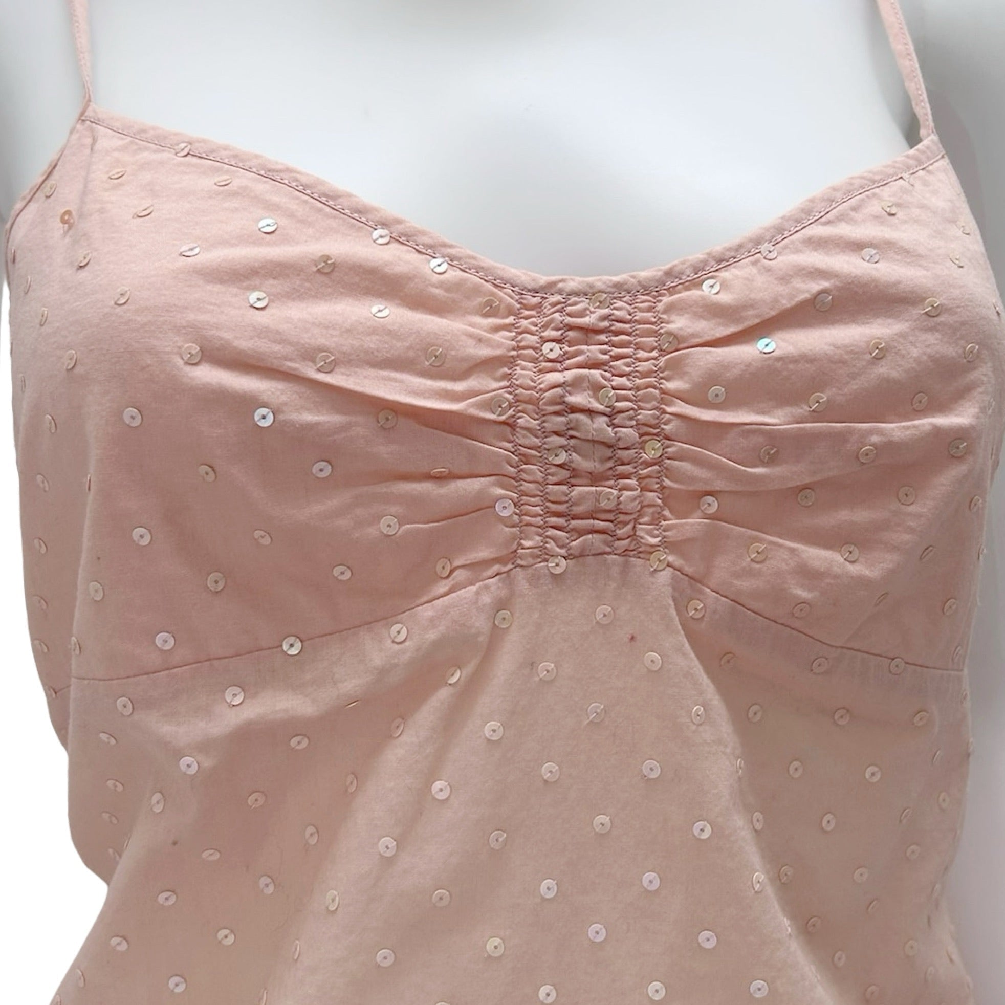 Description - Vintage sleeveless DKNY City pink scoop neck tank top with sequin embellishments throughout, gathered detail at front of shirt, adjustable straps, and zip closure at side.