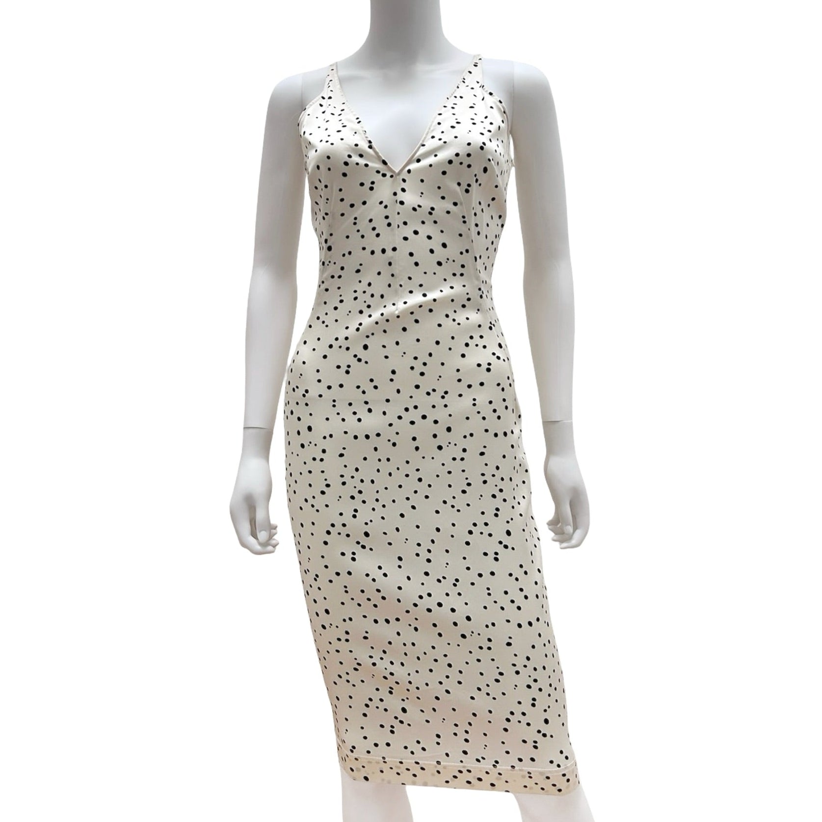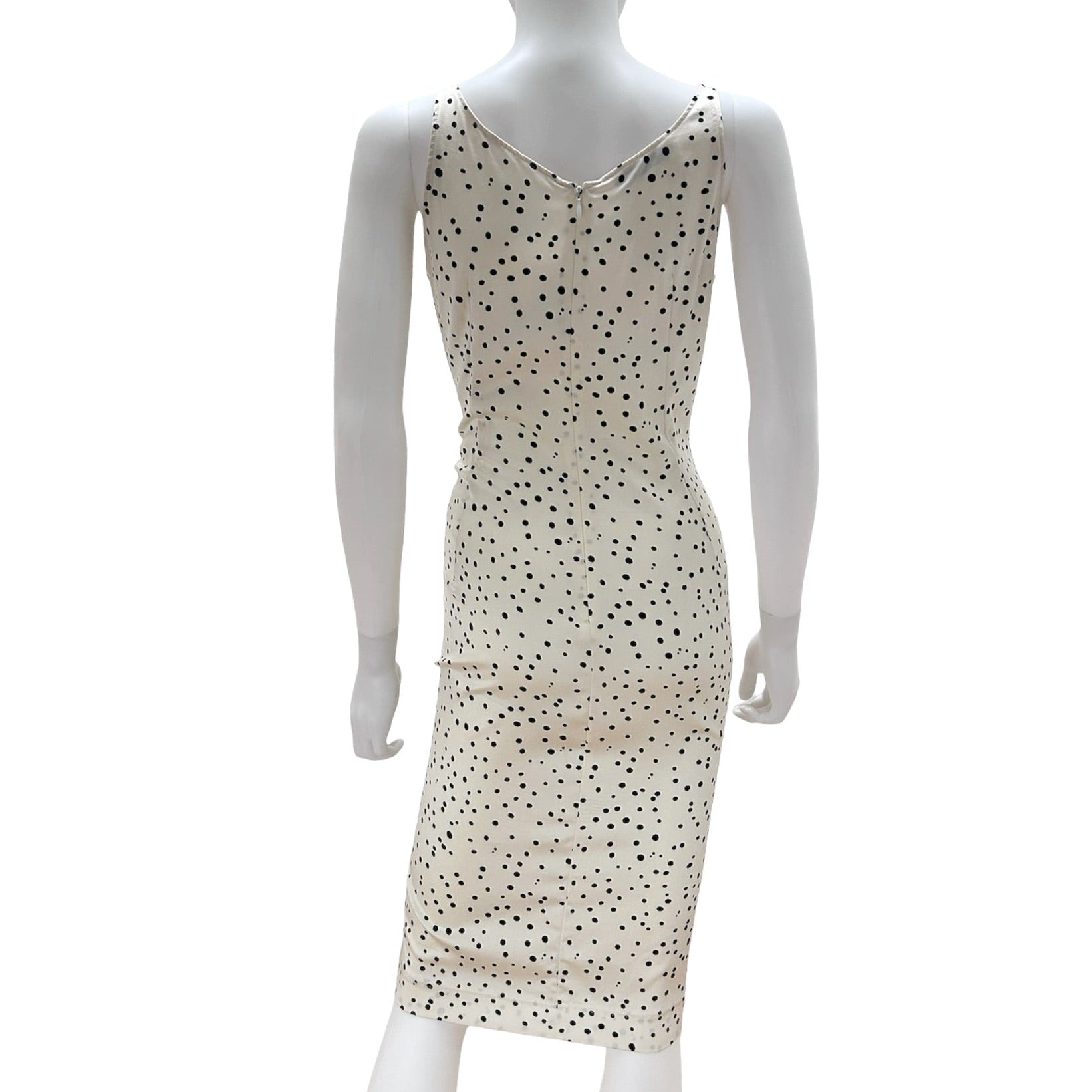 Description: Vintage Dolce and Gabbana off white sleeveless dress with black polka dot print throughout, v-neckline, and hook and eye/zipper closure at back