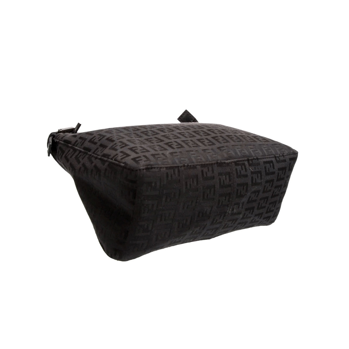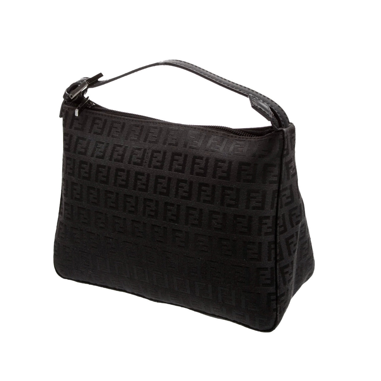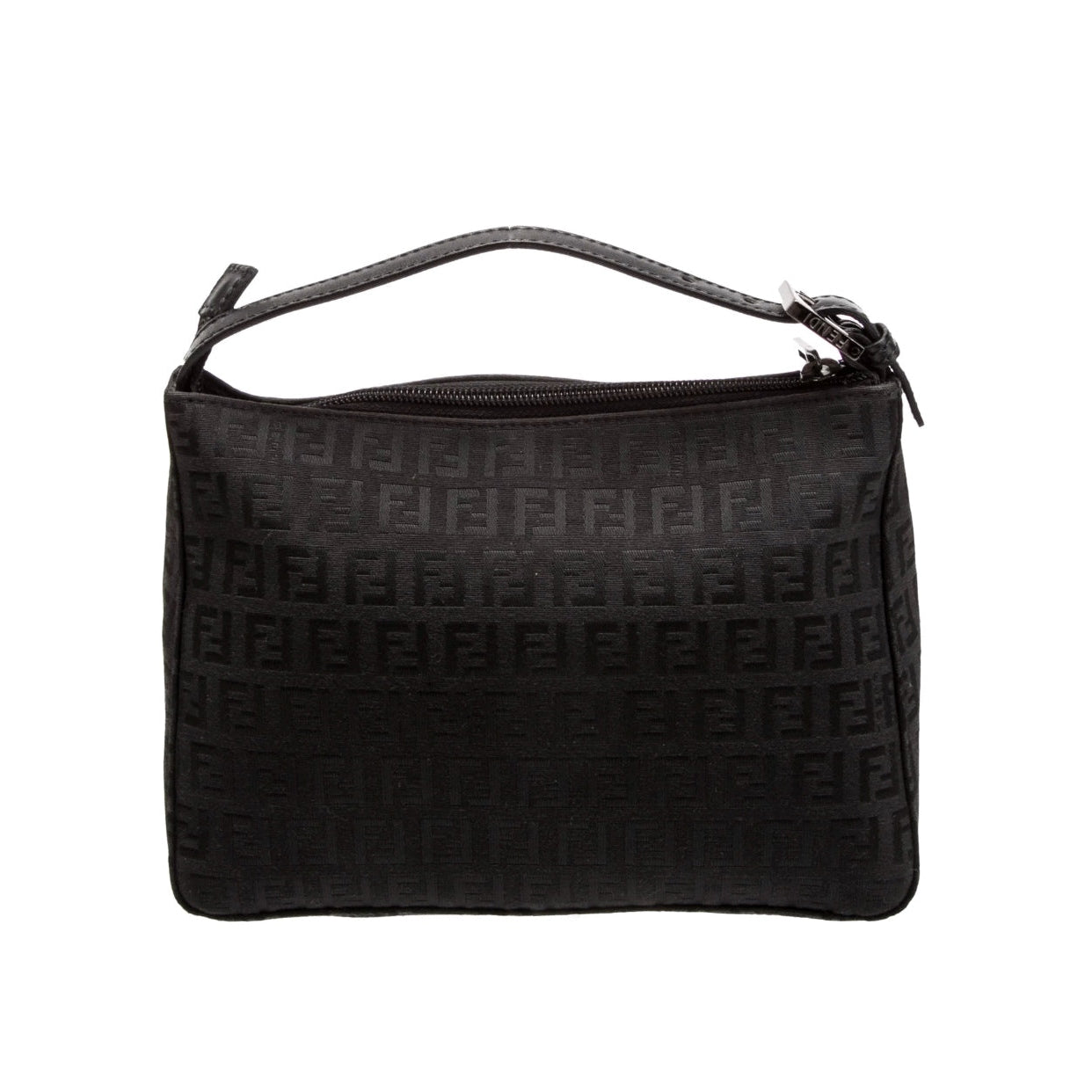 Description - Early 2000's top handle black Fendi Zucchino monogram print canvas mini hobo bag with single flat adjustable brown leather top handle, zip closure at top and gun metal hardware.