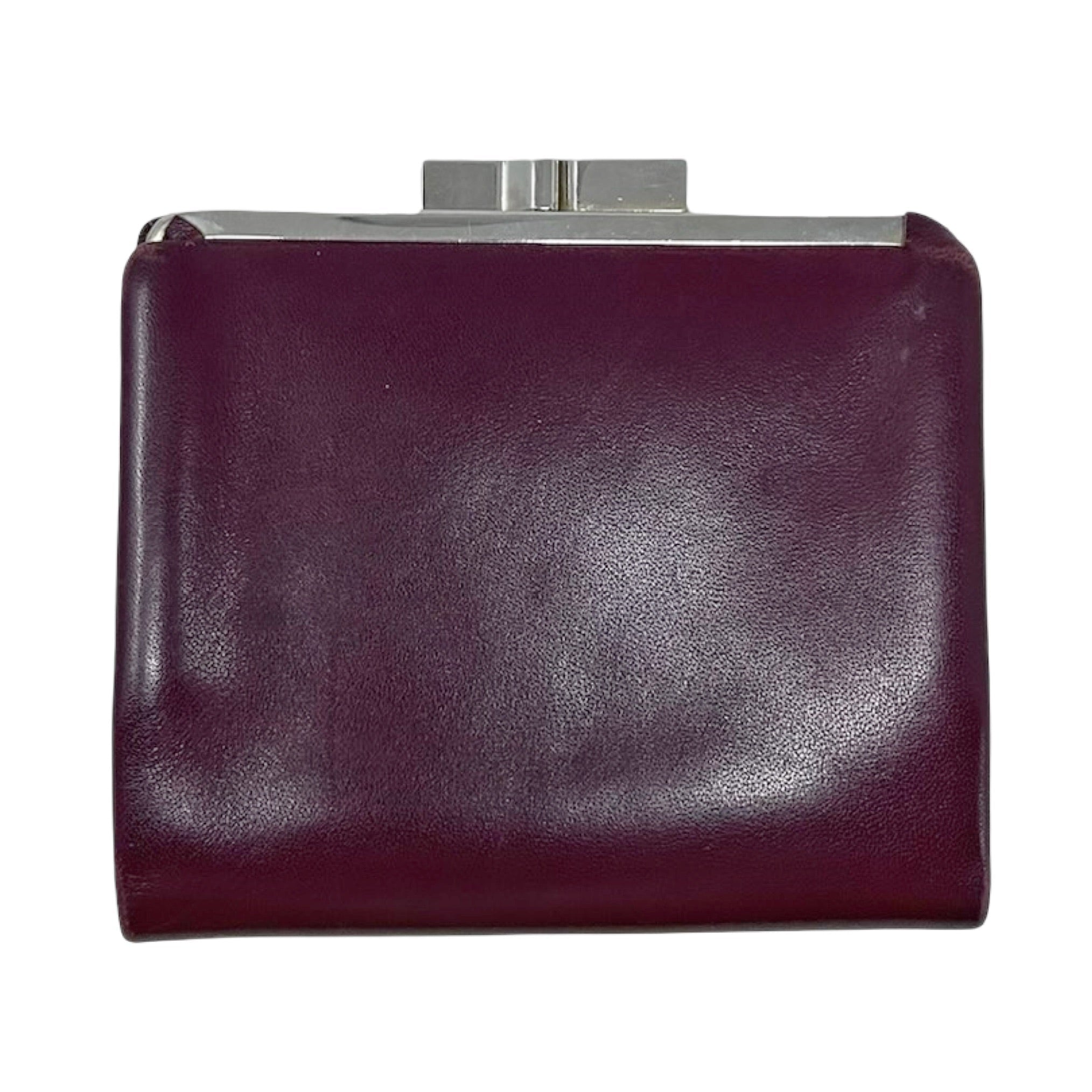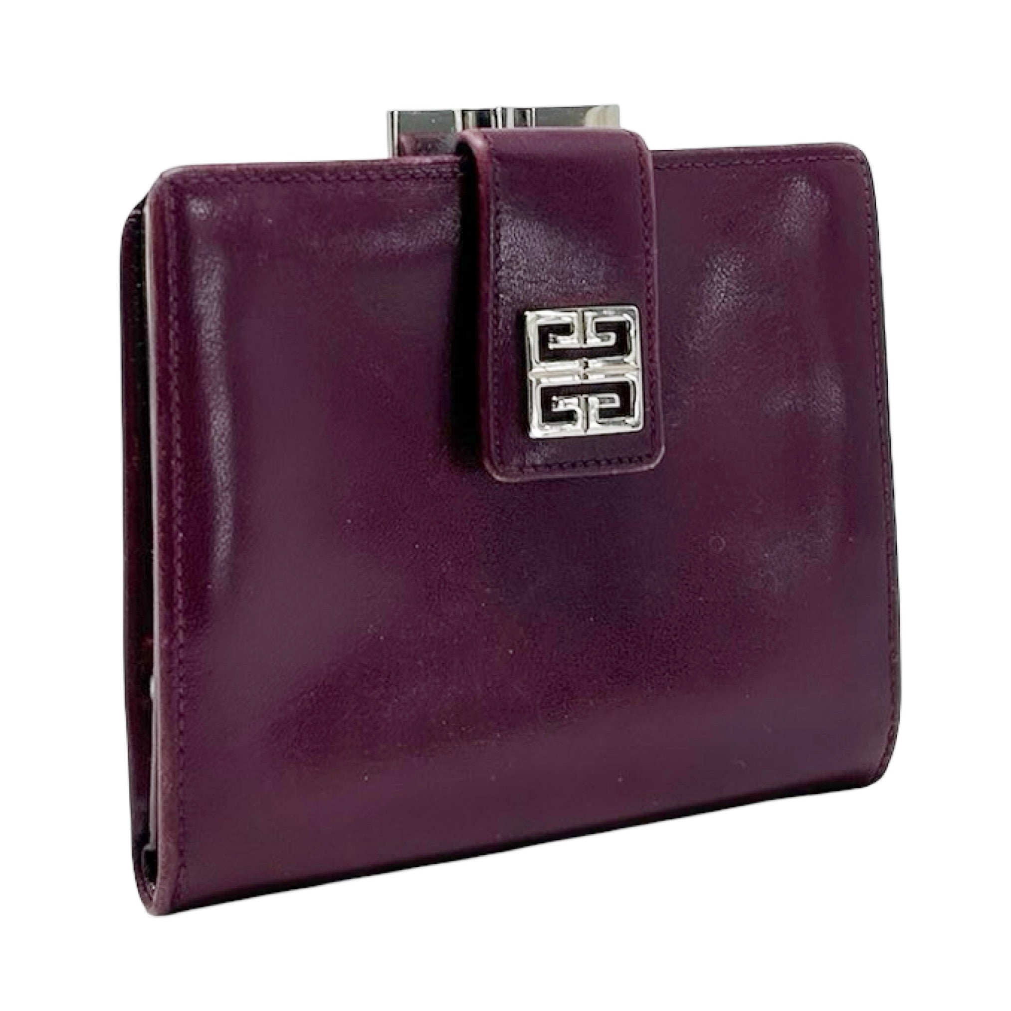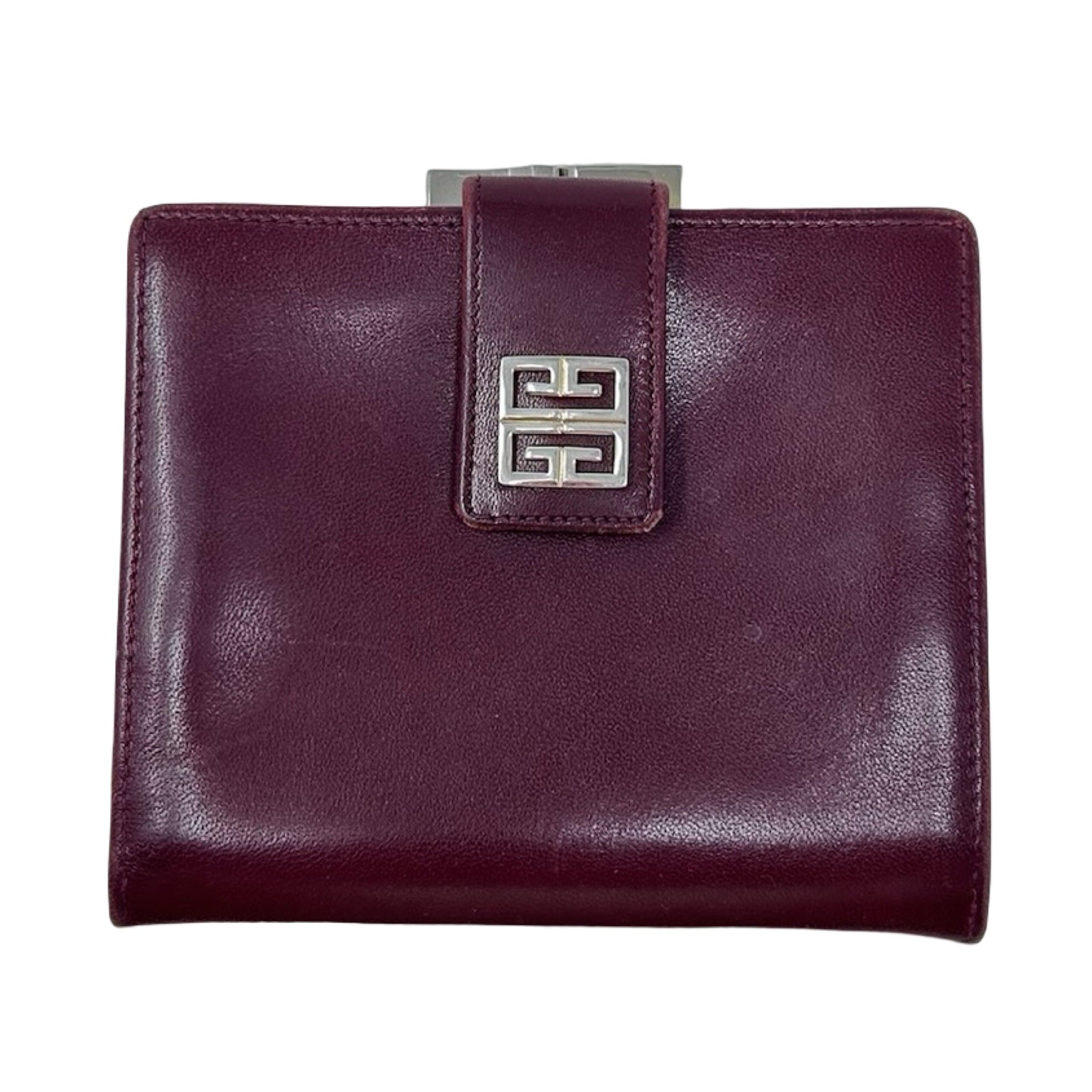 Description - Vintage burgundy leather Givenchy compact wallet with gold tone hardware, logo embossed at front. Snap closure at front with four card slots, and coin pouch at back with kiss lock closure.
