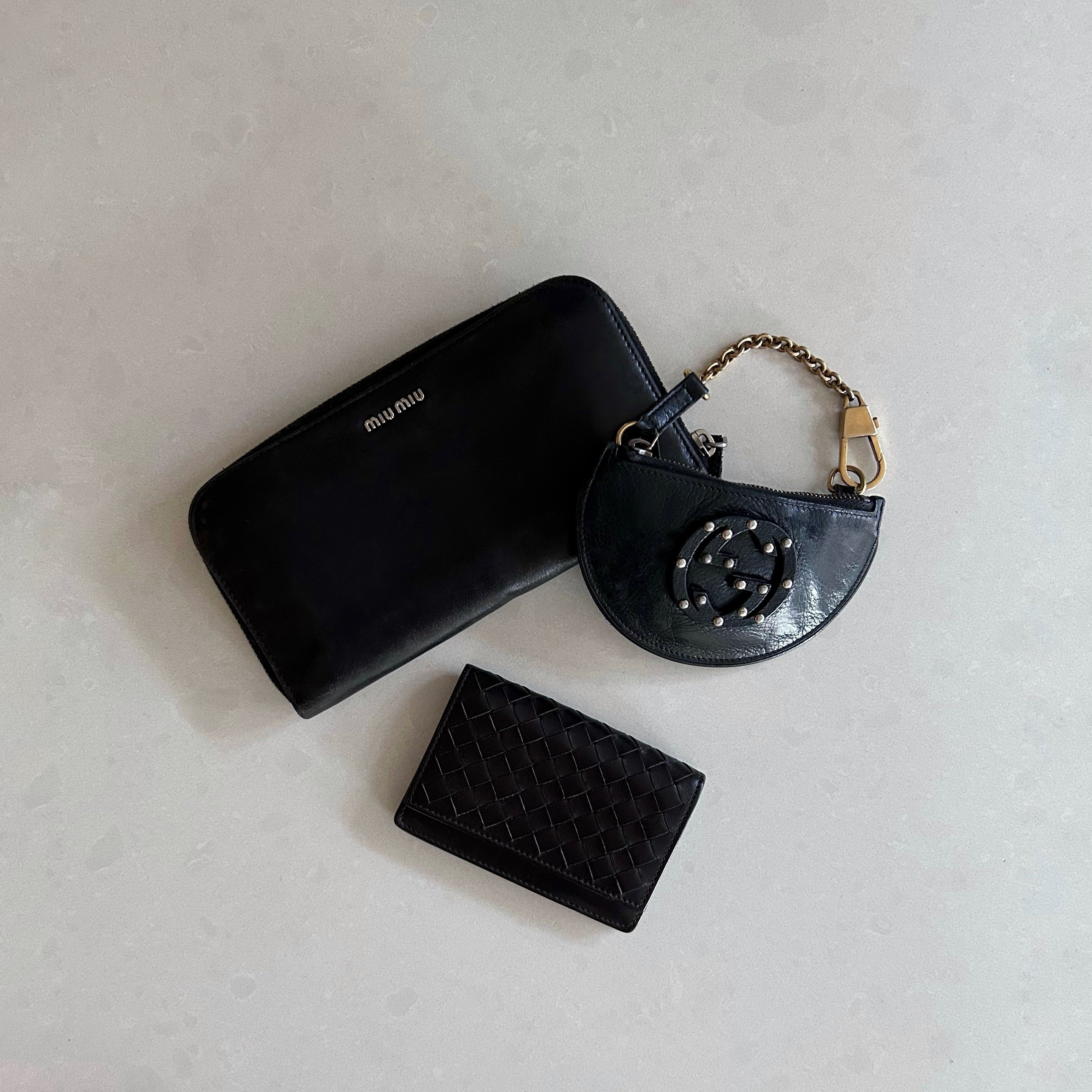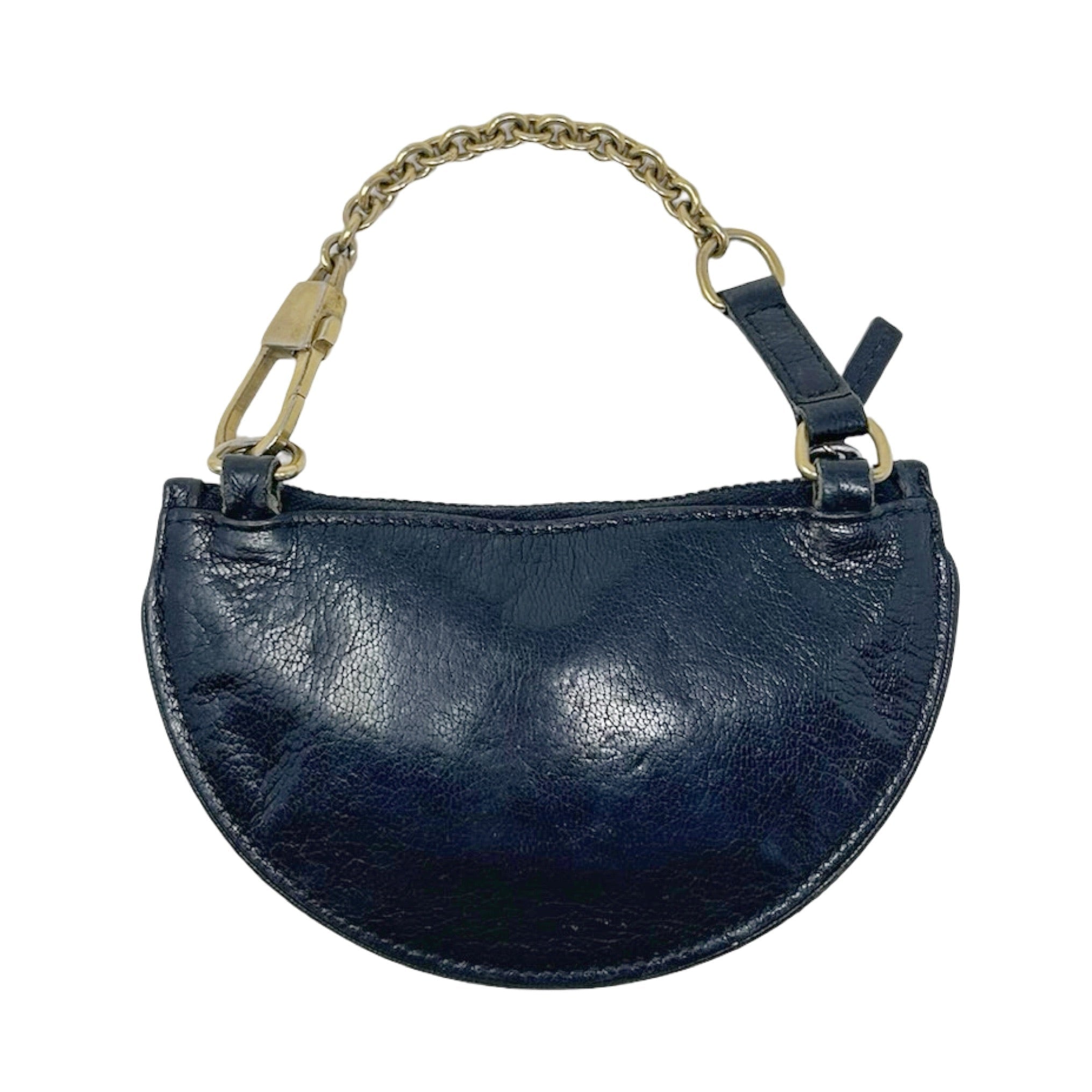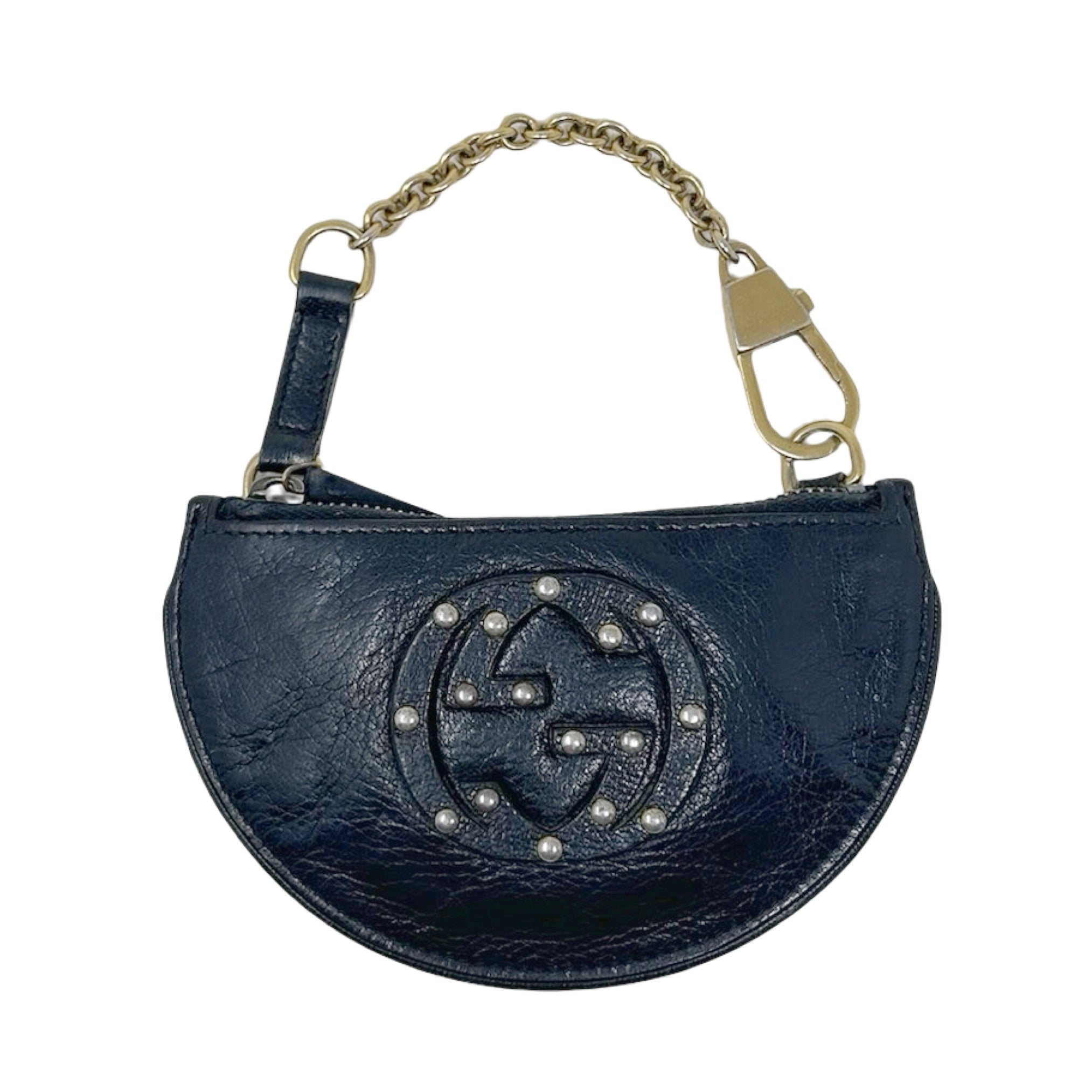 Description - Vintage black leather Gucci logo embellished micro top handle pochette bag with black leather trim, single chain top handle with clasp closure at one side (can be opened/closed), gold tone hardware, cotton lining and zip closure at top.