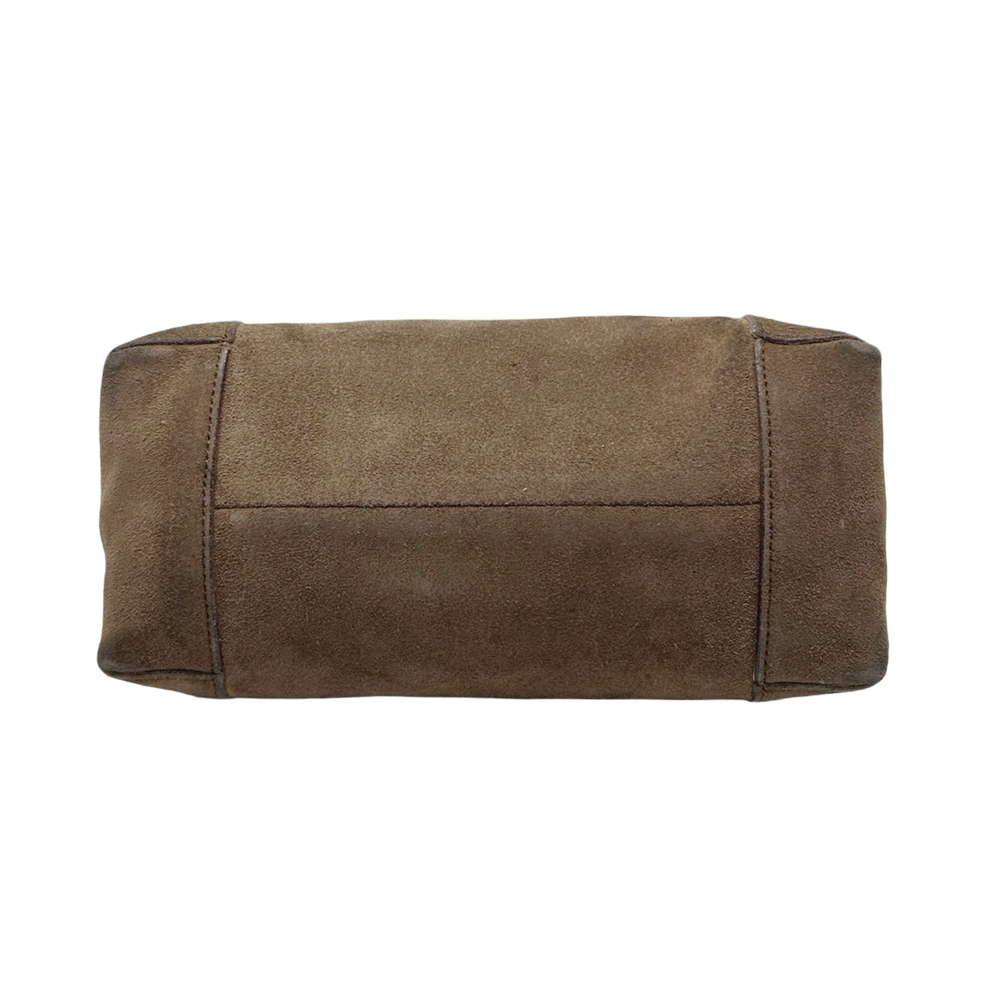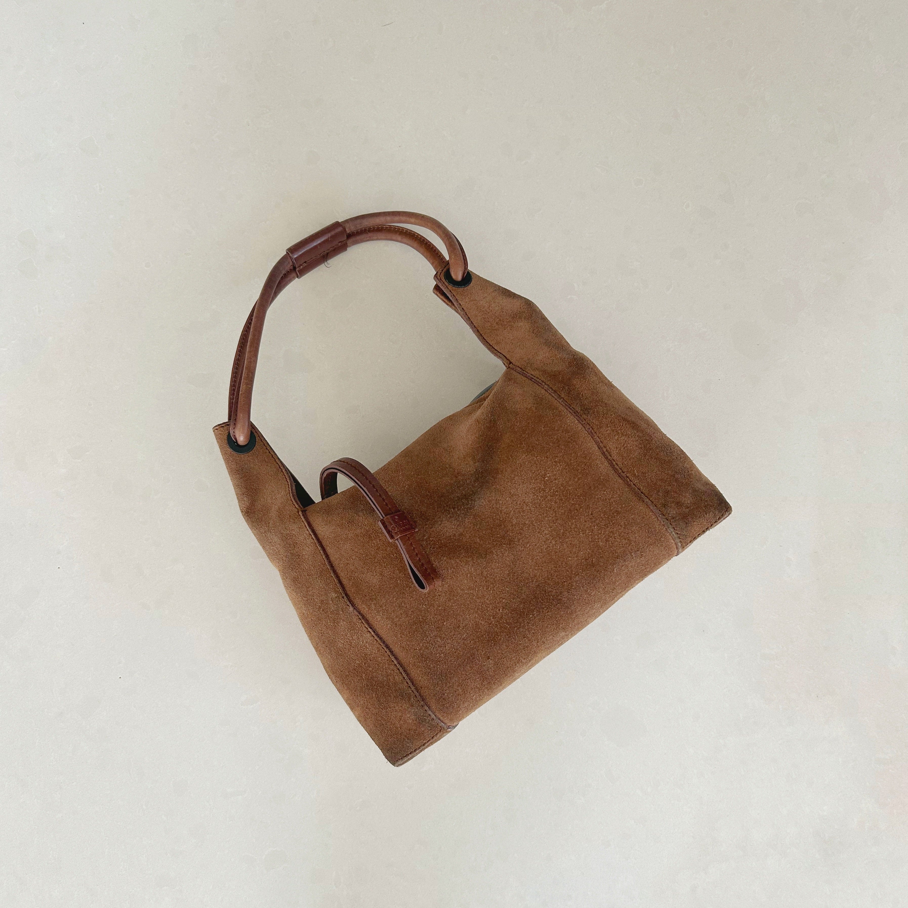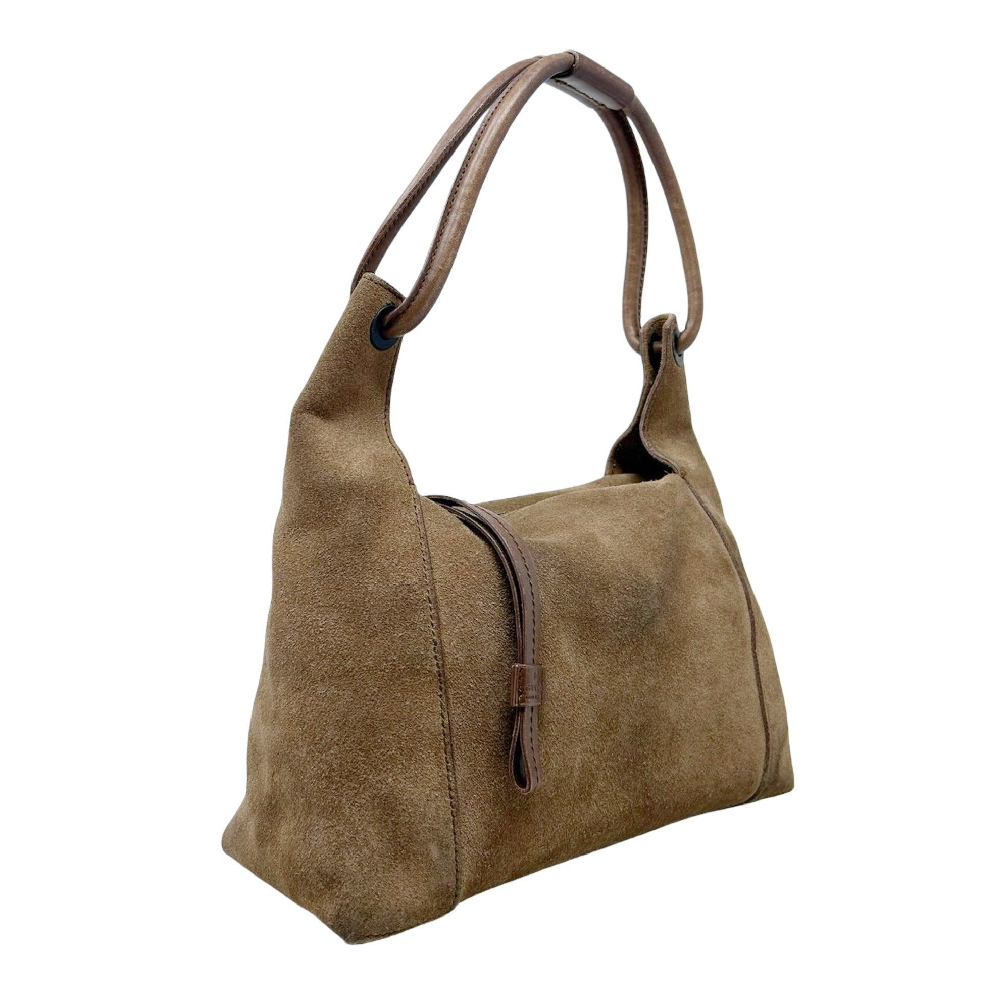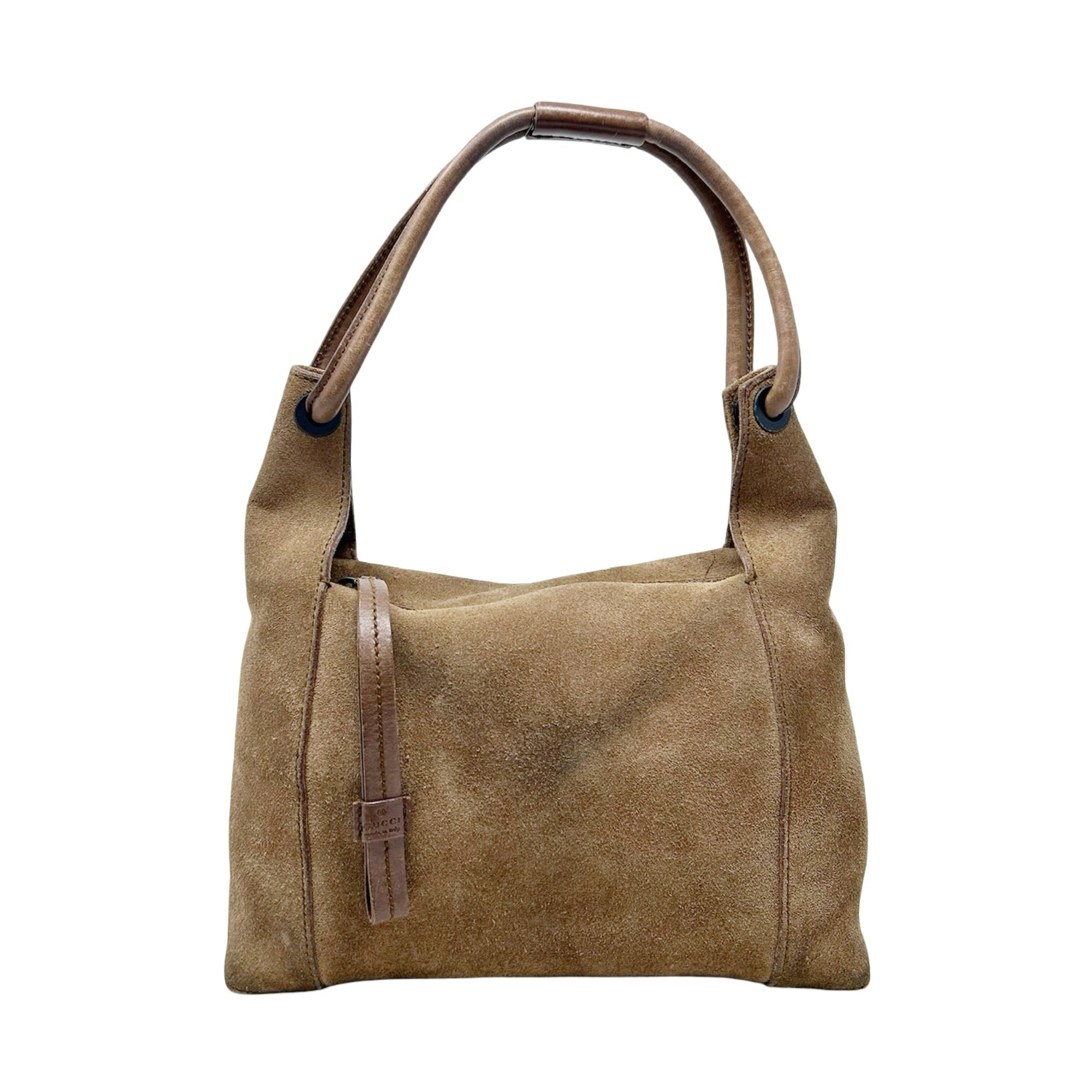 Description - Vintage Gucci brown suede hobo shoulder bag with brown leather trim, single rolled leather shoulder strap, tonal jacquard lining, single interior zip up pocket, gunmetal hardware, and zip closure at top.