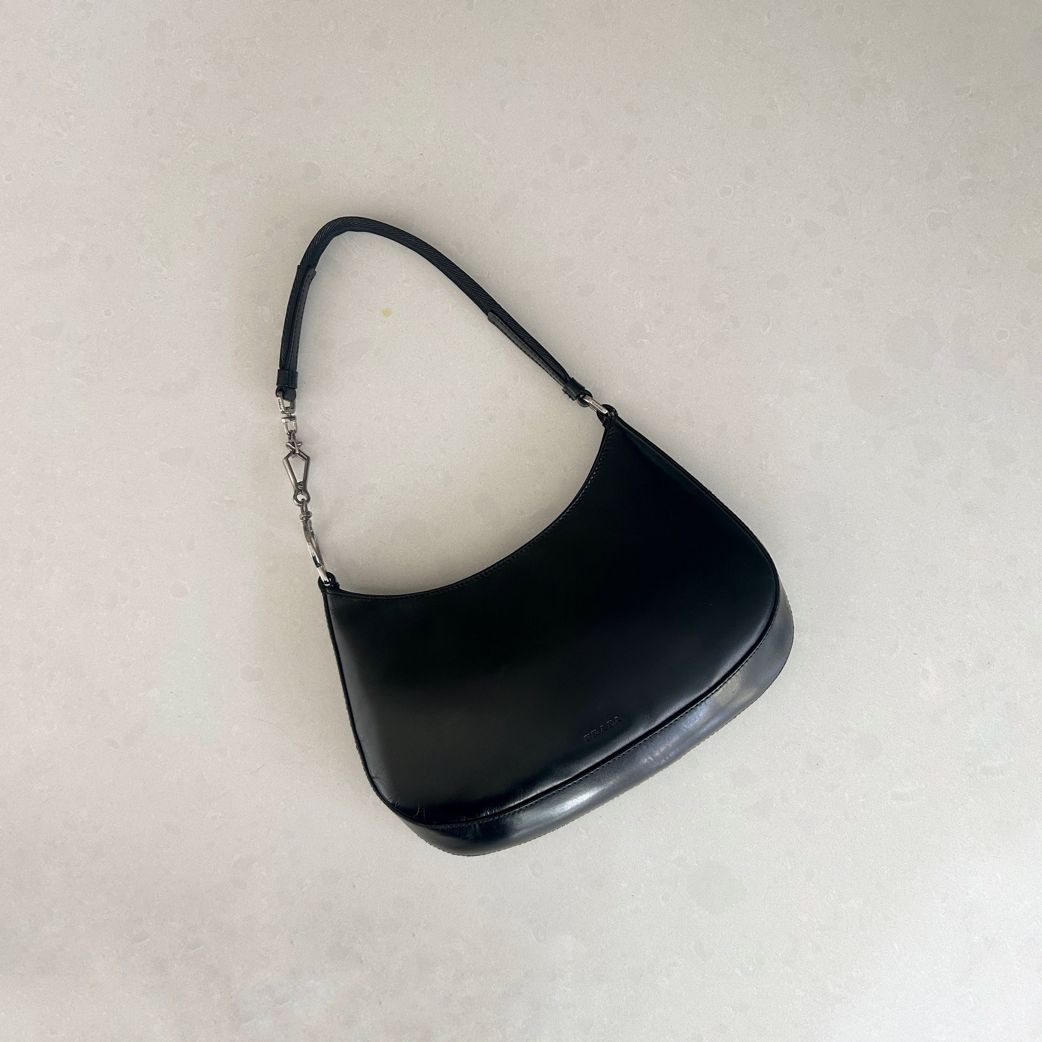 Description - Black Vitello leather Prada shoulder bag with silver-tone hardware, single flat canvas woven shoulder strap, tonal satin lining, single zip pocket at interior wall, and snap closure at top.