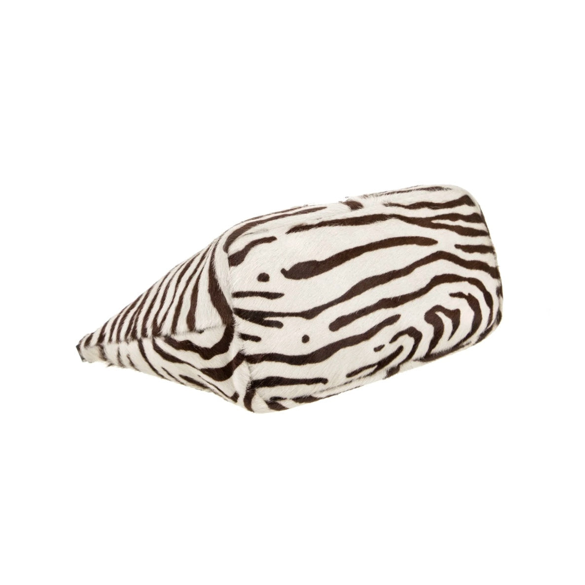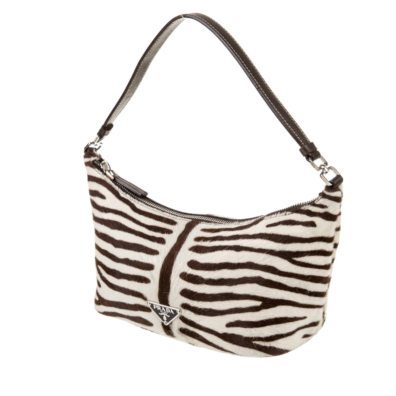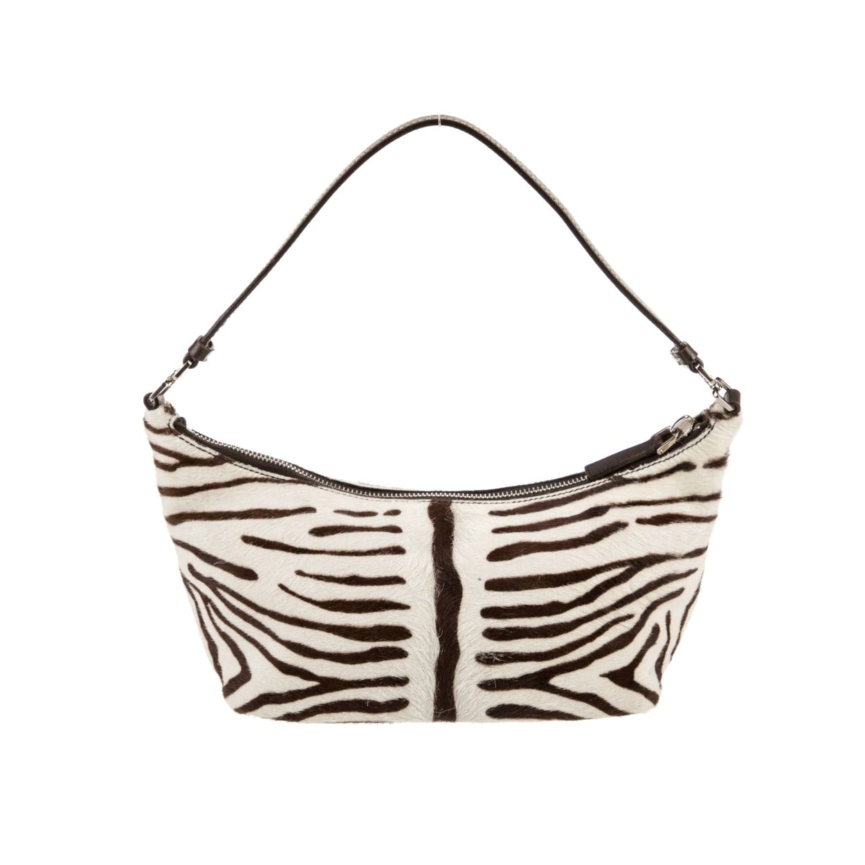 Description - Early 2000's brown/white Prada pony hair shoulder bag with animal print pattern throughout, silver tone hardware, metal logo plate at front, brown leather trim/embellishments throughout, single brown leather shoulder strap, zip closure at top and logo jacquard lining with single interior pocket.