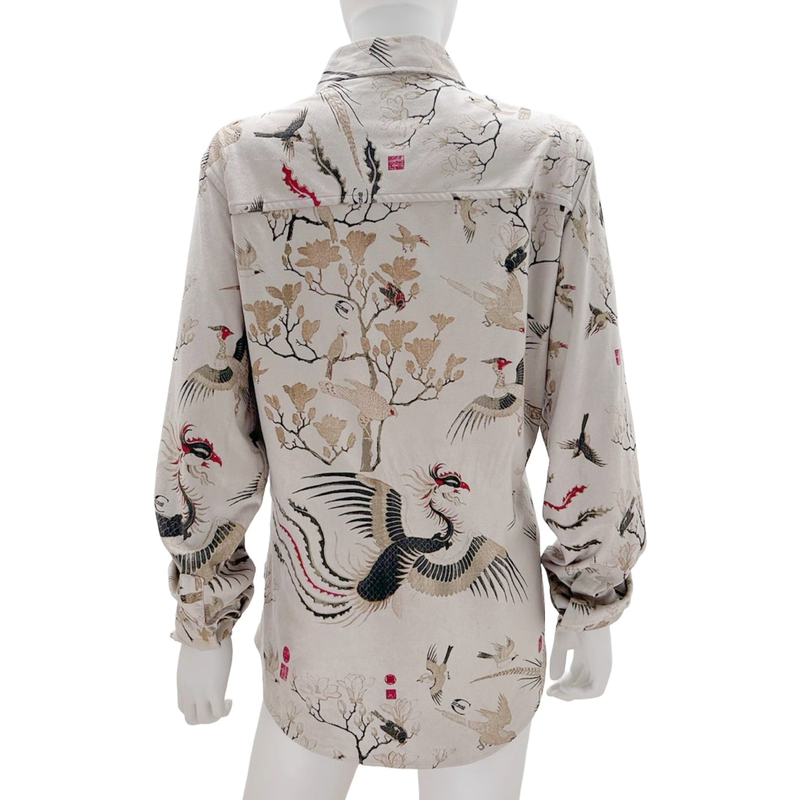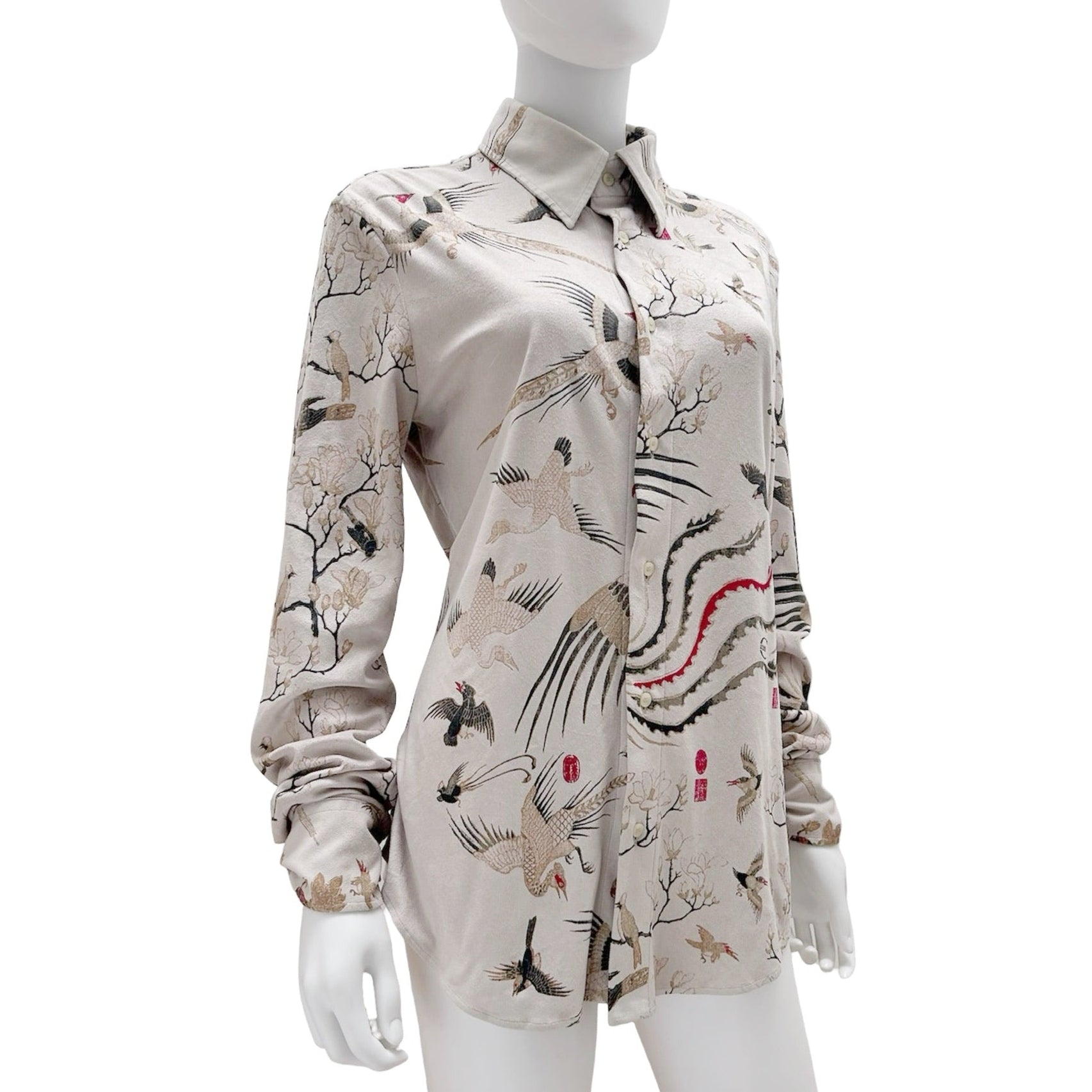 Description - Vintage neutral colour Roberto Cavalli button up long sleeve shirt with pointed collar, multicolour graphic print pattern throughout and button up closure at front.