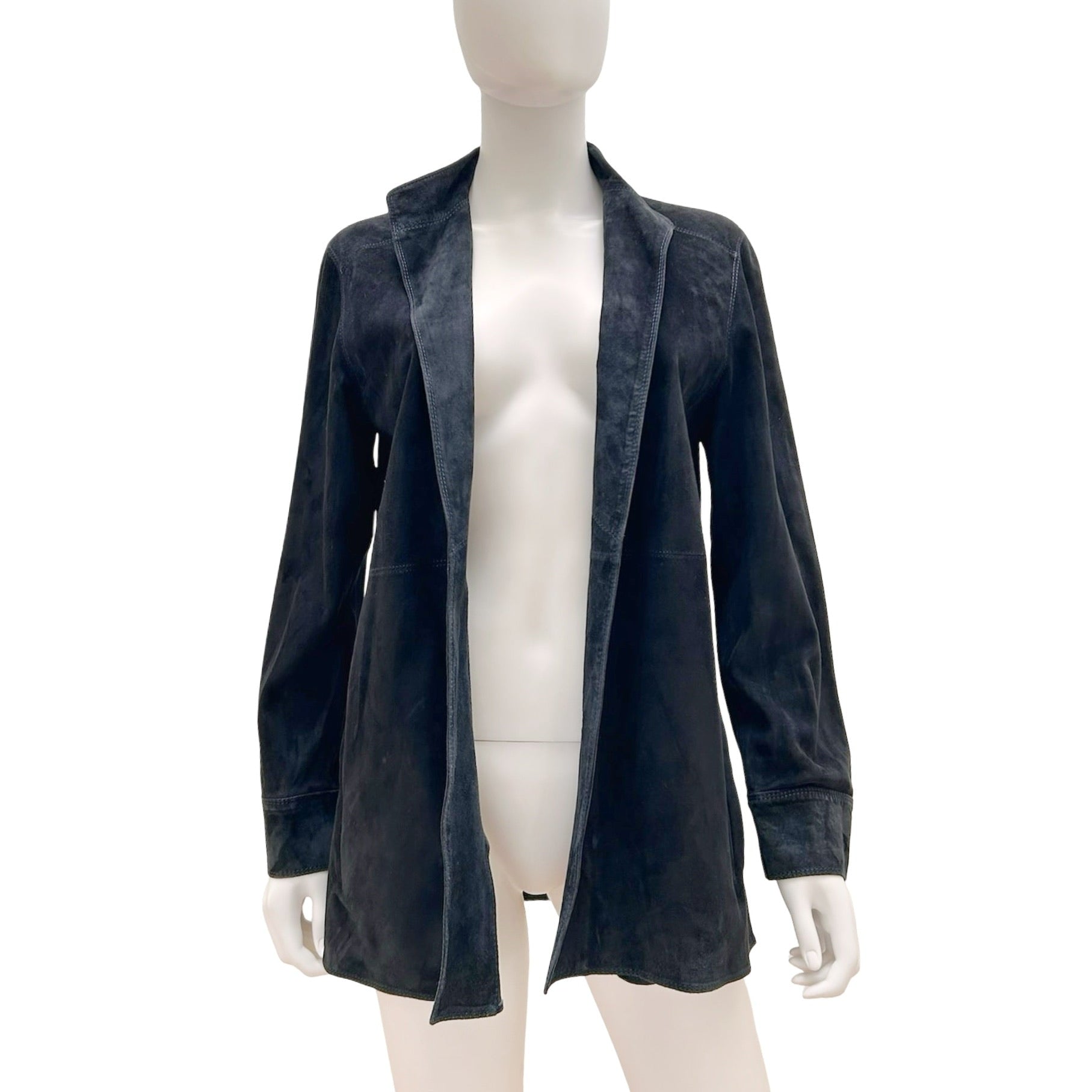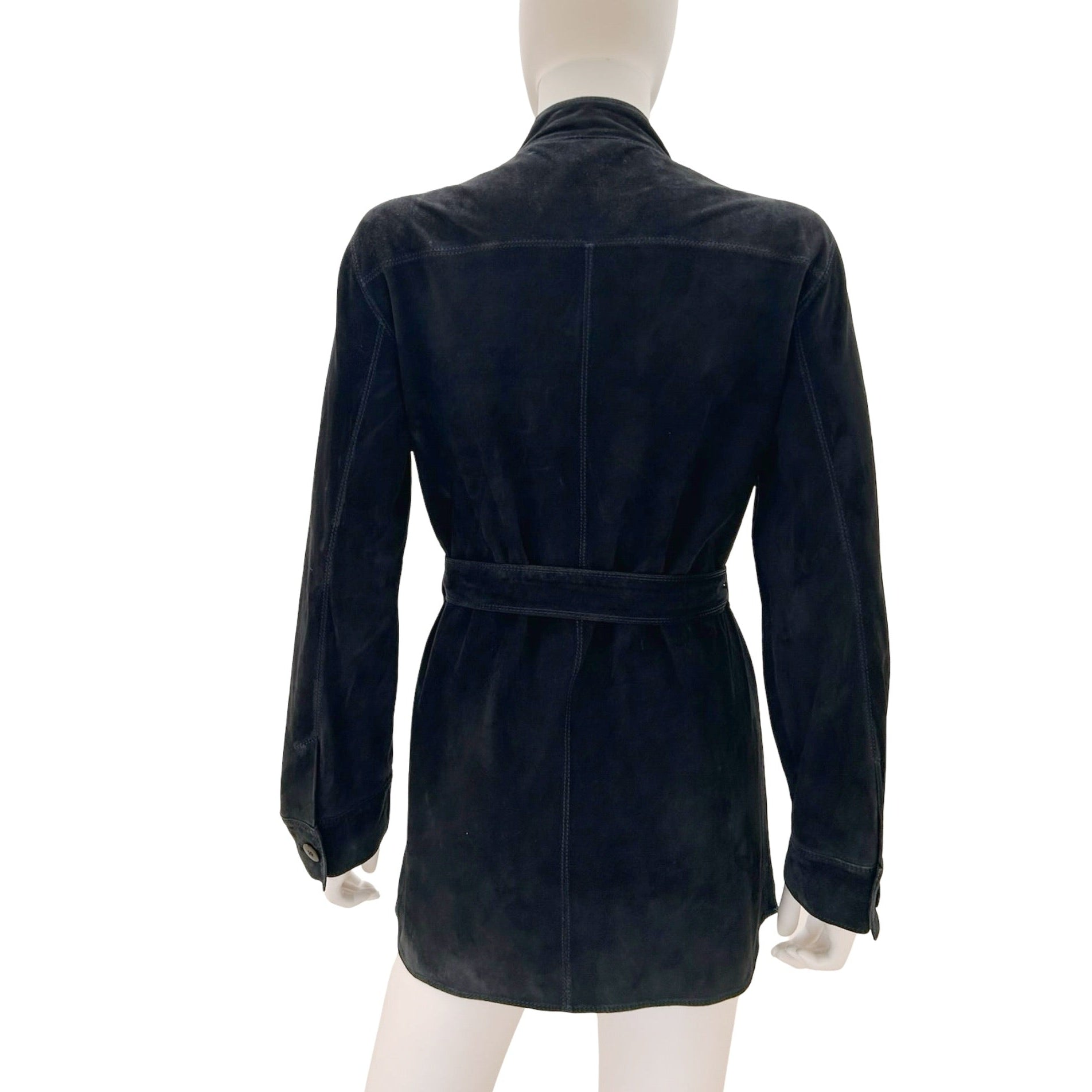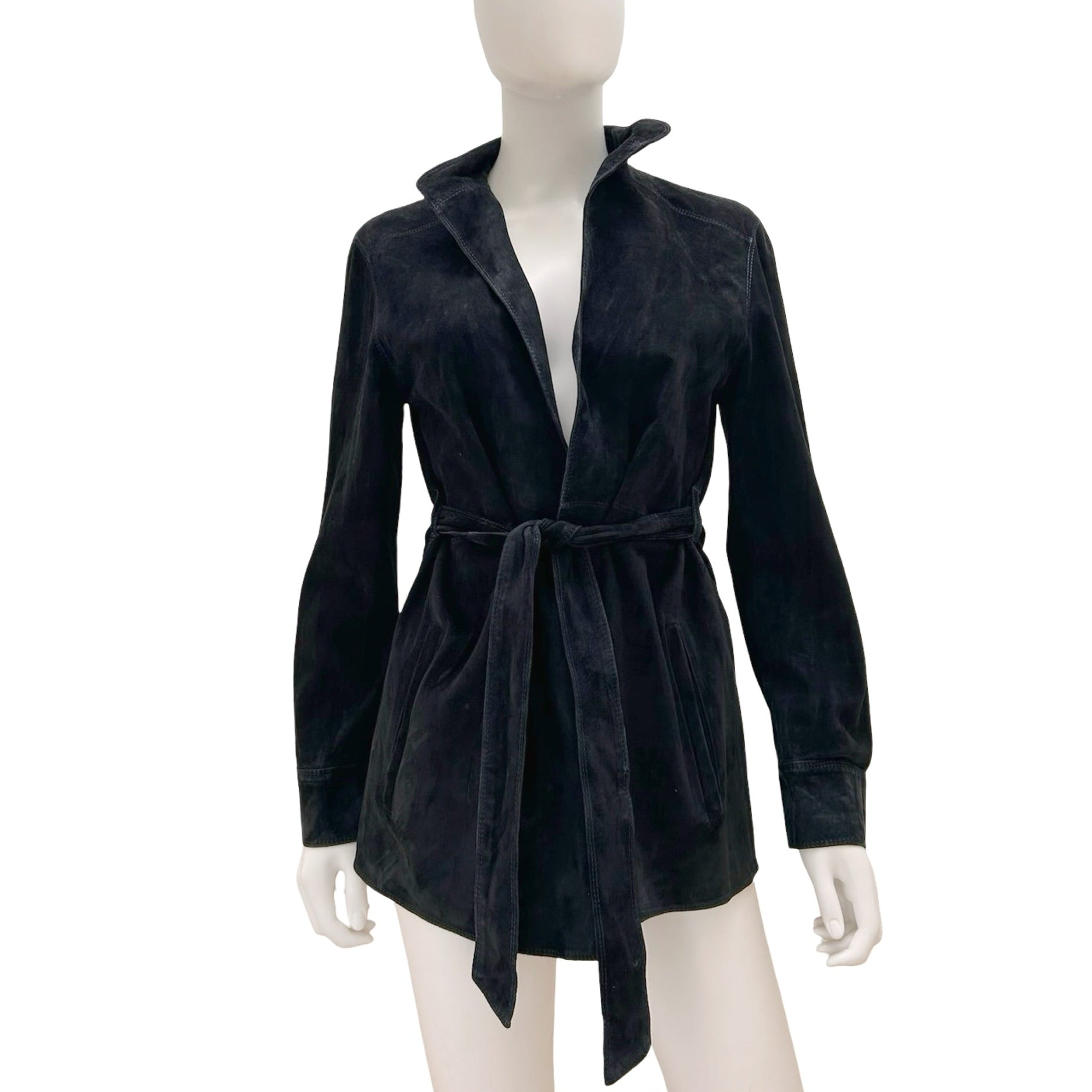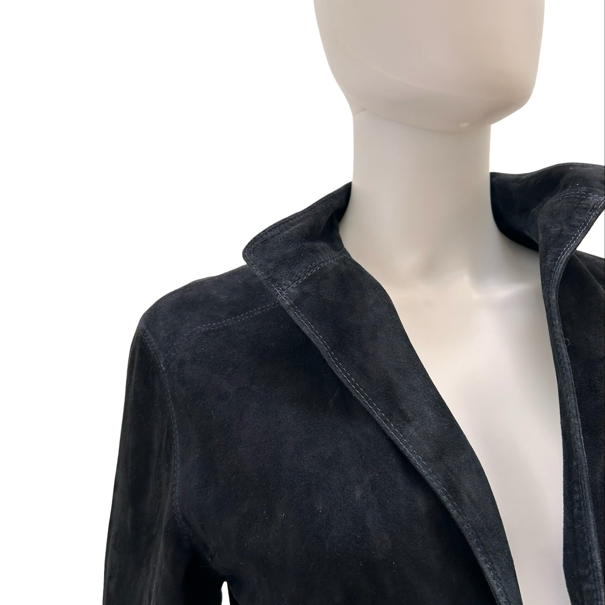 Description - Vintage black suede Armani Collezioni jacket with stand collar, open front, dual slip pockets at sides, dark blue stitching throughout and detachable tie belt at waist.