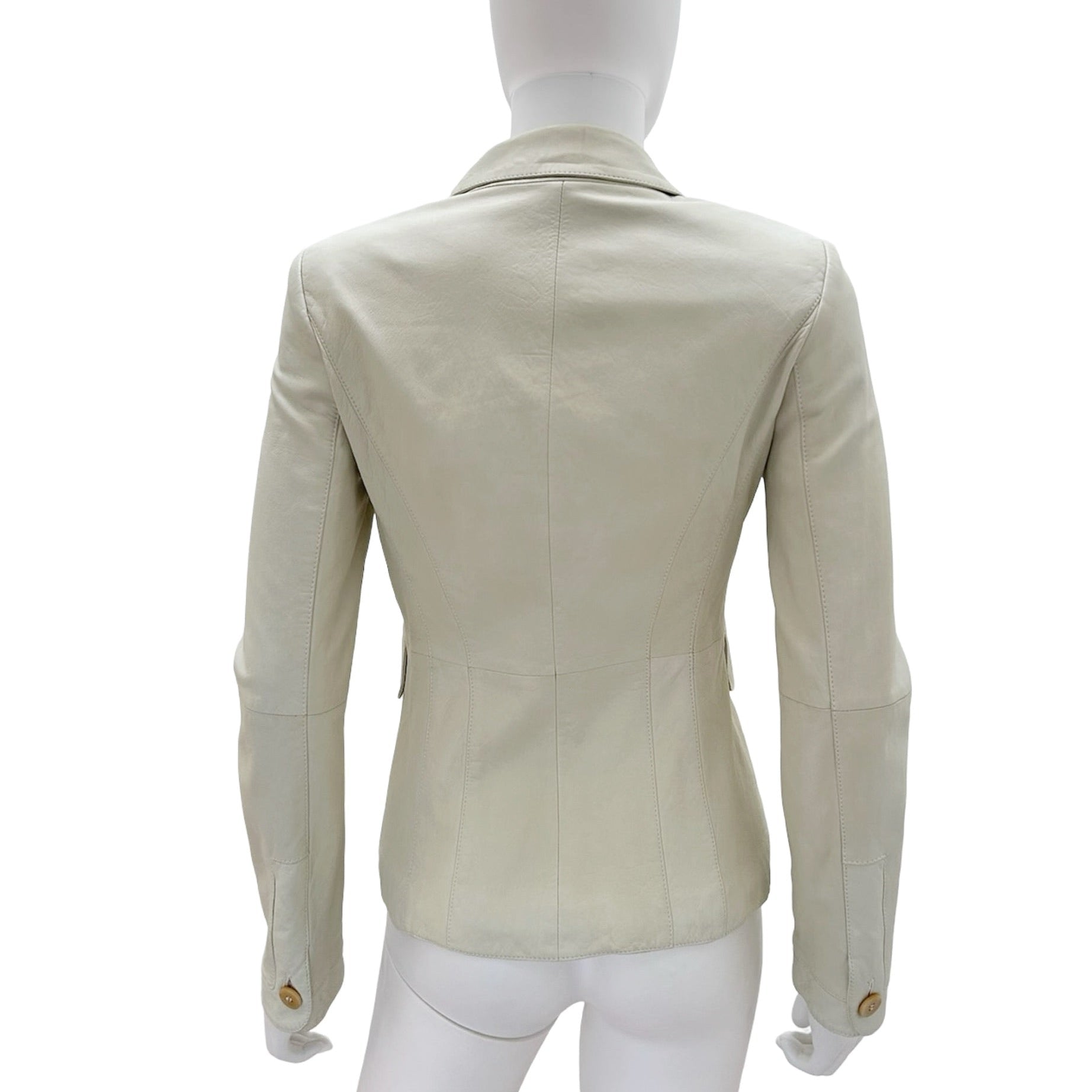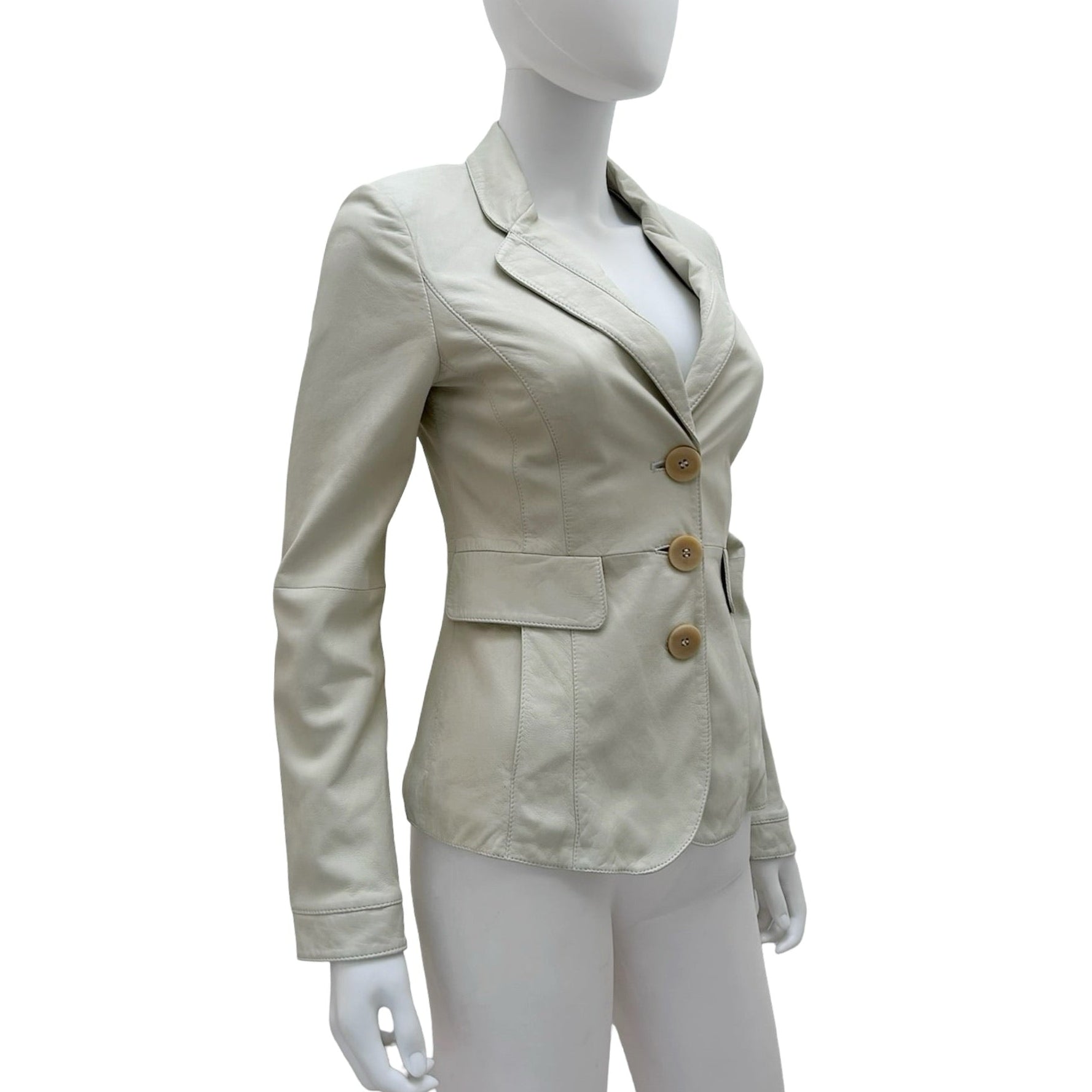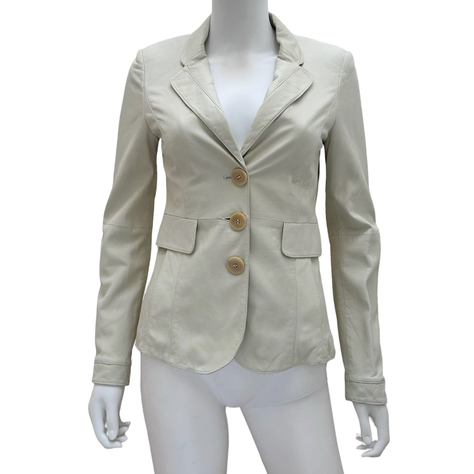 Description - Vintage neutral Armani Collezioni leather jacket with button up closure at front, dual pockets at sides, pointed collar, neutral leather stitching throughout and button detail on sleeves.