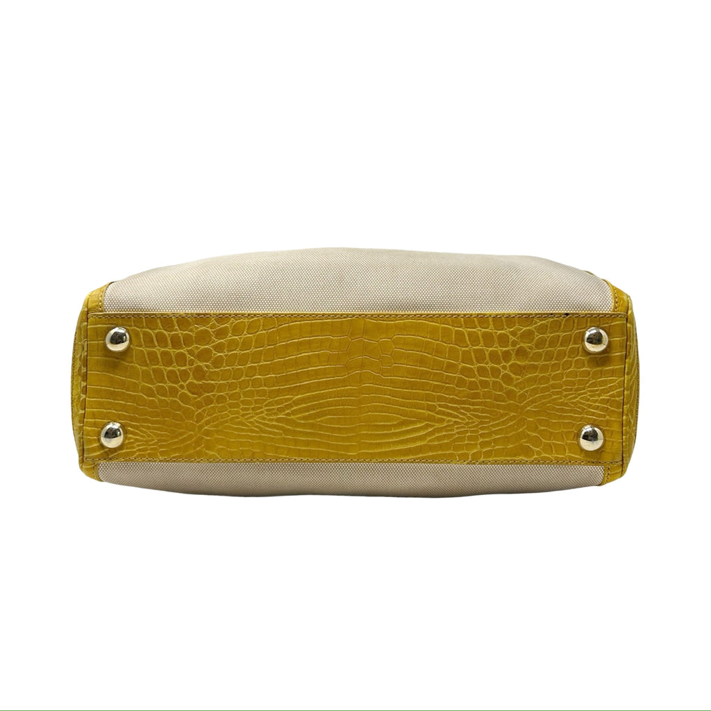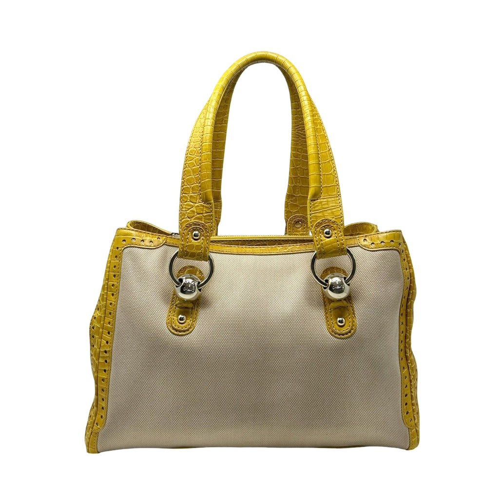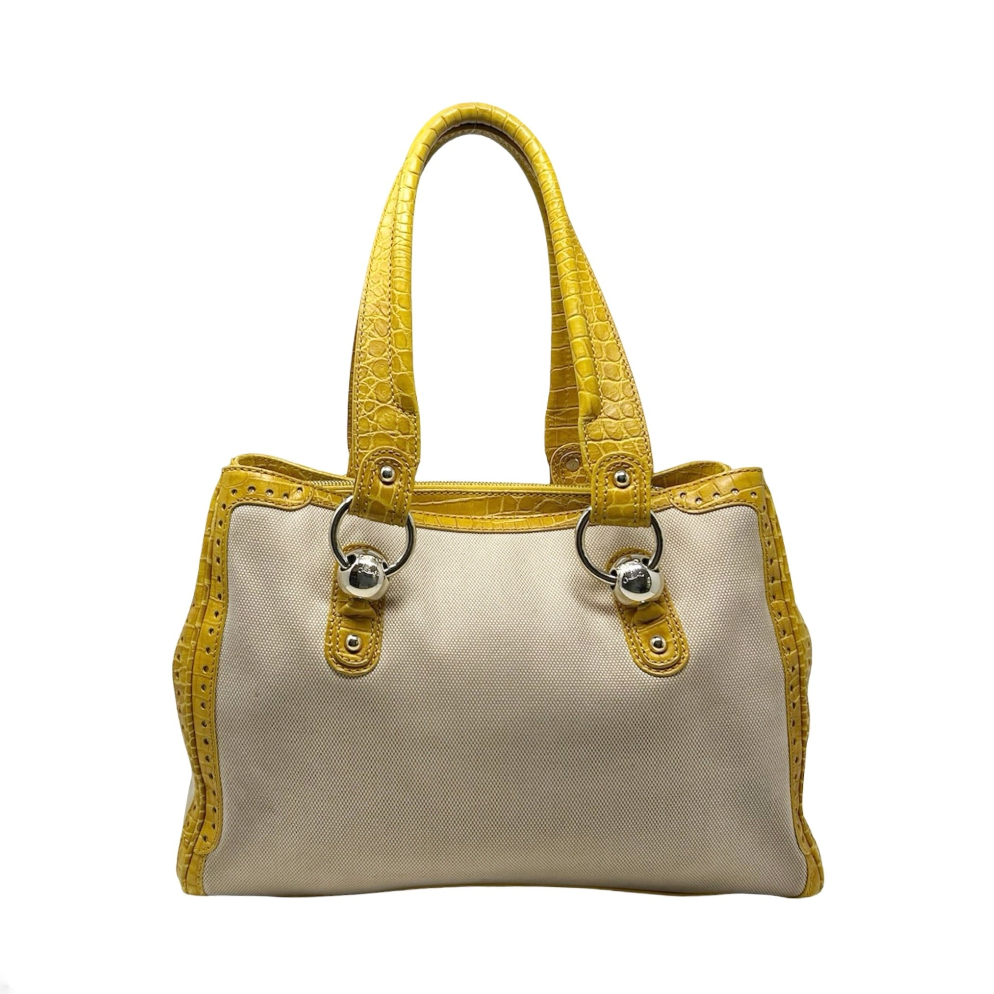 Description - Vintage Celine tote bag in neutral canvas with yellow crocodile embossed trim, silver tone hardware, dual rolled leather shoulder straps with logo embossed hardware embellishments, dual open top compartments, single zip closure compartment, one interior zip pocket, two interior slip pockets.zip closure at top, and tonal jacquard lining.