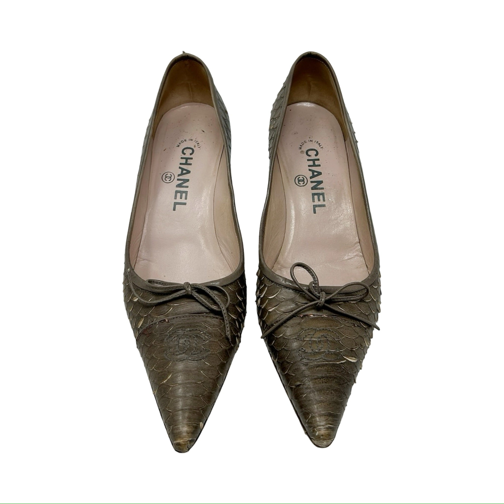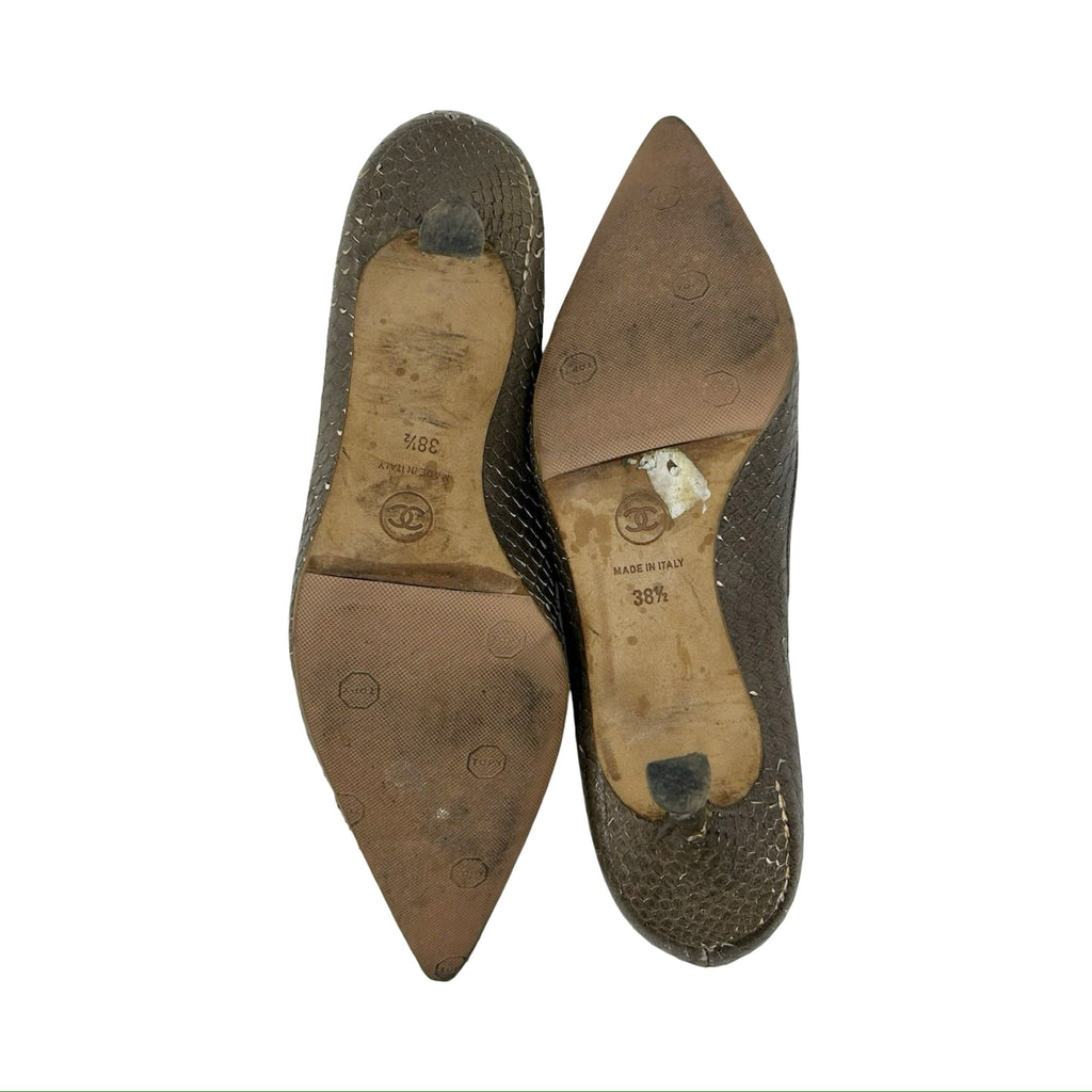 Description - Late 1990's taupe snakeskin/leather Chanel pointed toe pumps with covered heels, CC logo at toes with bow detail.