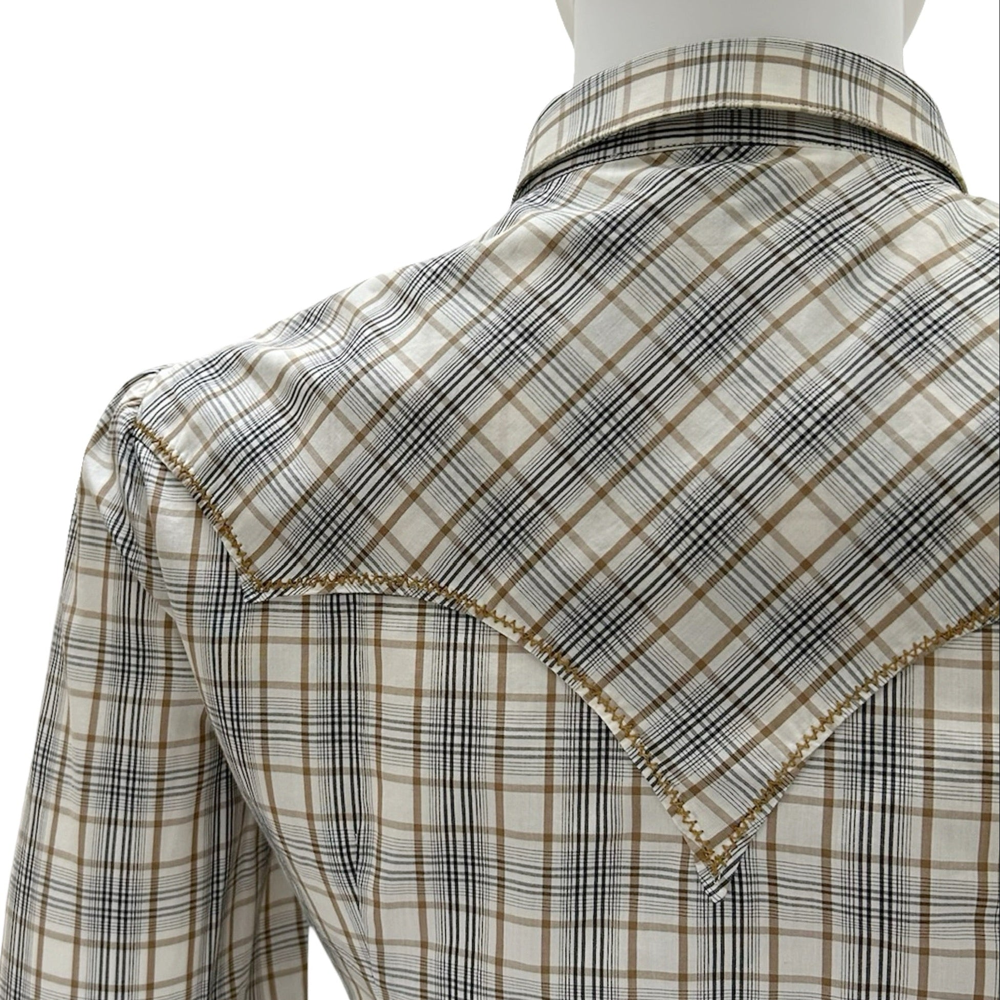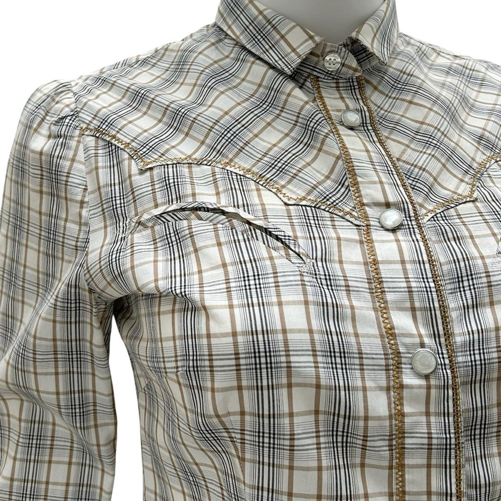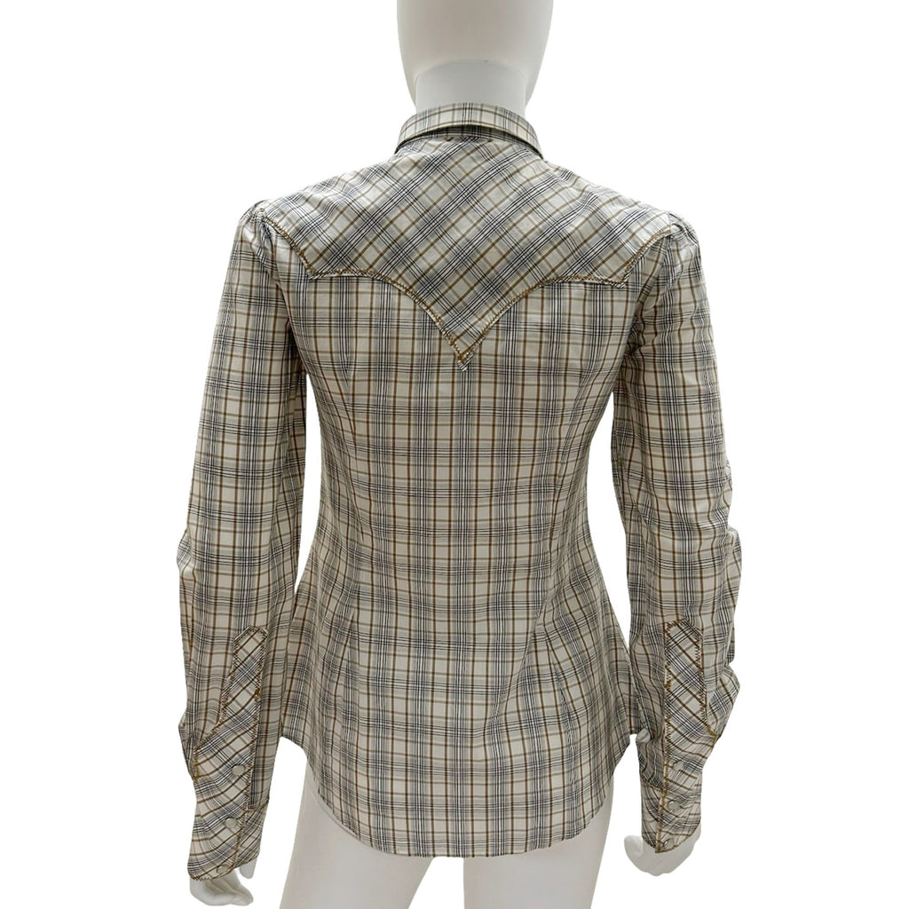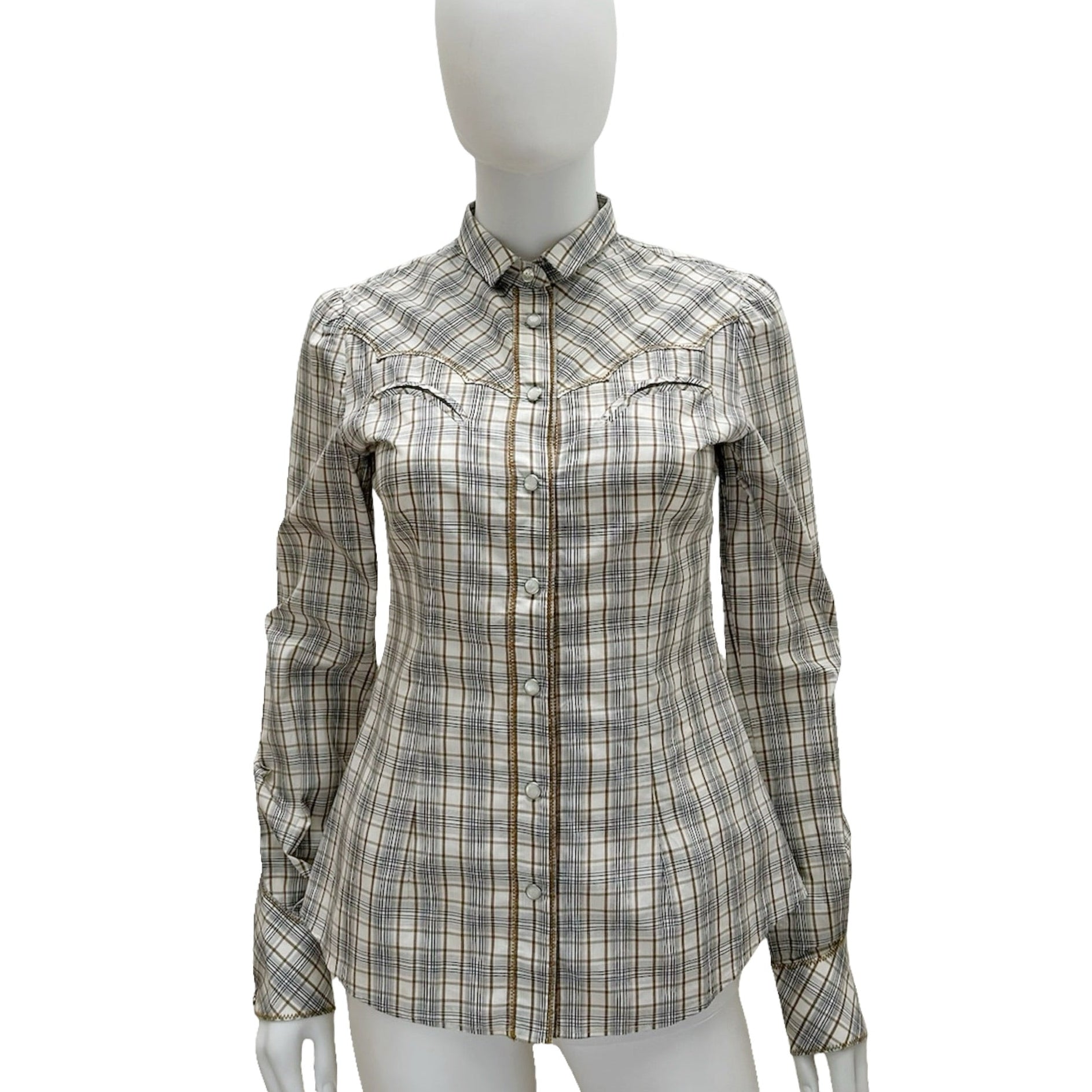 Description - 2000's Dolce and Gabbana plaid cotton long sleeve tailored western style shirt with contrasting whipstitch trim throughout, western yoke, and pearl snap button closure up front.