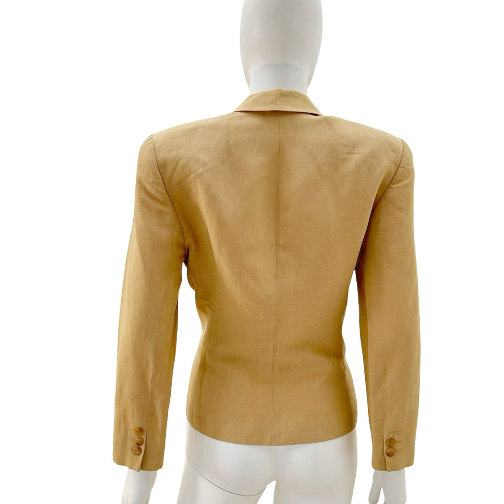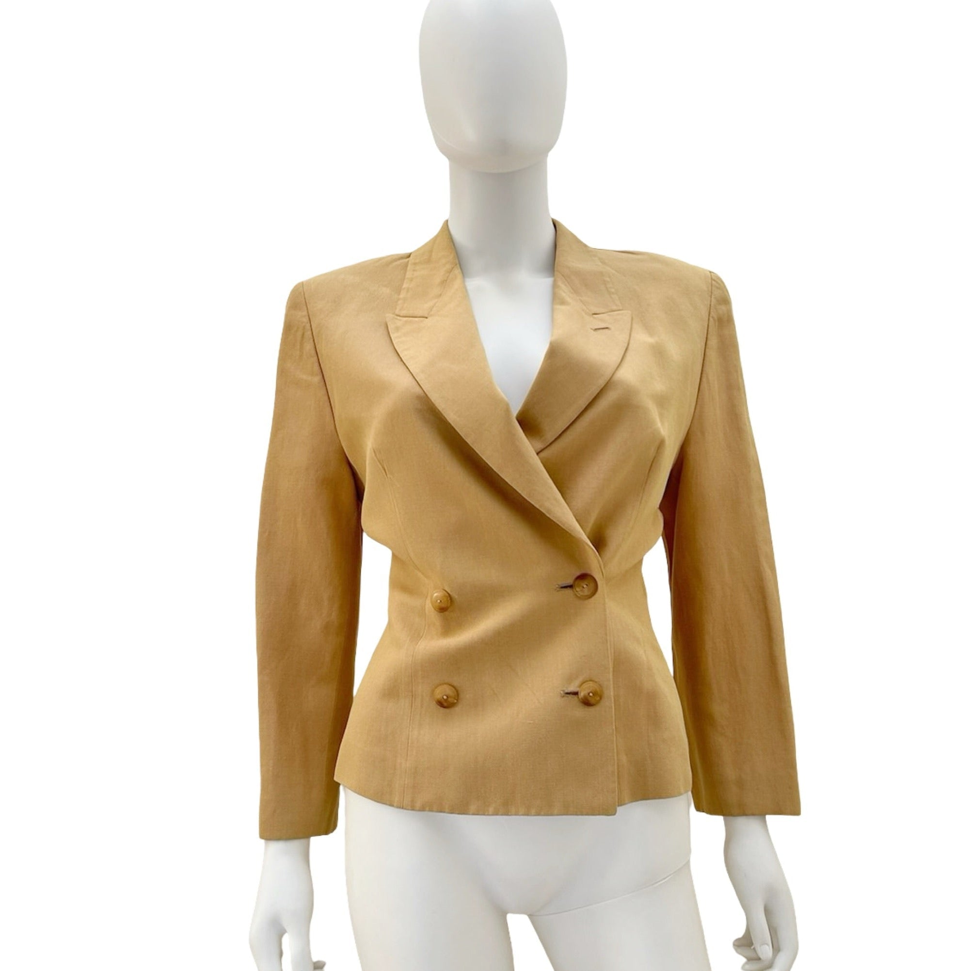 Description - Emporio Armani tan vintage double breasted blazer with structured shoulders, pointed collar and button up closure at front.