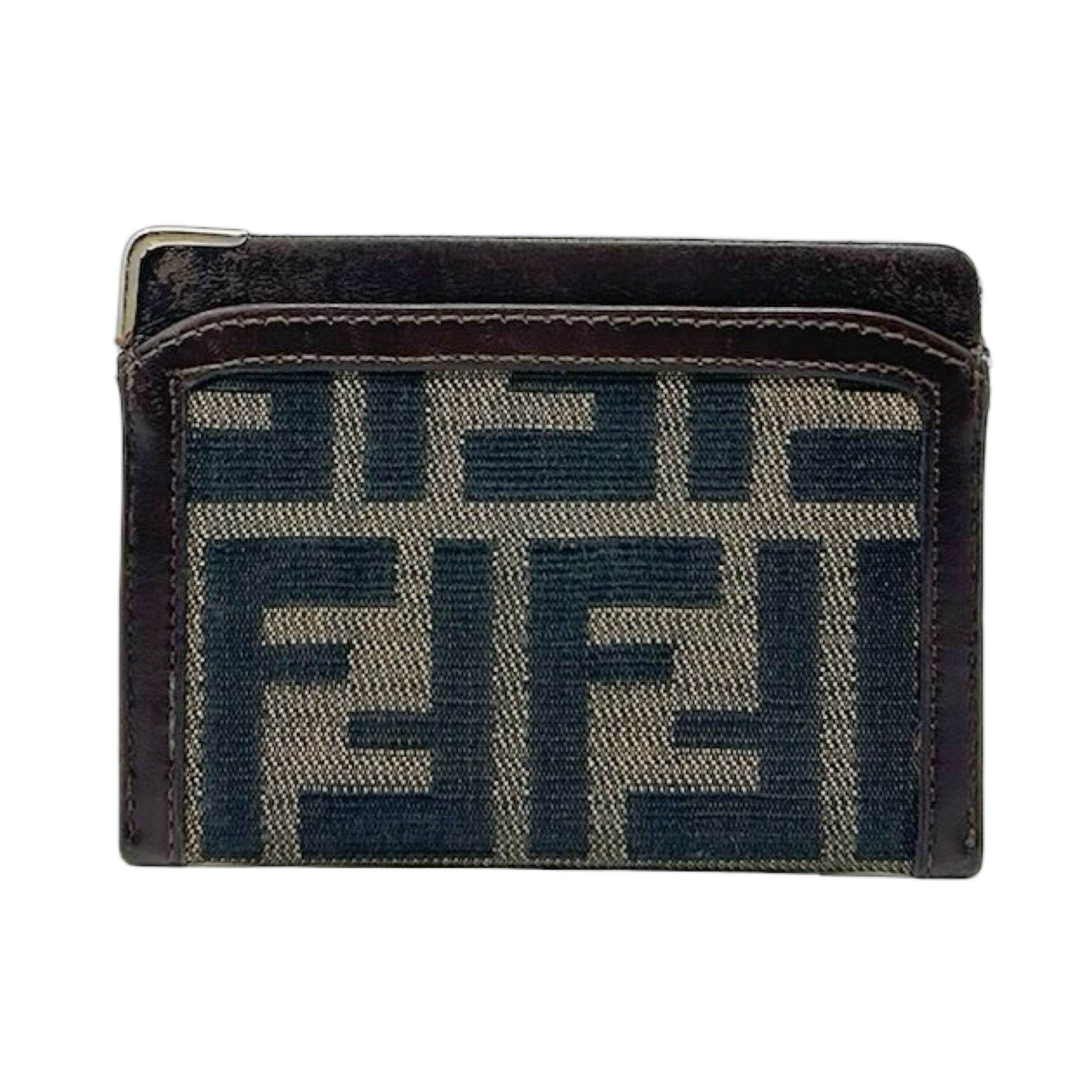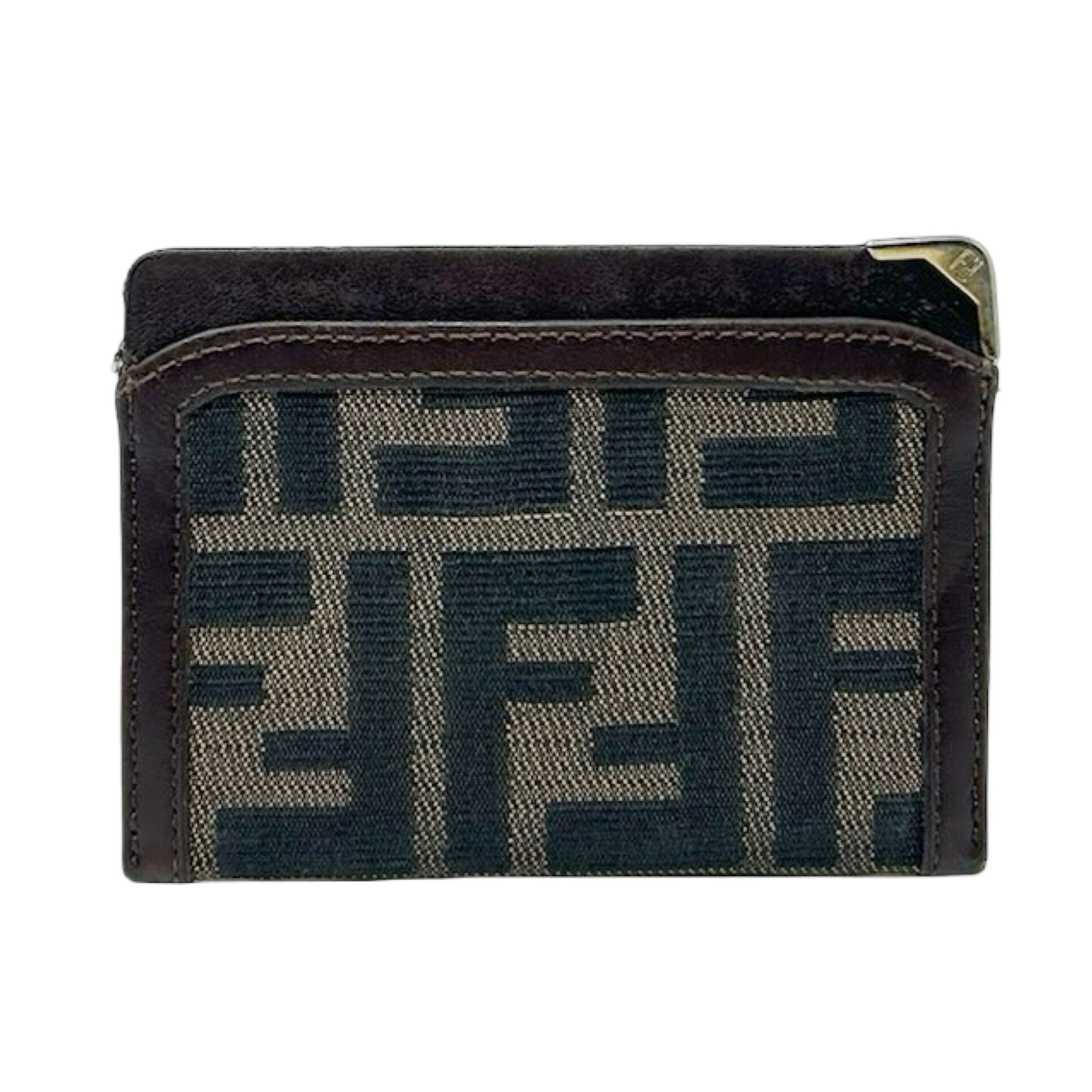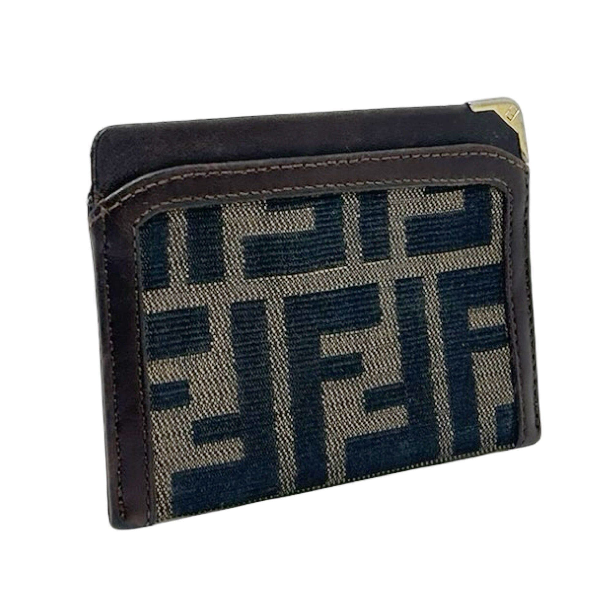 Description - Vintage Fendi Zucca pattern card holder wallet in brown canvas with leather trim, gold tone hardware, single metal corner protector, canvas lining and dual card slots.