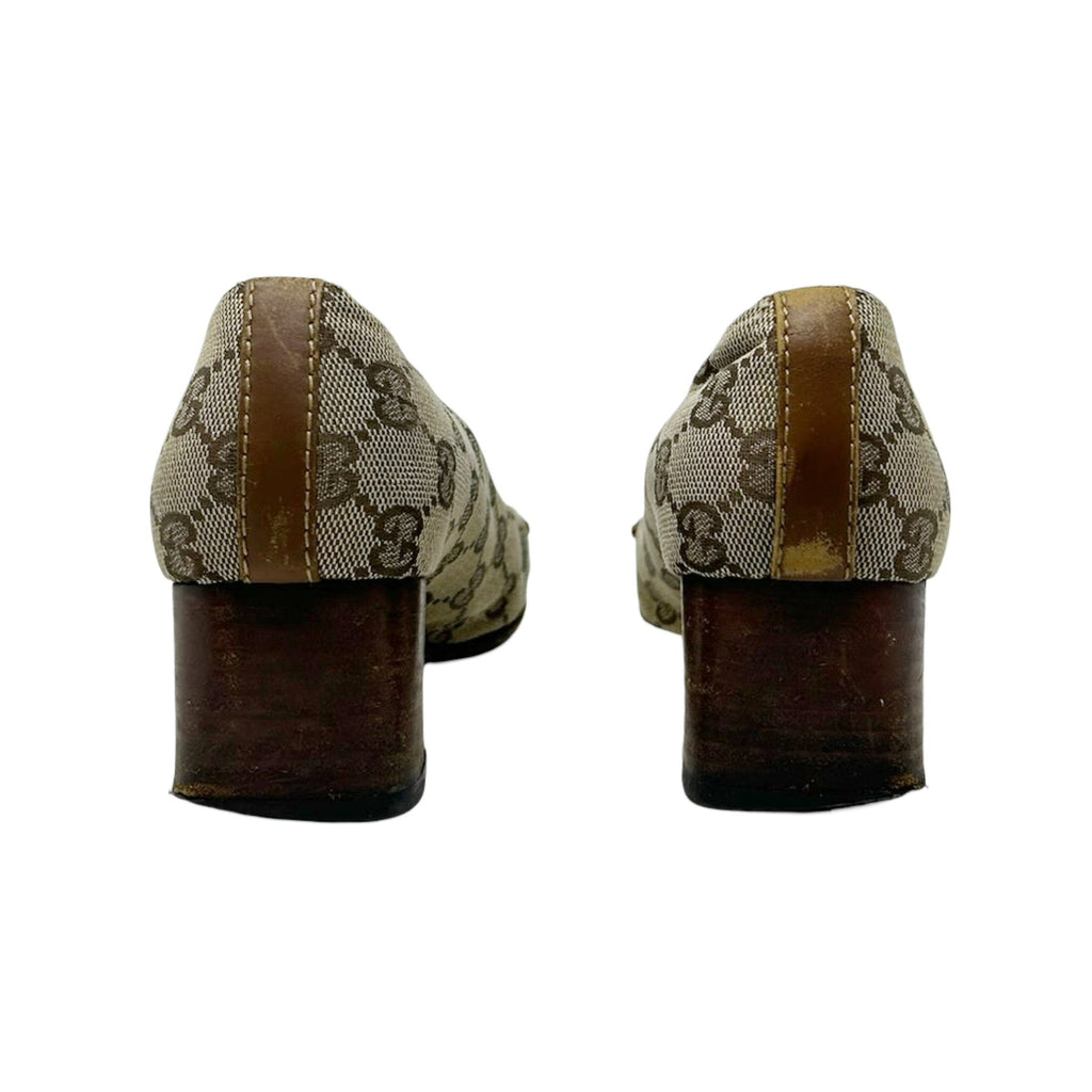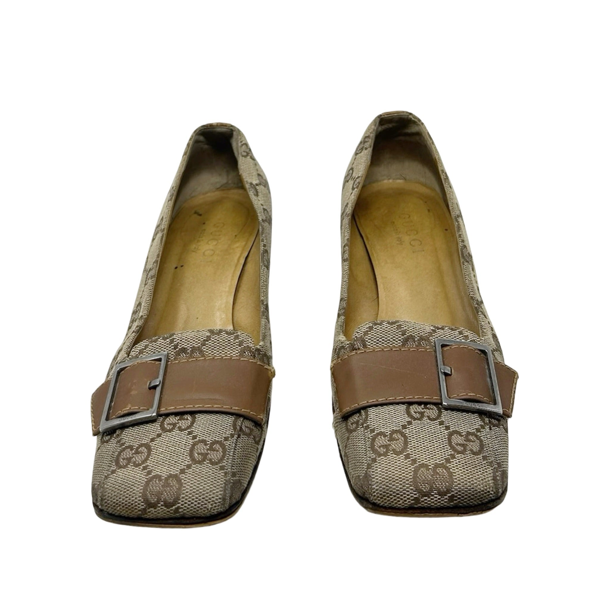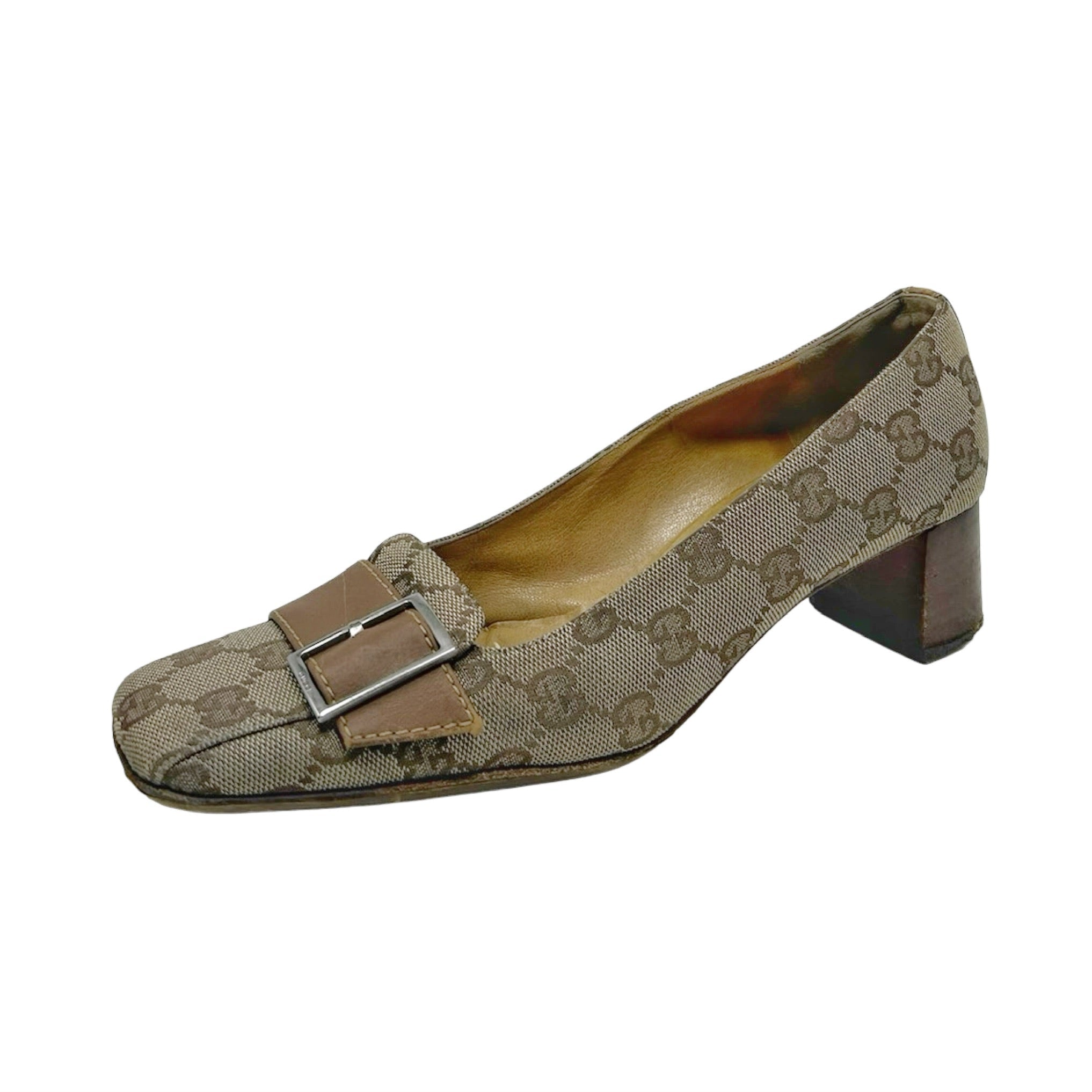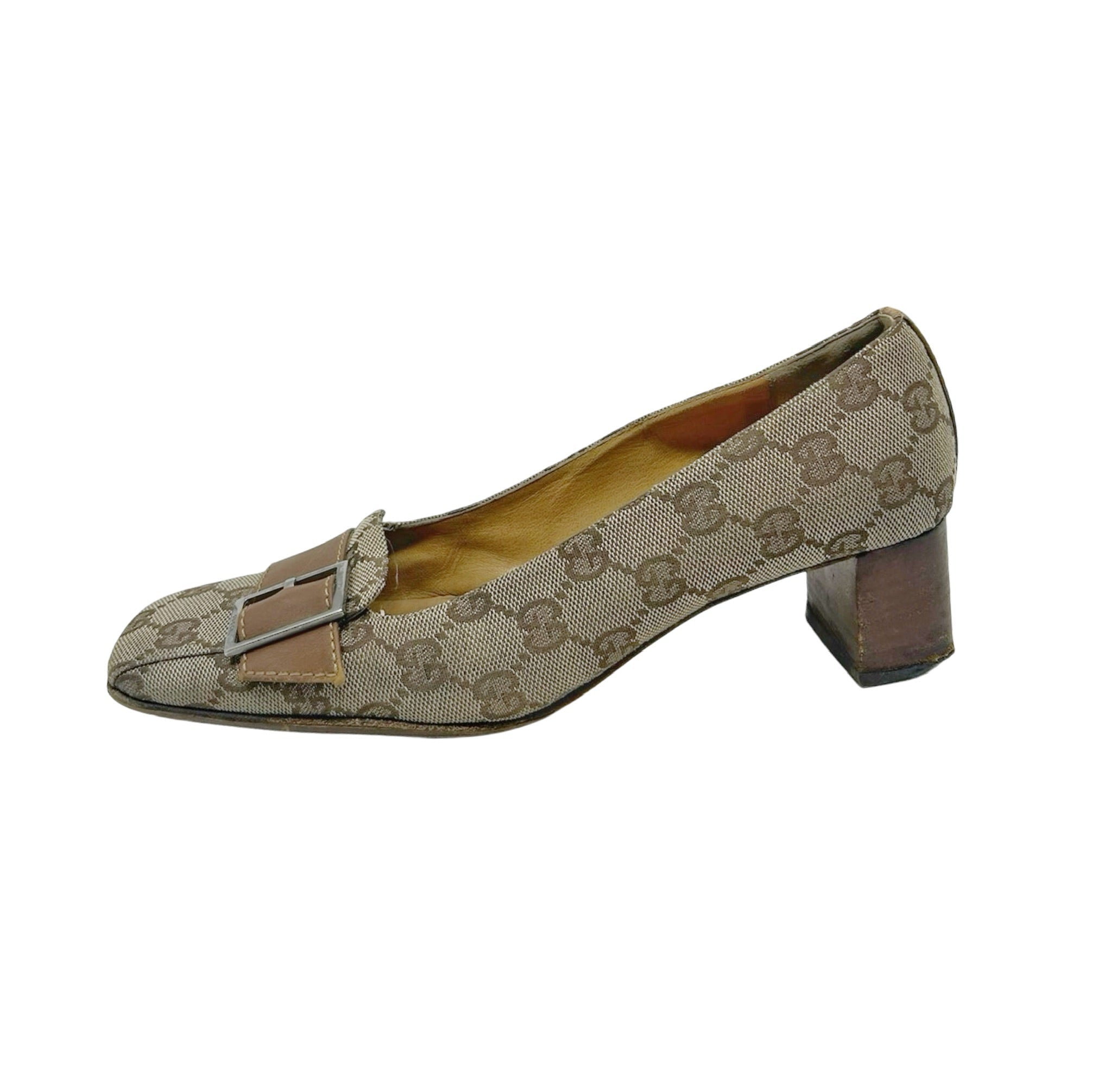 Description: Vintage Gucci GG print monogram kitten heel pumps with brown leather leather stripe at toe and buckle embellishment, stacked wooden heels and square toes.