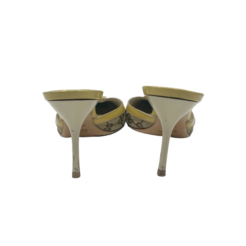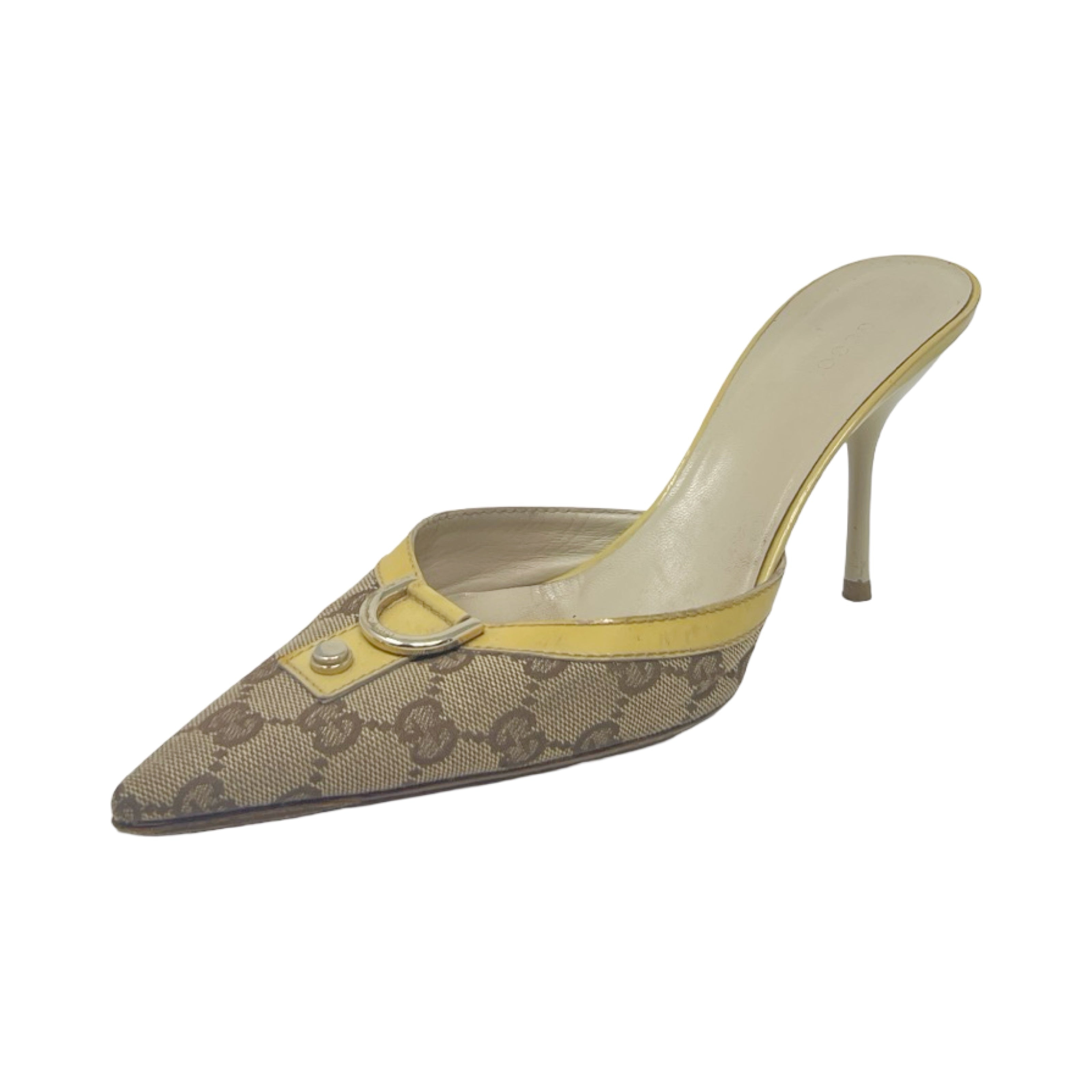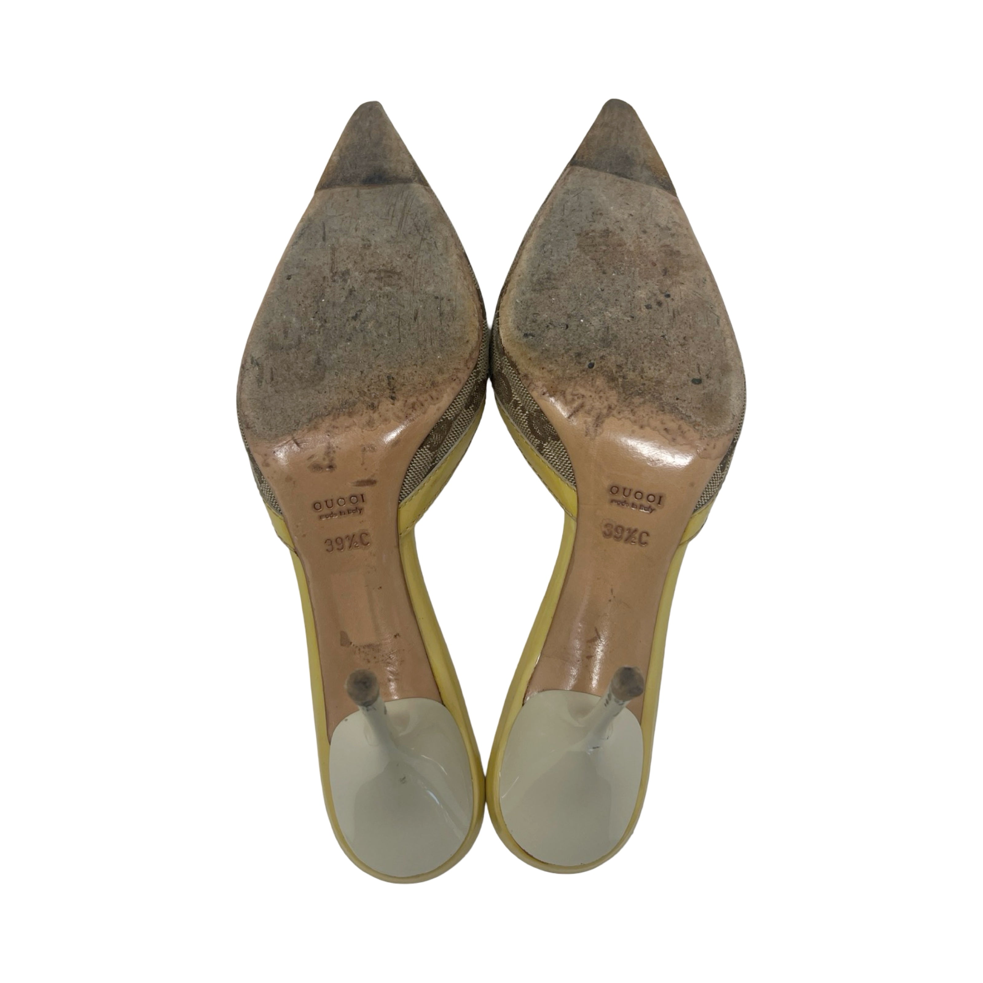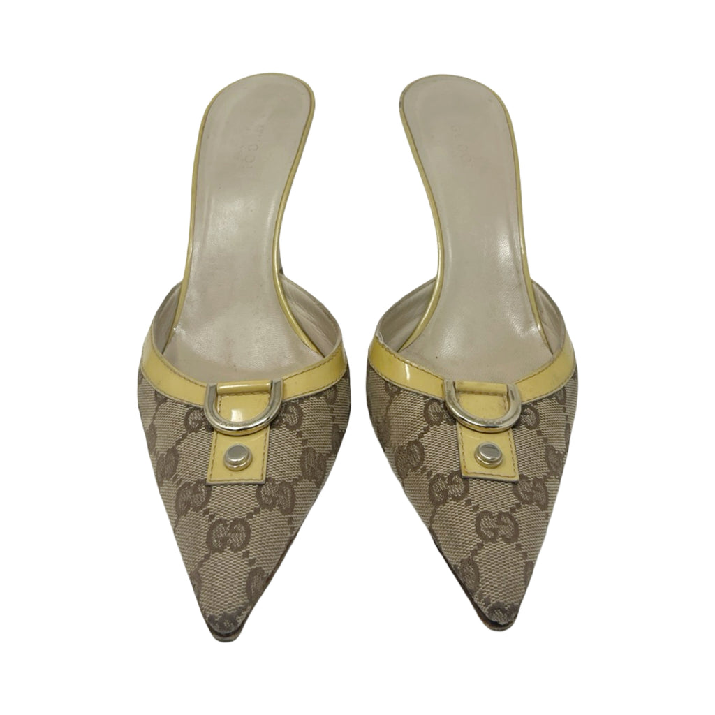 Description - Vintage tan canvas Gucci pointed toe pumps with GG logo print throughout, gold tone hardware, yellow patent leather trim/embellishments, and stiletto heels.