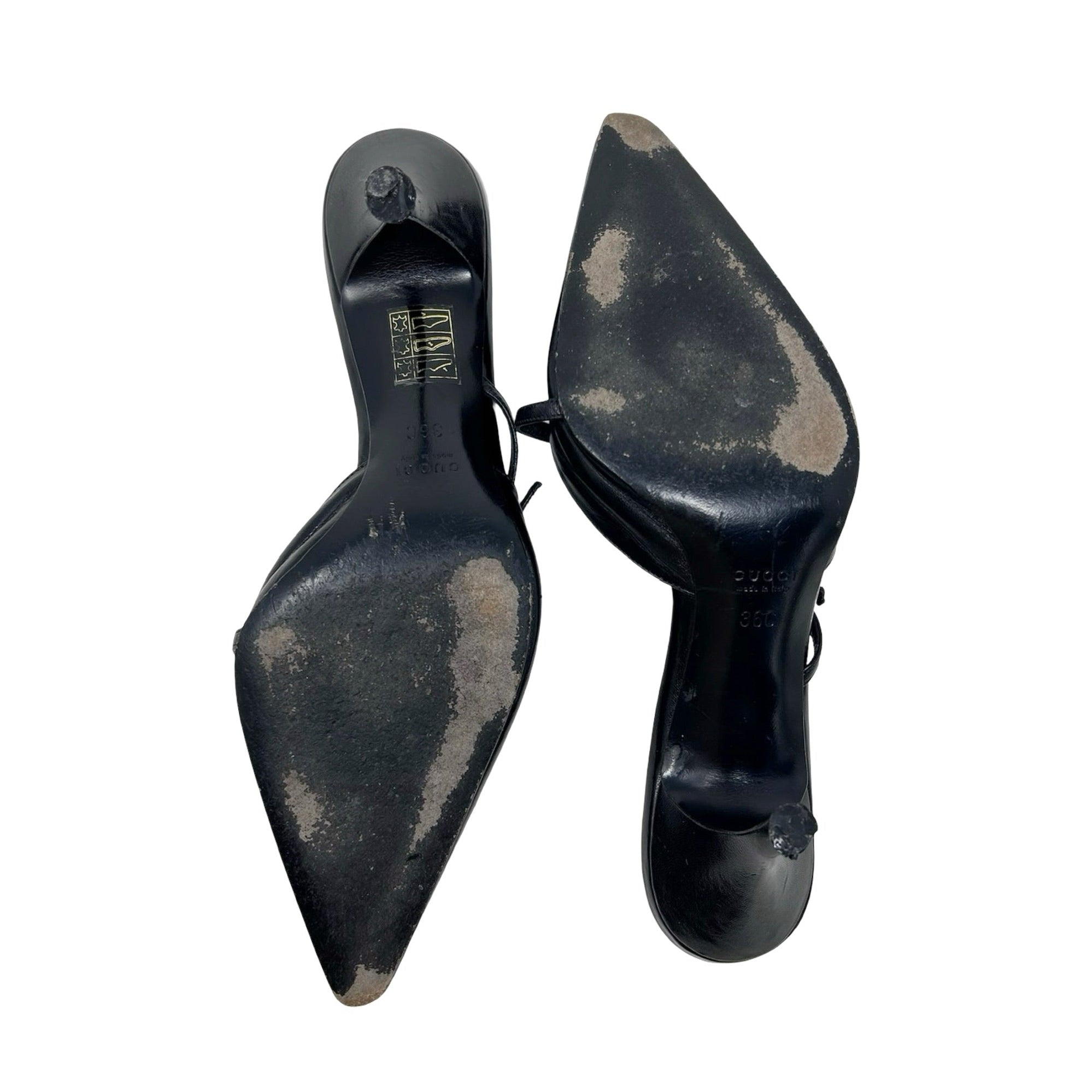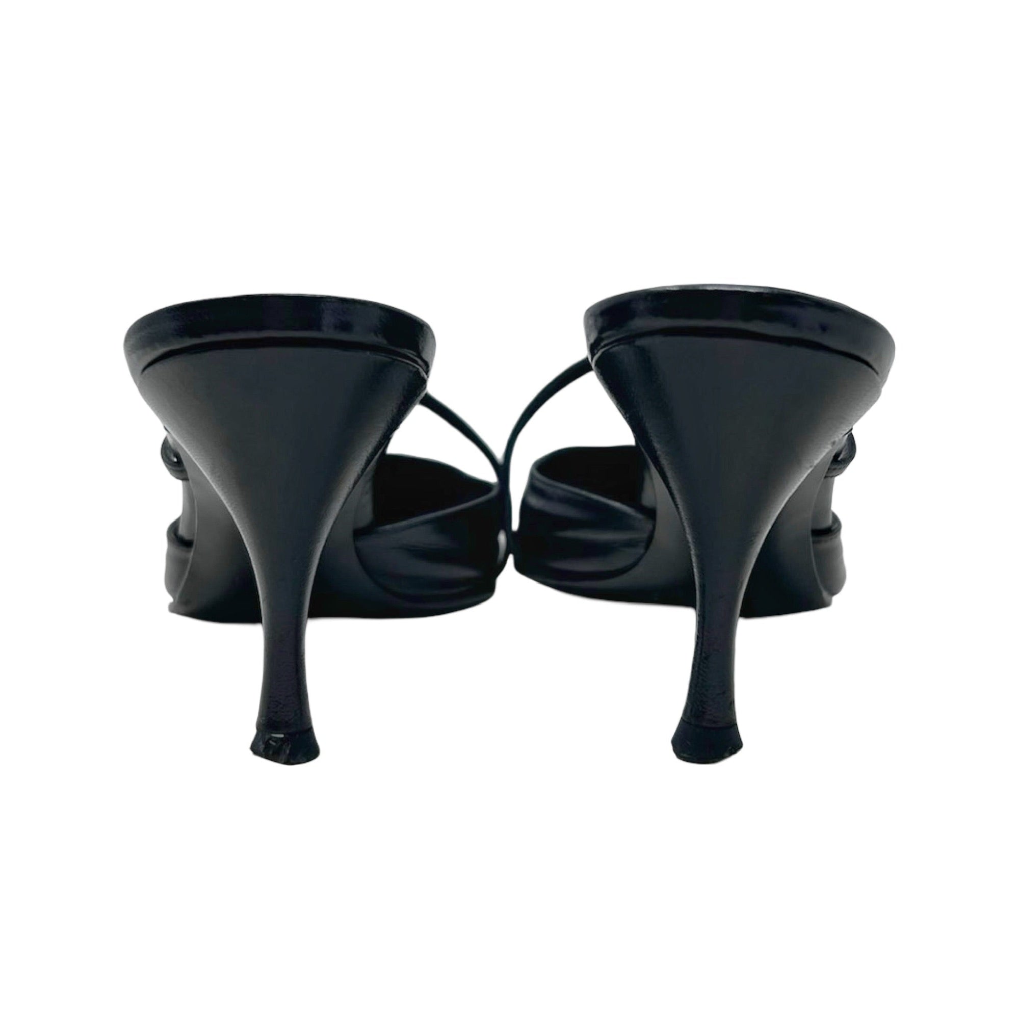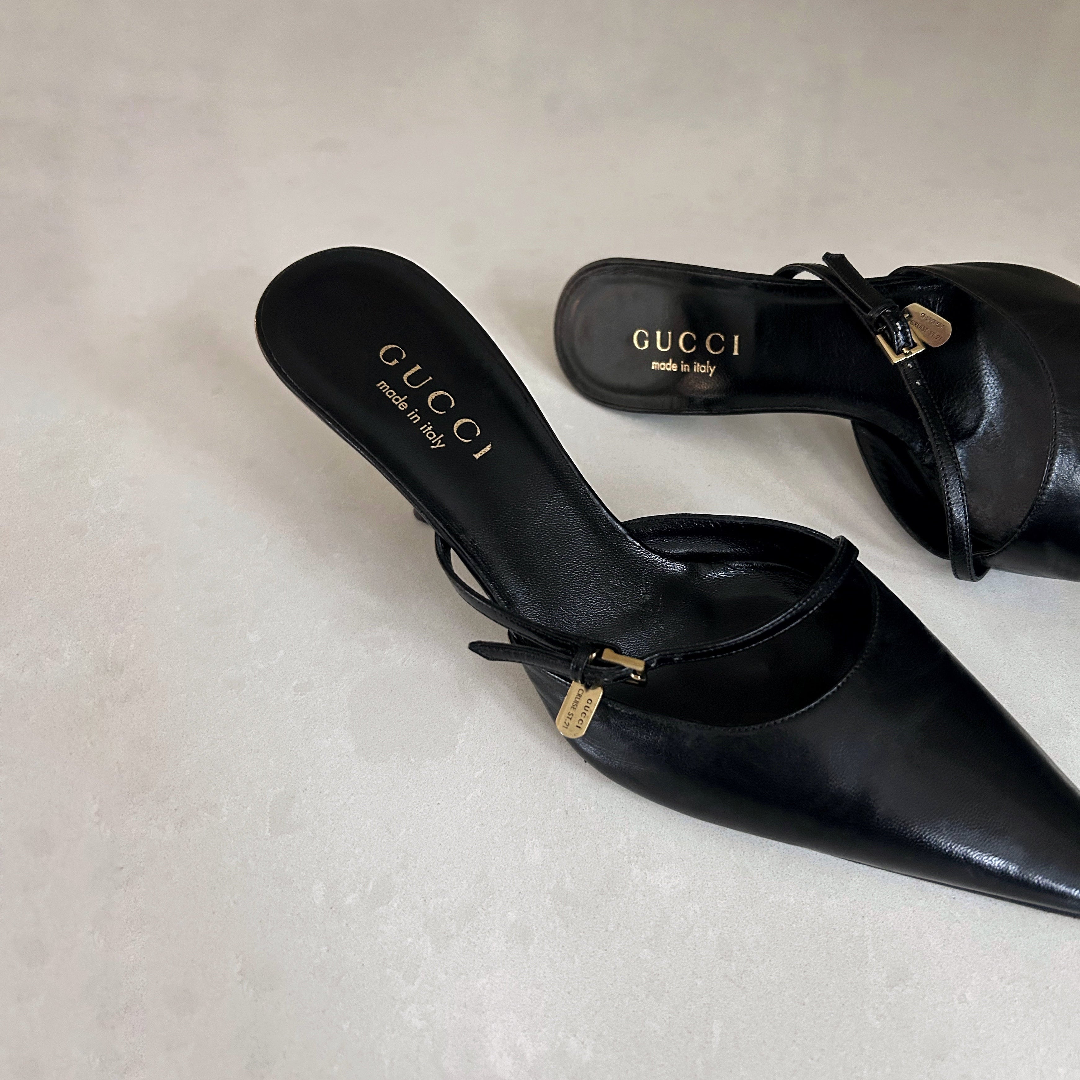 Description - Vintage black Gucci Cruise 2000s leather mules with pointed toes, strappy buckle embellishment, and covered tonal heels.