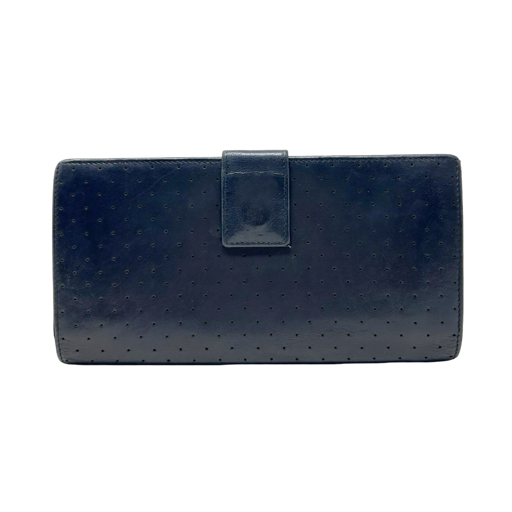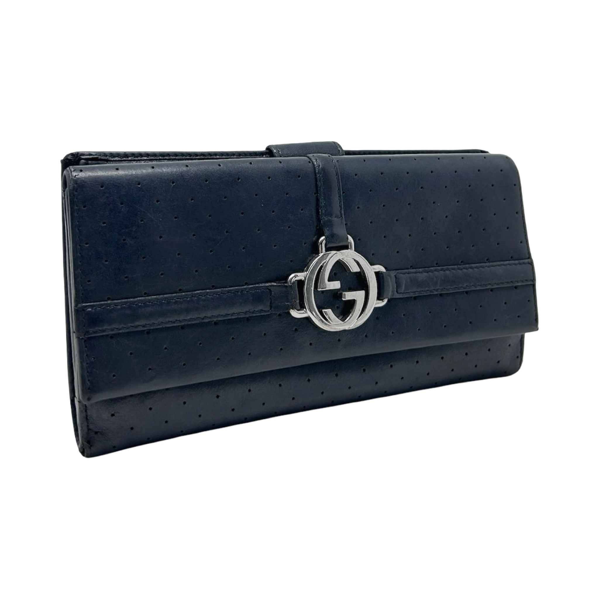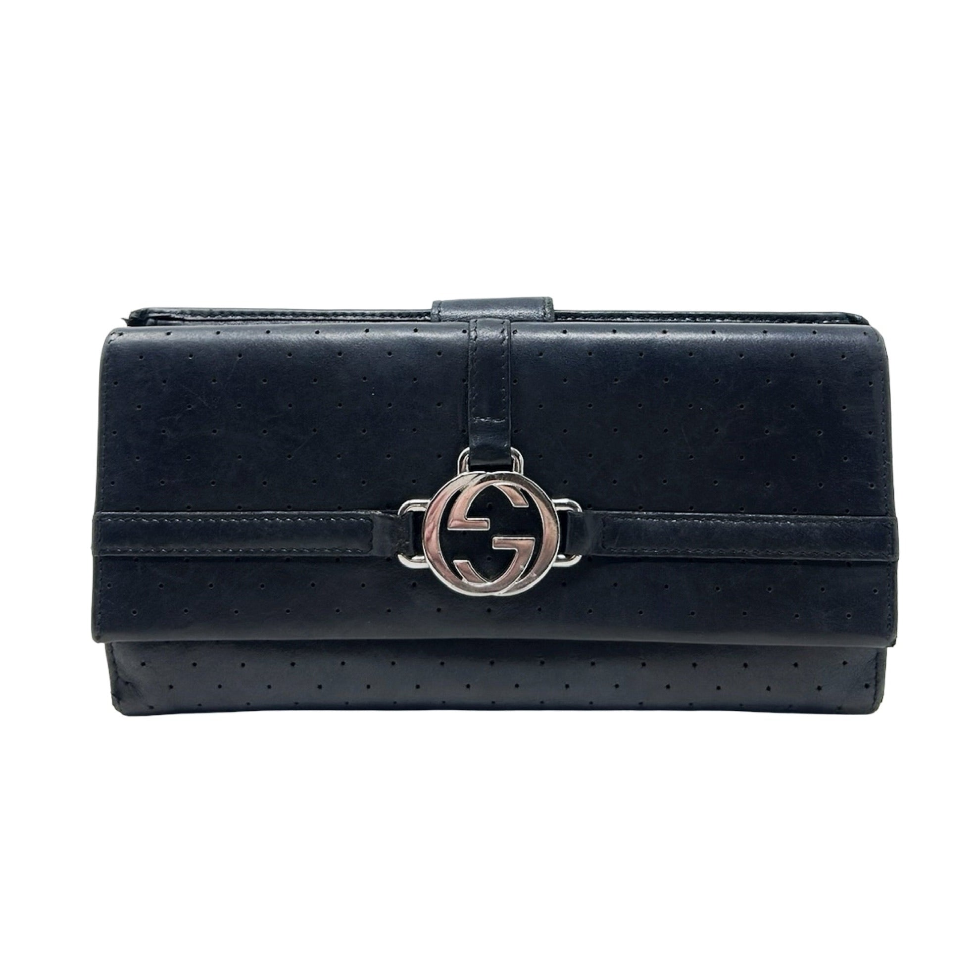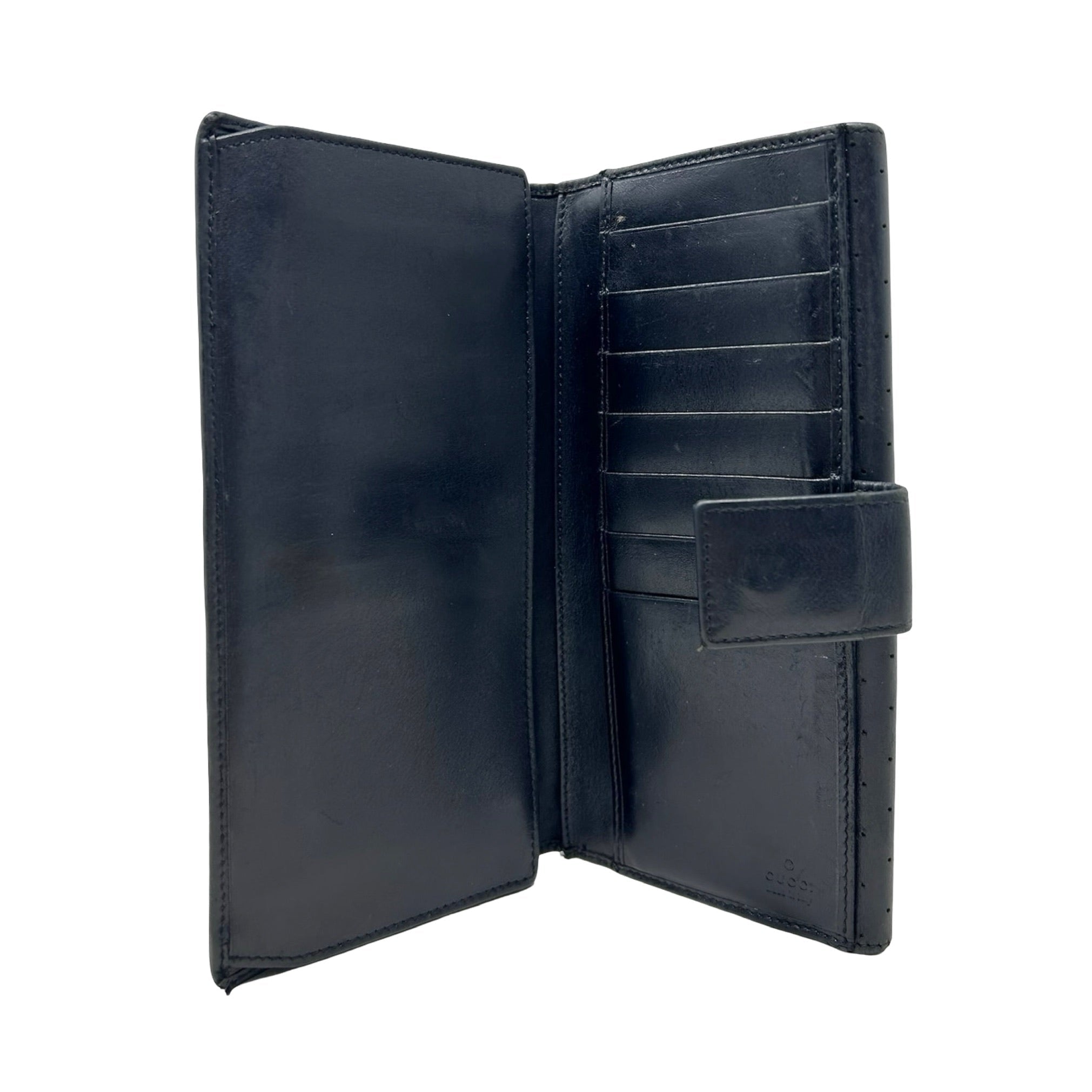 Description - Tom Ford Era black Gucci GG perforated leather continental wallet with silver tone hardware, GG logo plate at front, snap/flap closure pocket at front, snap closure at back with four interior slip pockets, seven interior card slots, and black leather lining.