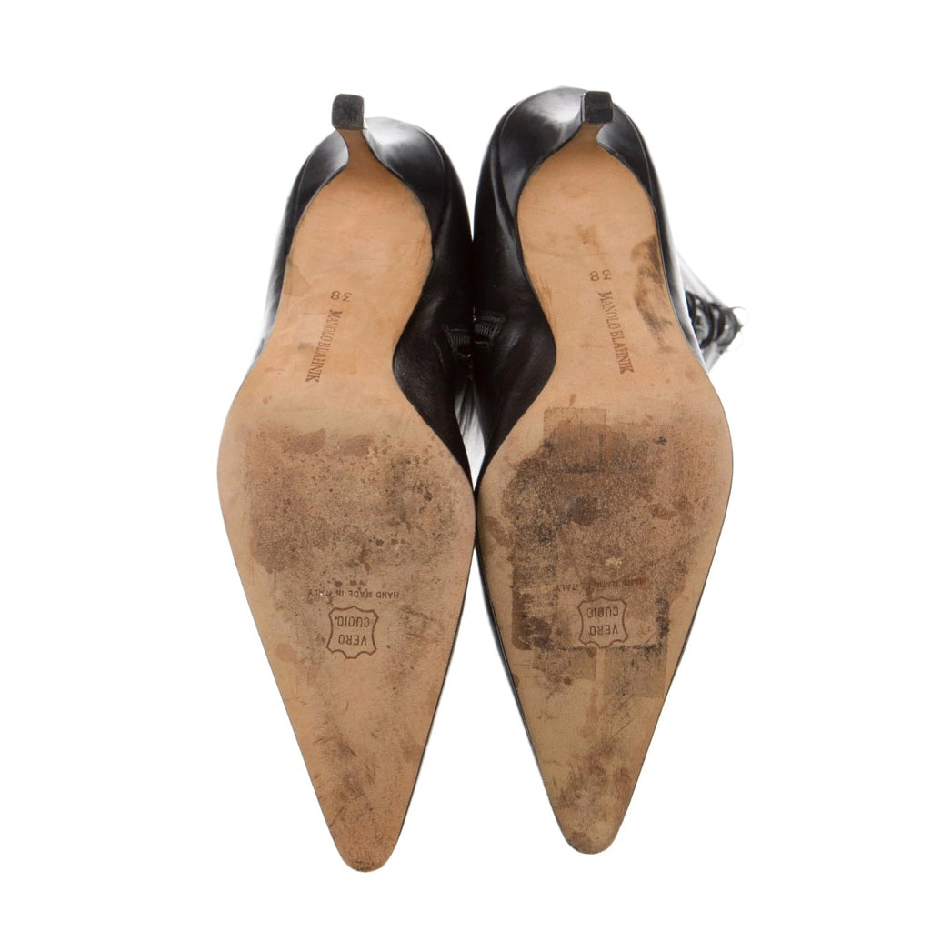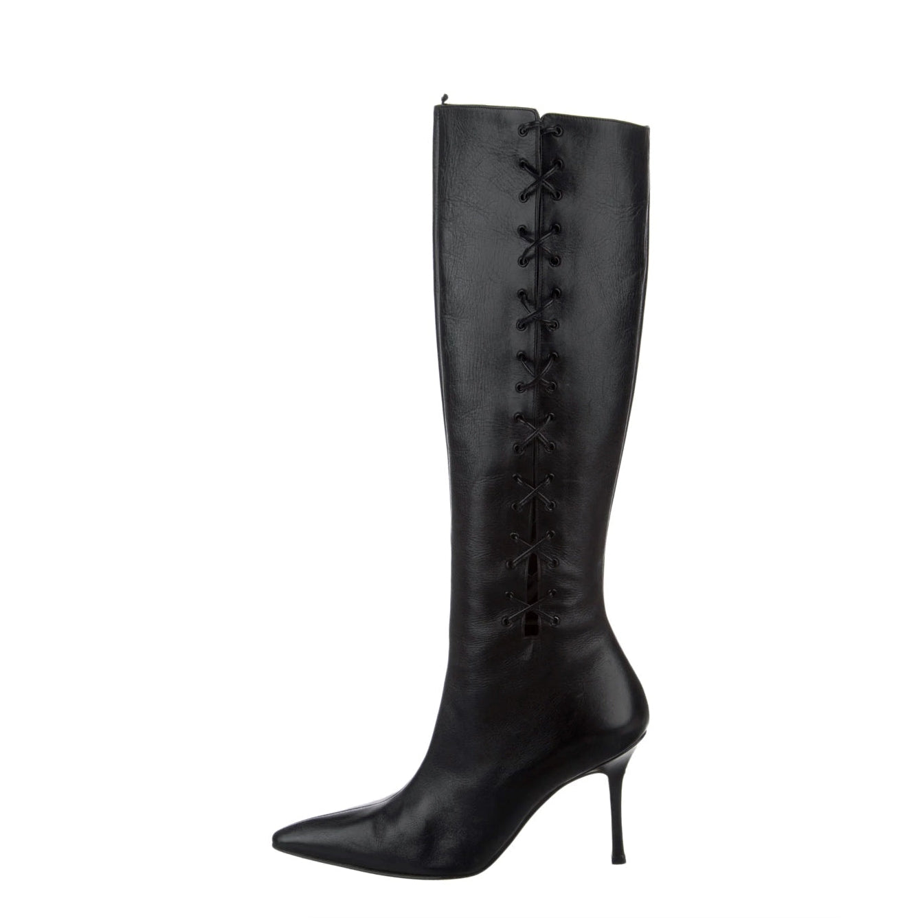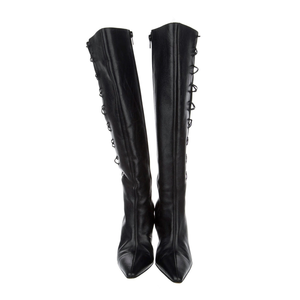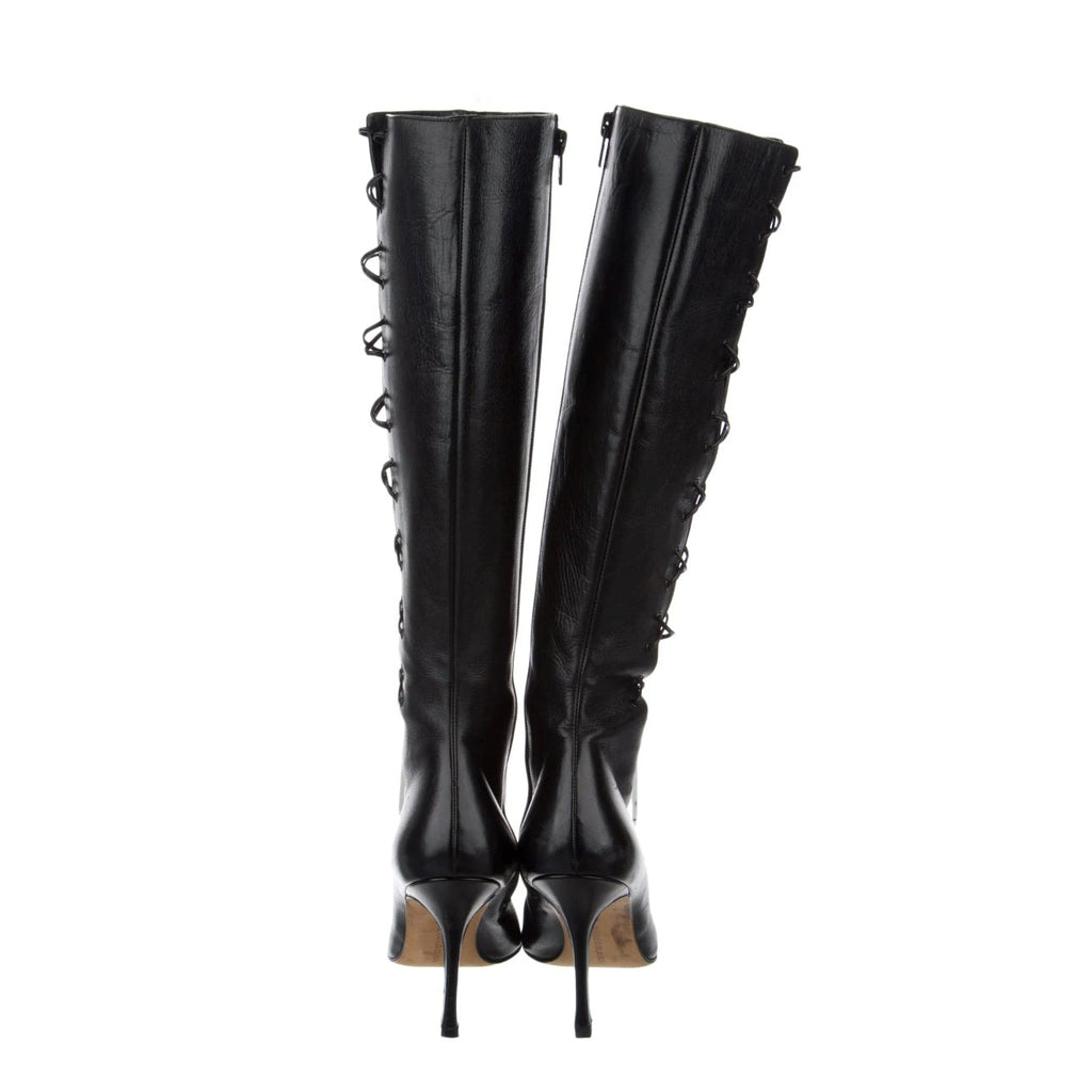 Description - Vintage black Manolo Blahnik leather knee high boots with pointed toes, lace up embellishment at sides, covered tonal heels and zip closure at side.