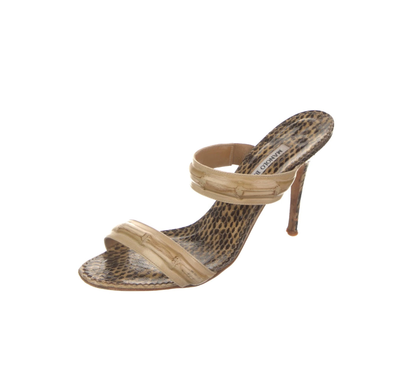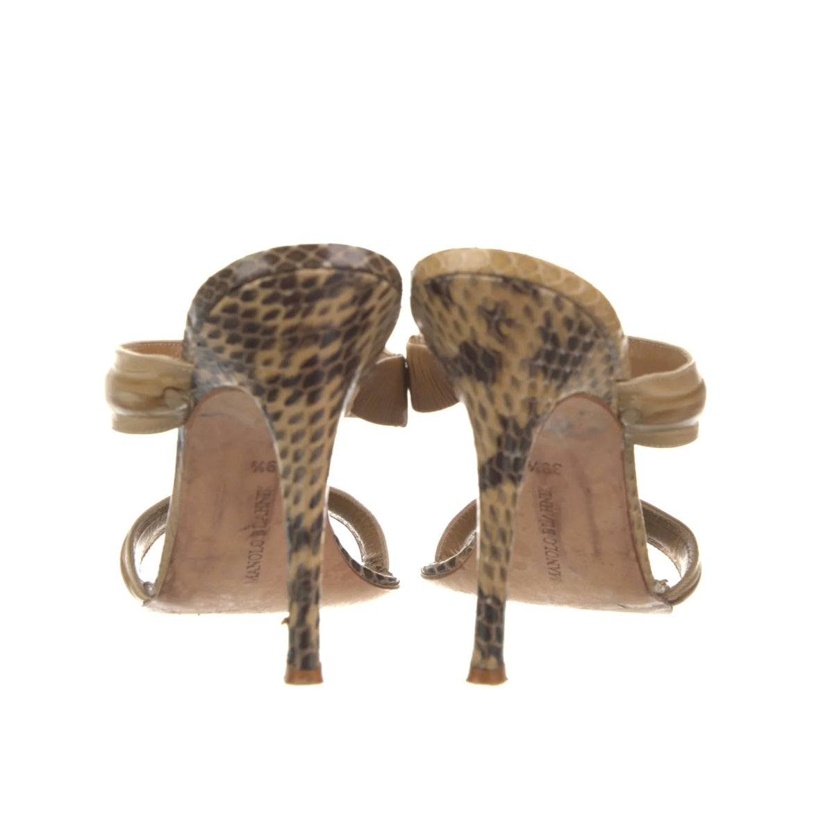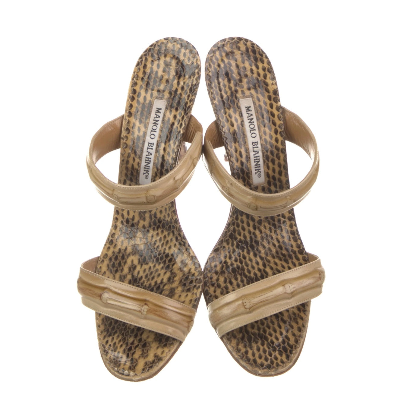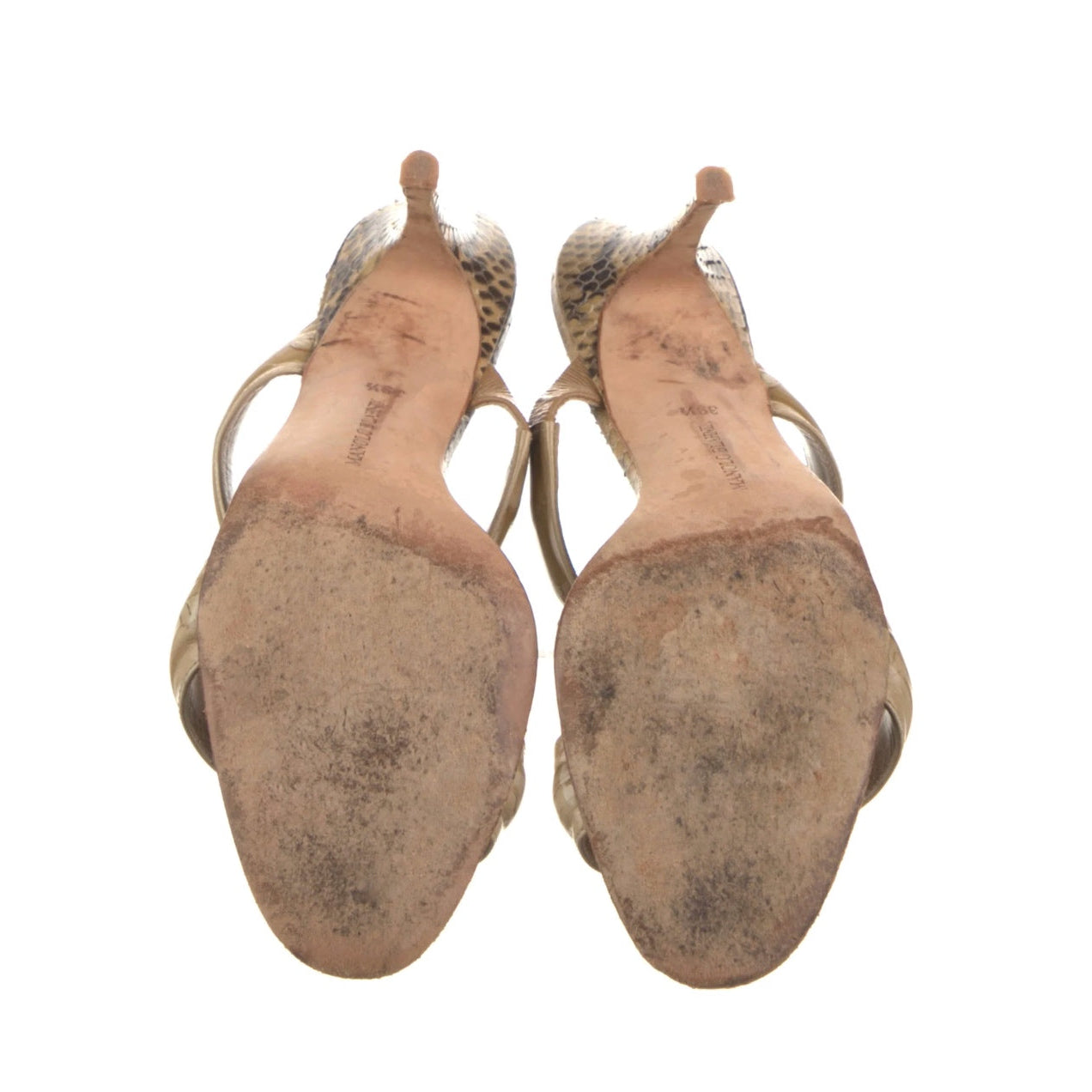 Description - Early 2000's snakeskin Manolo Blahnik rounded toe sandals in brown/neutral with dual straps and tonal covered heels.