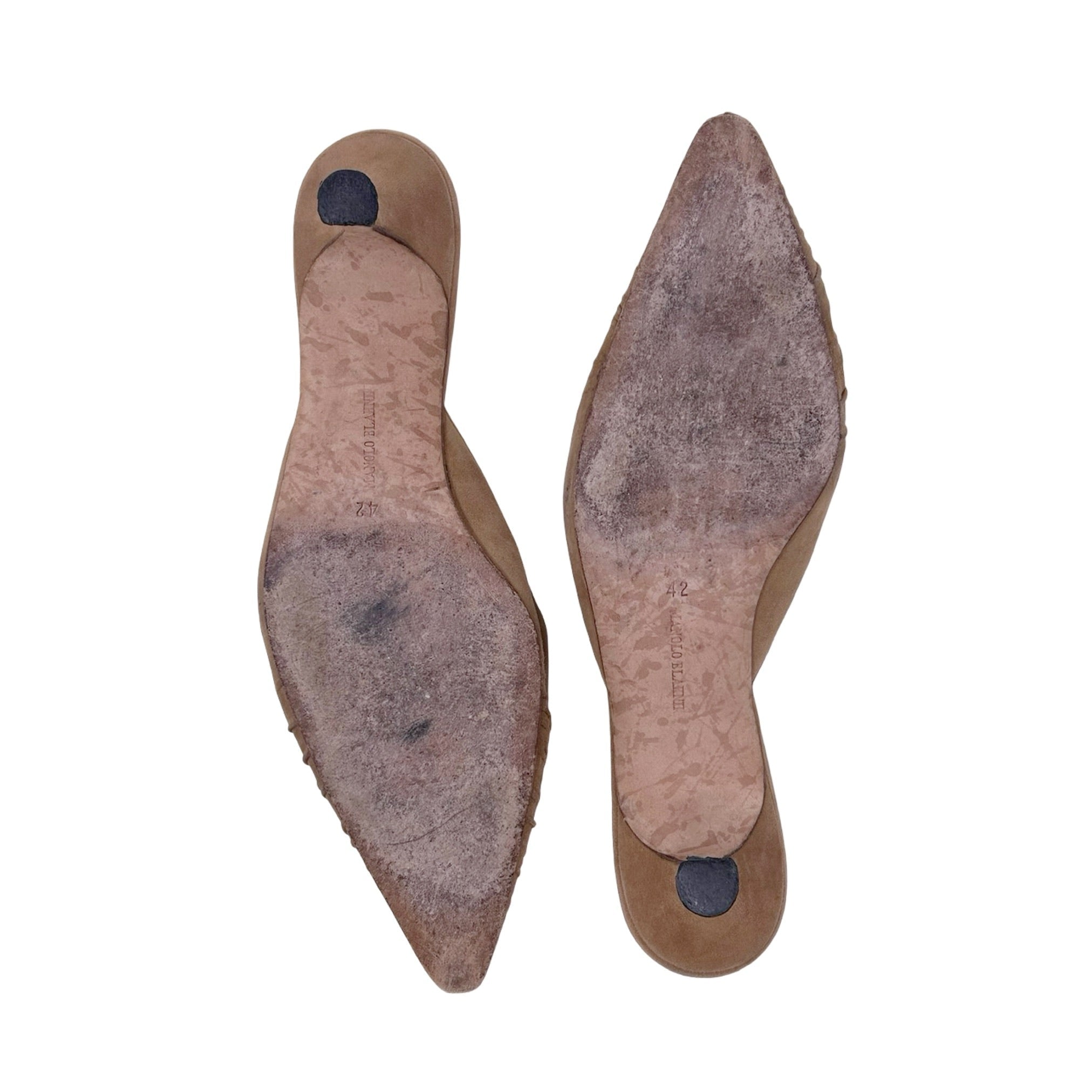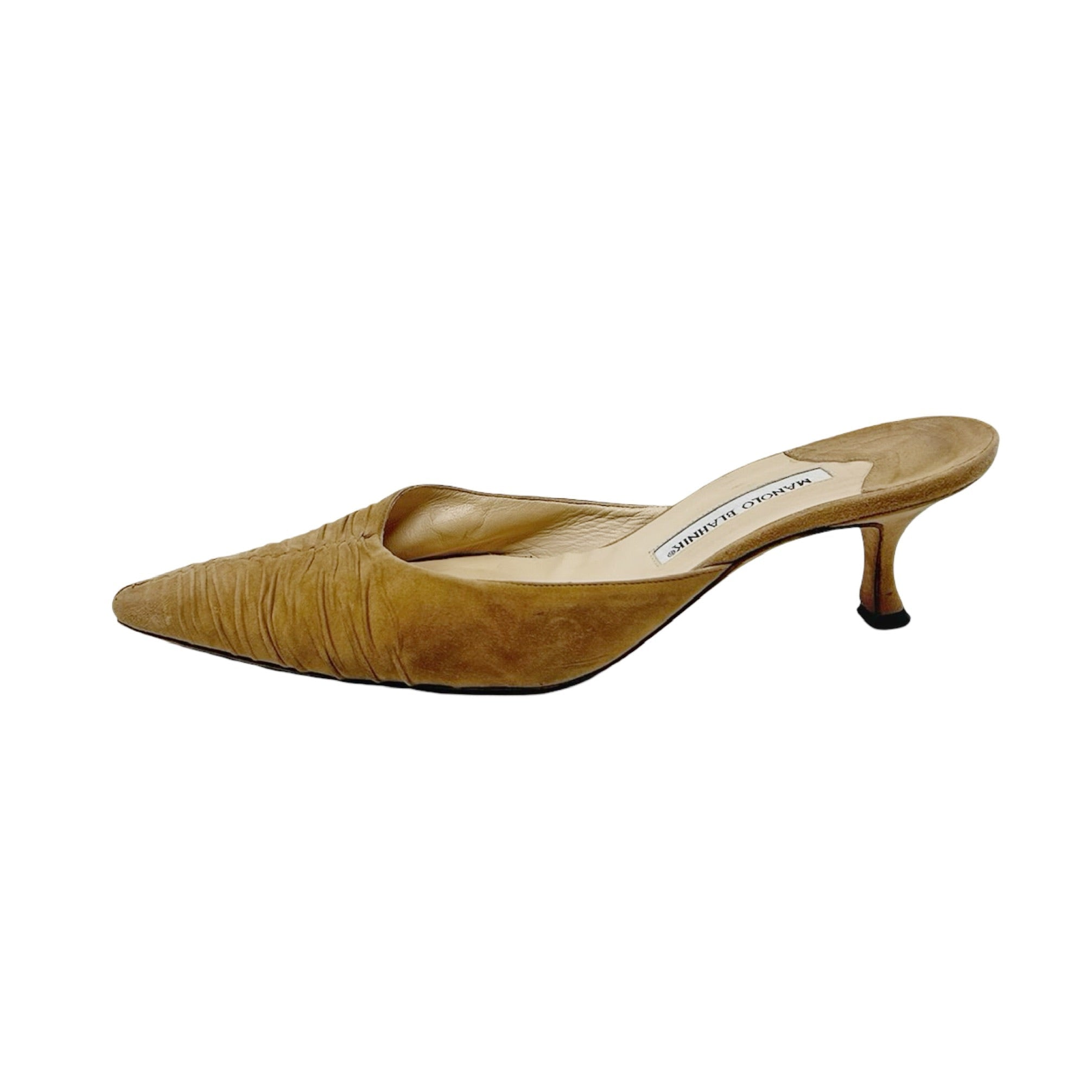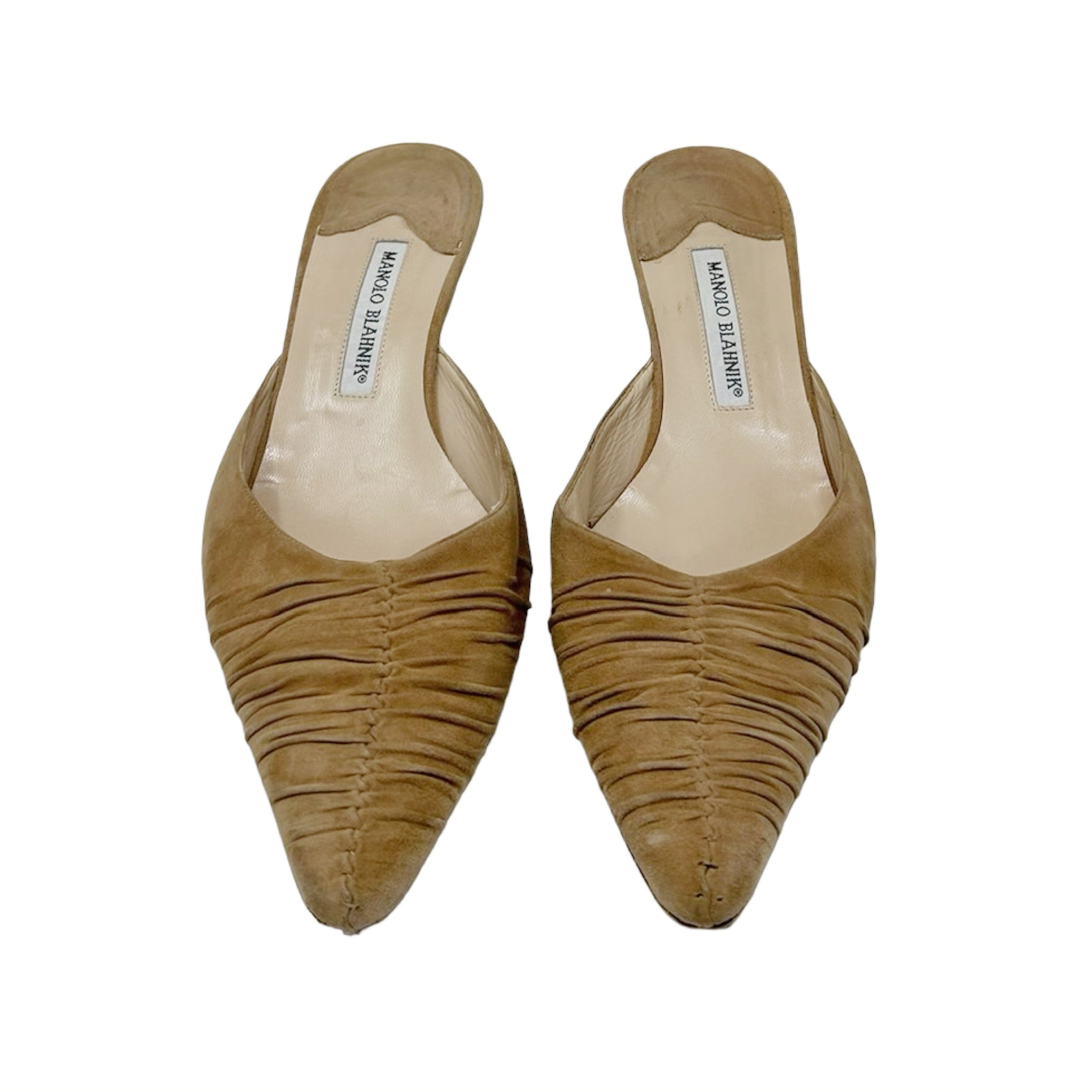 Description - Early 2000's neutral suede Manolo Blahnik mules with ruched detail at front, covered tonal heels and pointed toes. Designed in 2005 by Manolo Blahnik.