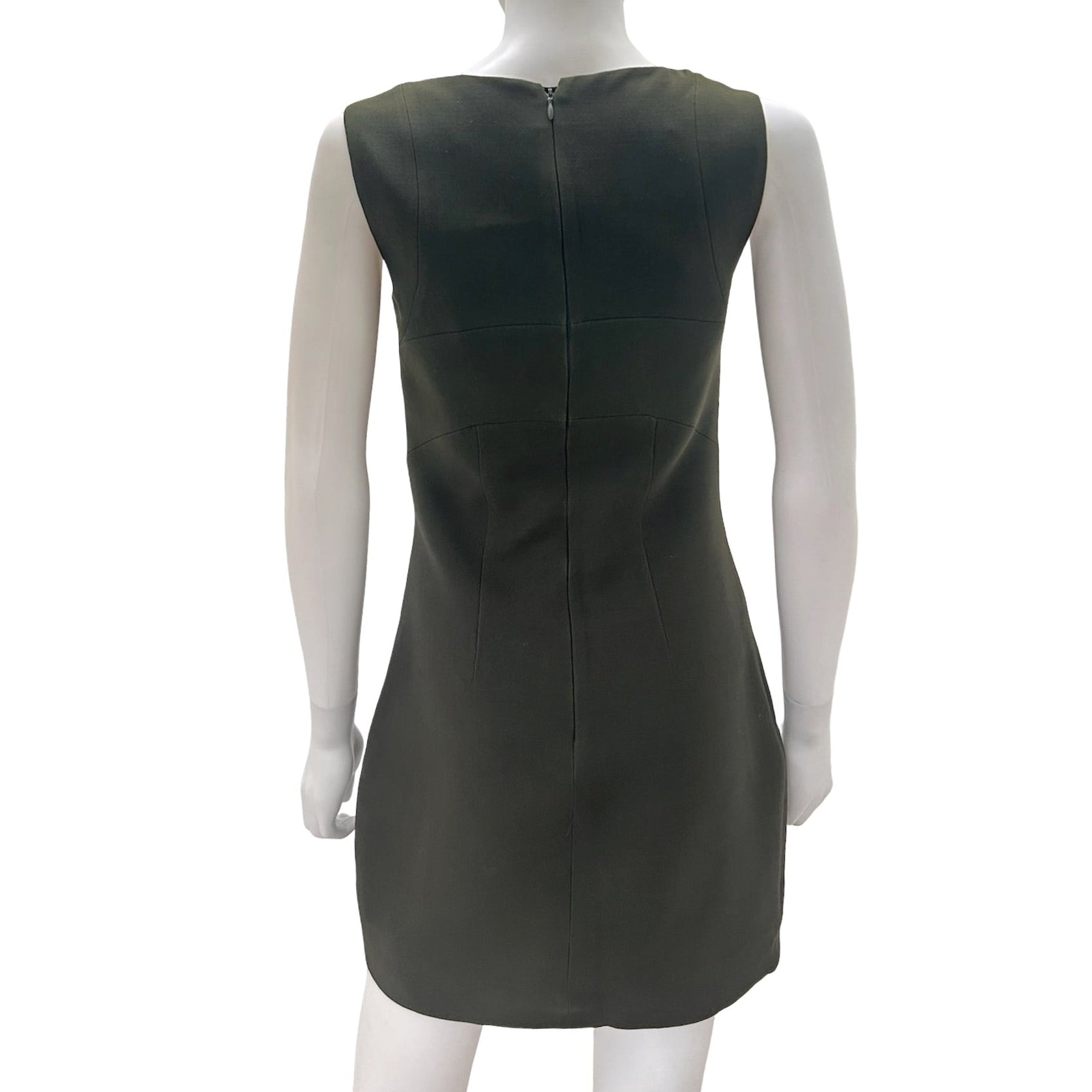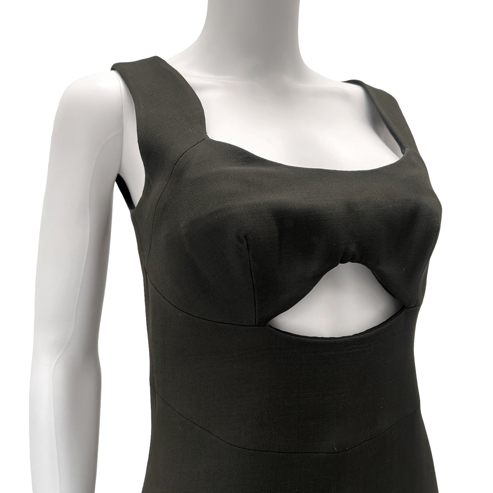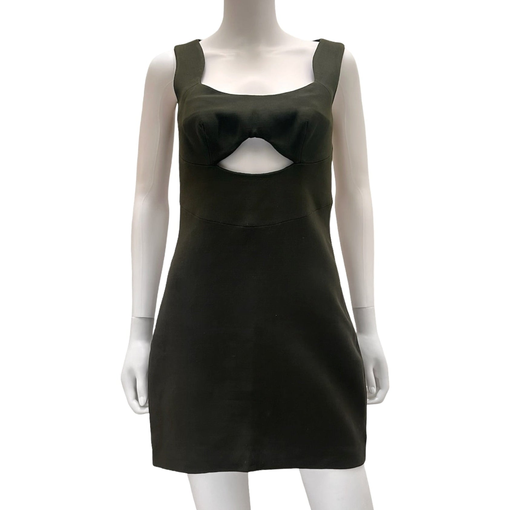 Description: Early 2000's wool/silk blend green Prada sleeveless mini dress with scoop neckline, cutout under bust, hook/zip closure at back.