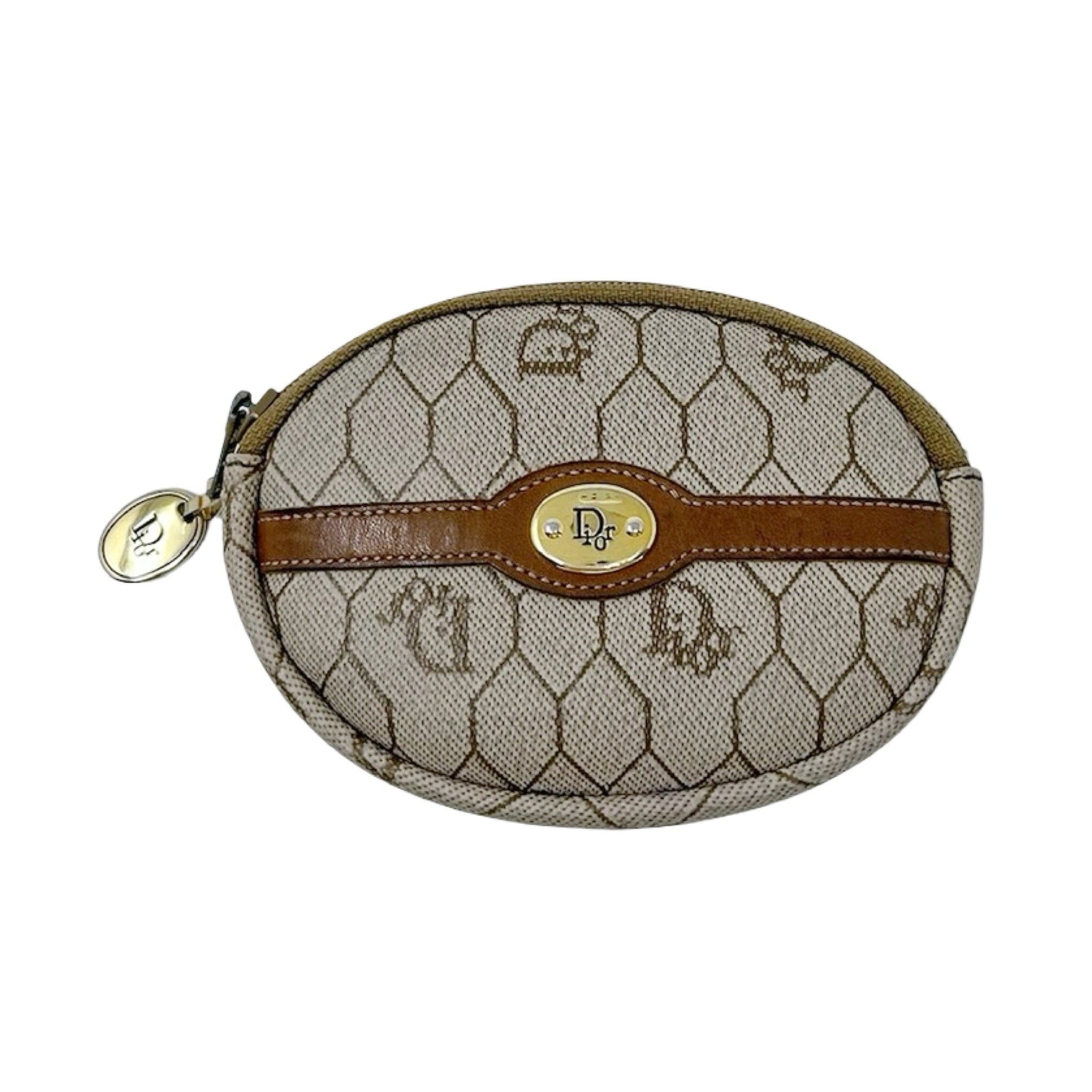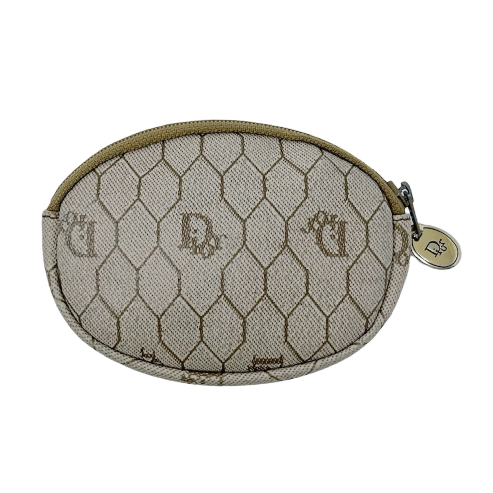 Details - Vintage neutral Christian Dior coated canvas coin pouch with honeycomb print logo pattern throughout, gold tone hardware, brown leather trim, Dior embossed logo plate at front, and zip around closure.