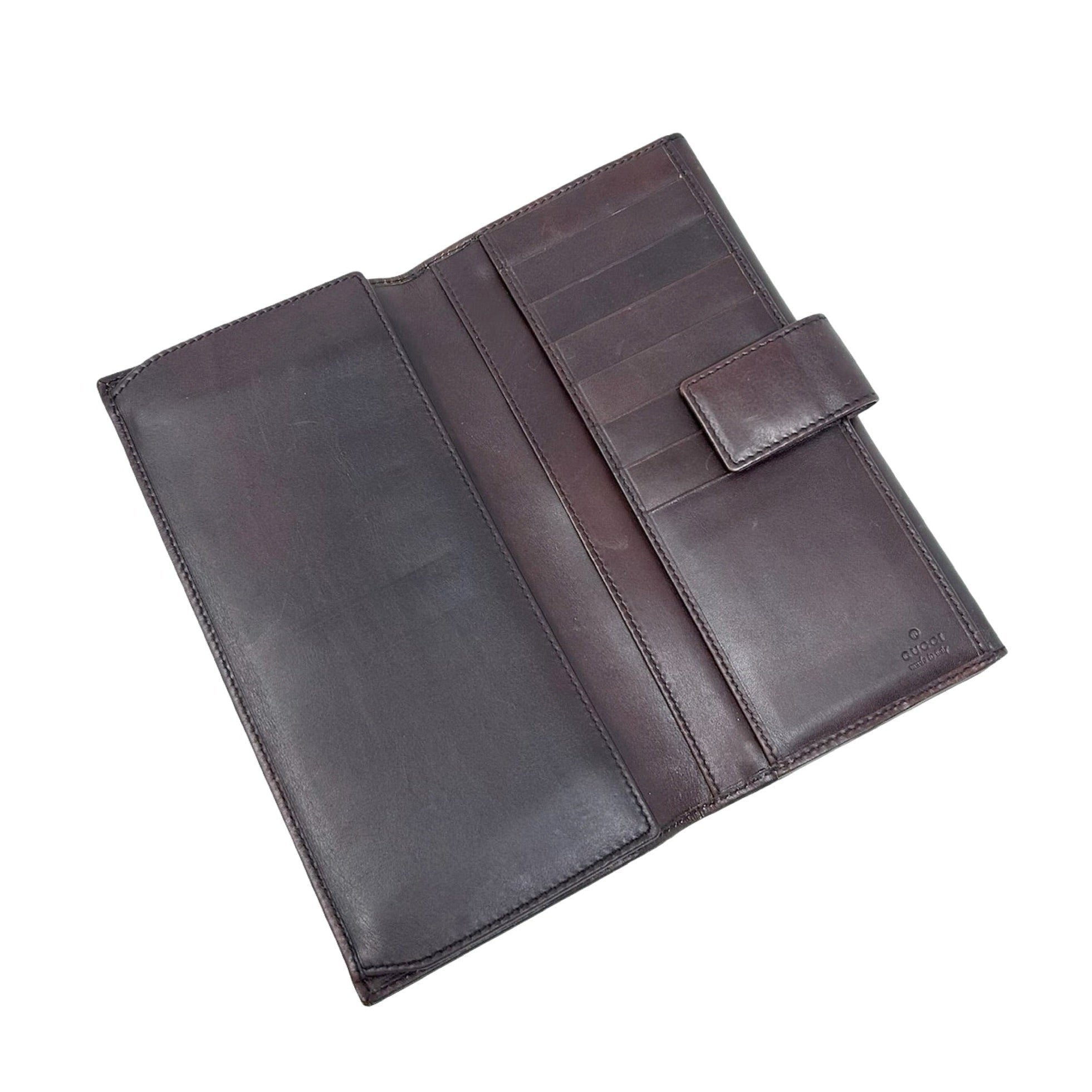 Description - Vintage brown Gucci leather continental wallet with gold tone hardware, GG Logo plate hardware on front, snap closure at front, single exterior snap up pocket, four interior bill slots, and seven card slots.