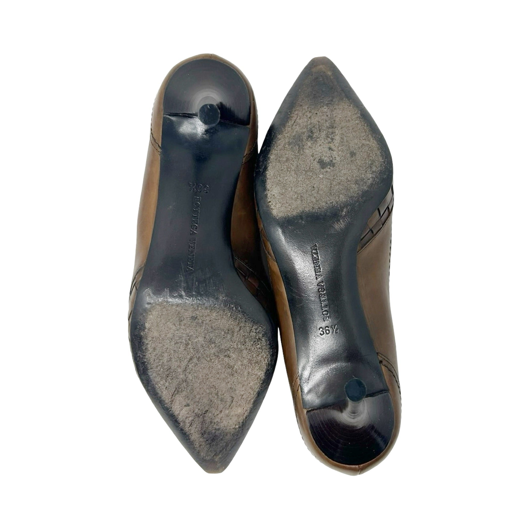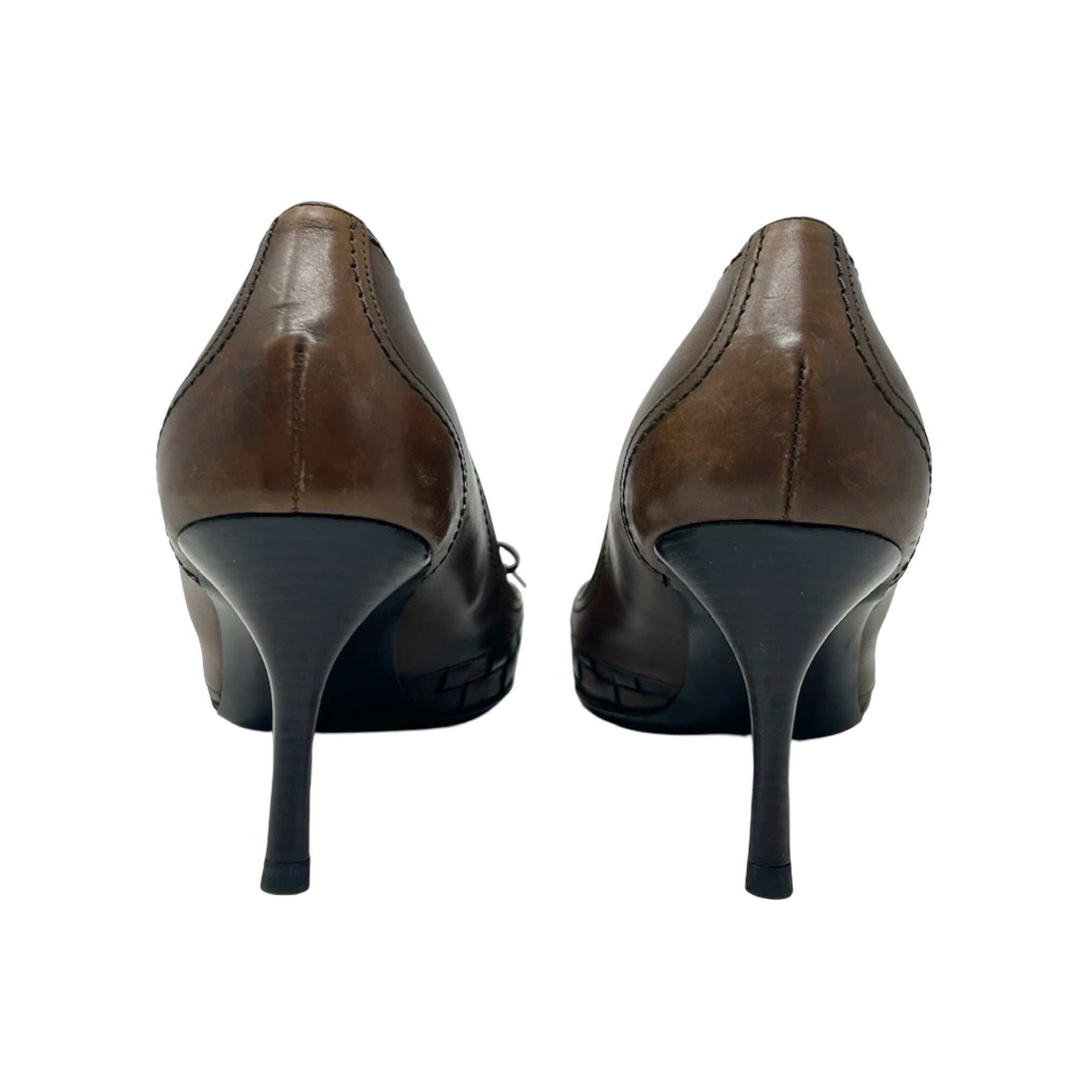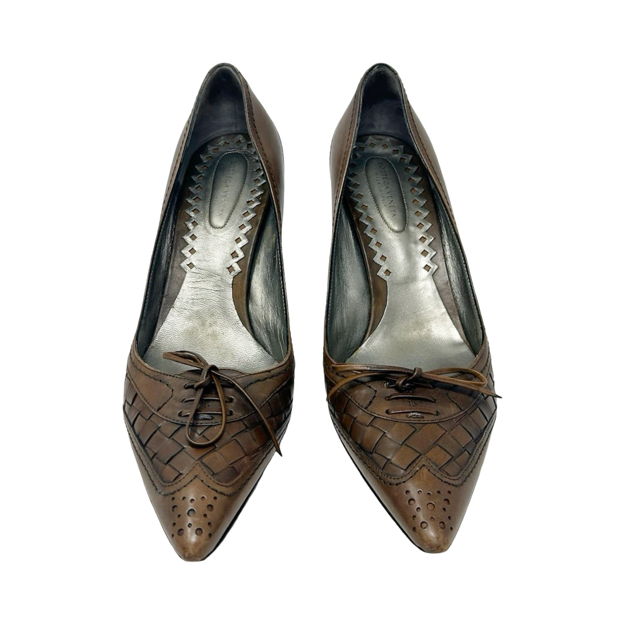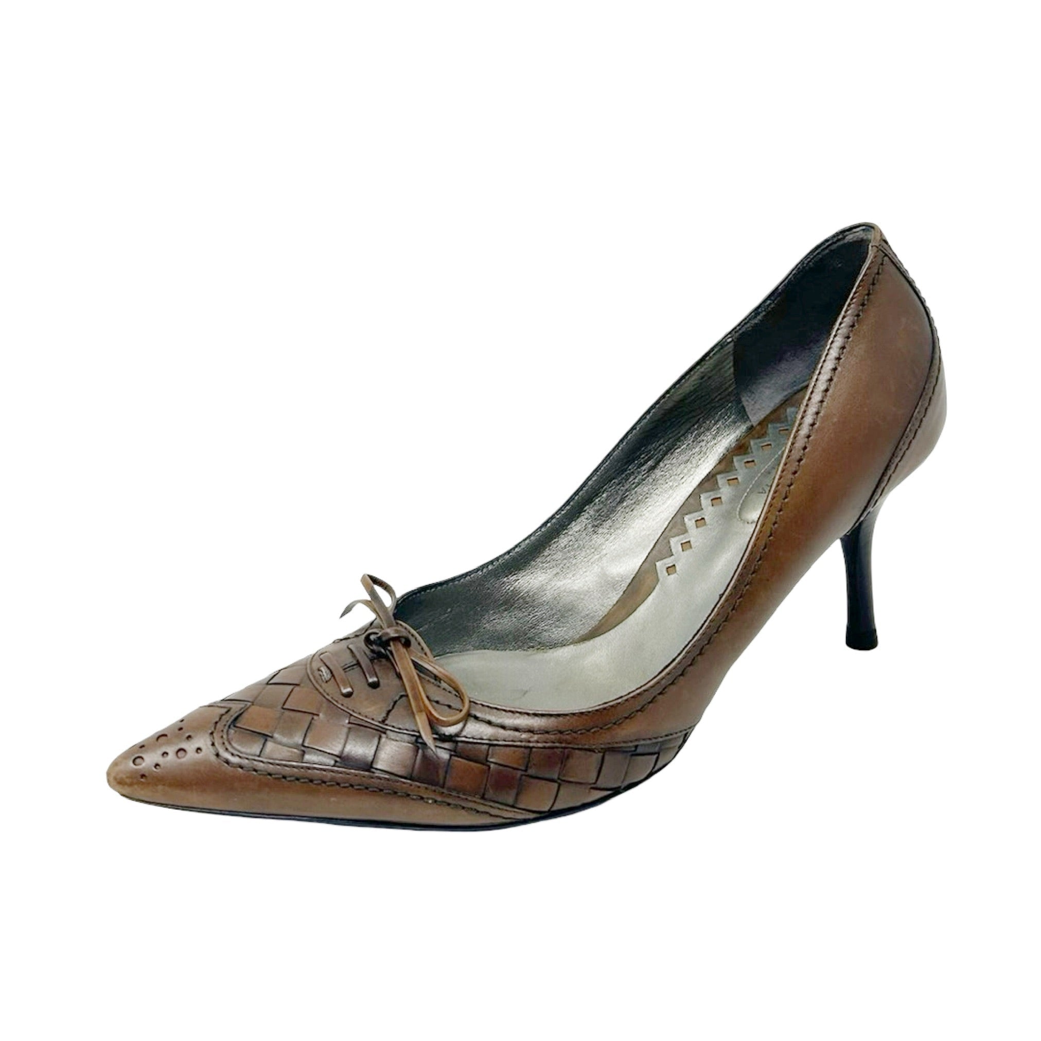 Description - Early 2000's Bottega Veneta brown leather Intrecciato weave stilettos with pointed toes, lace up embellishment, tonal whipstitch detail throughout and stacked wood heels.