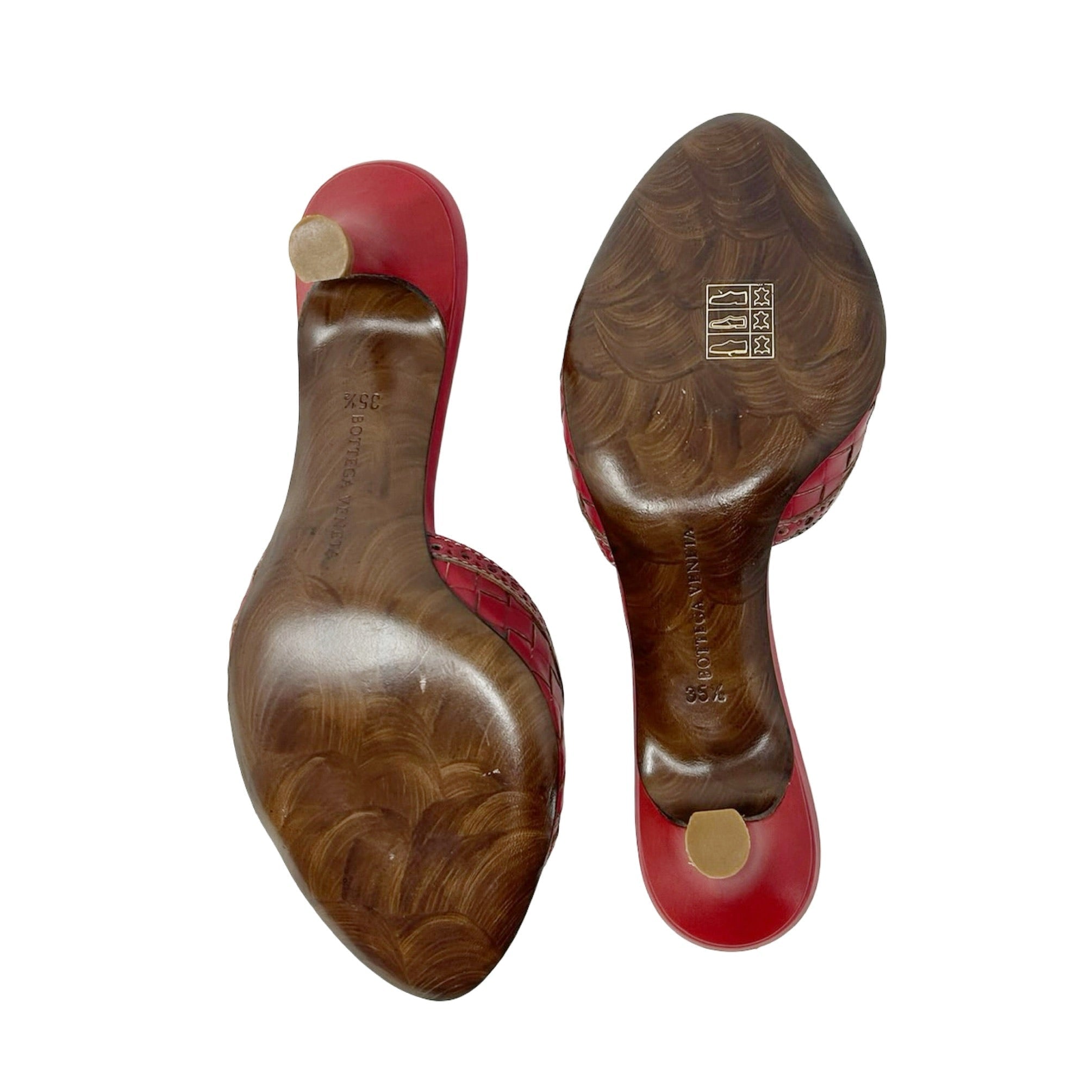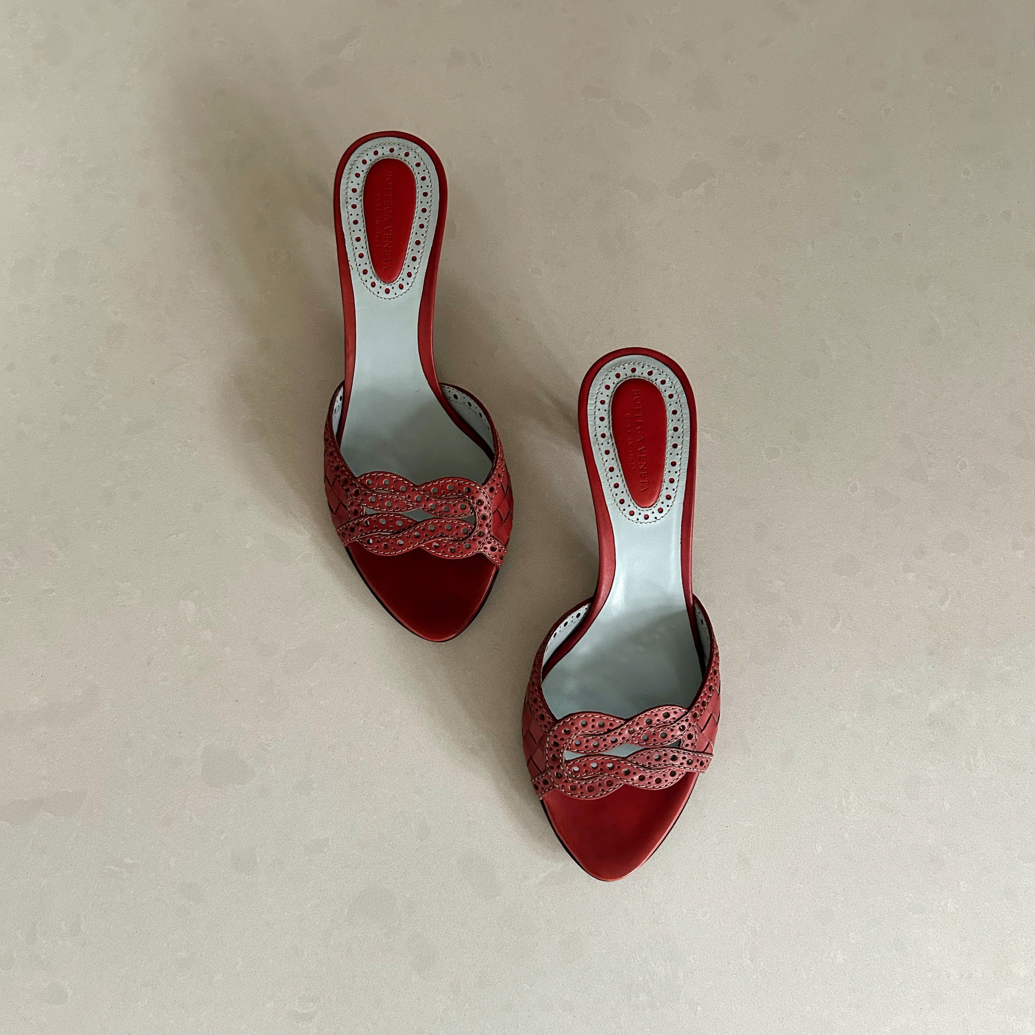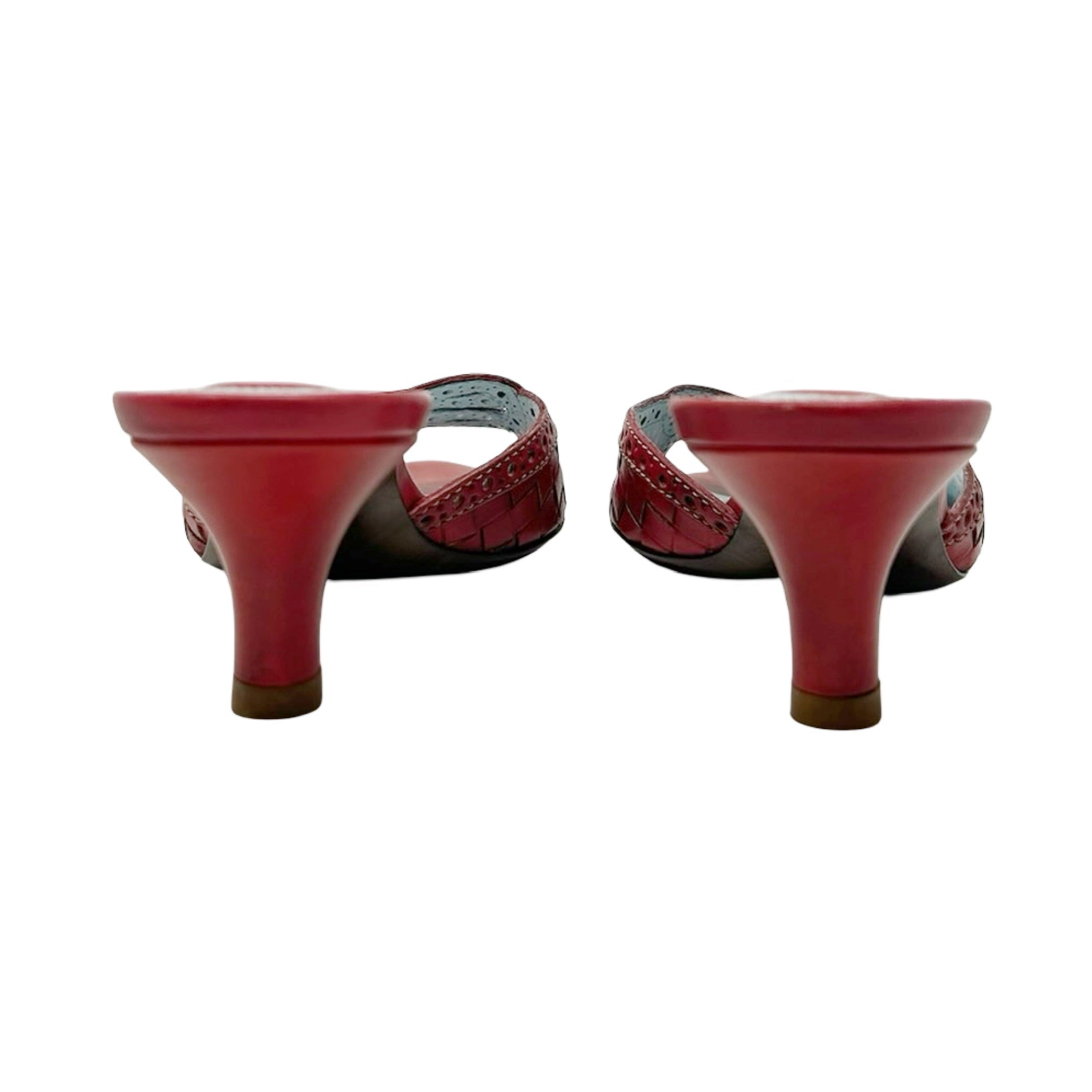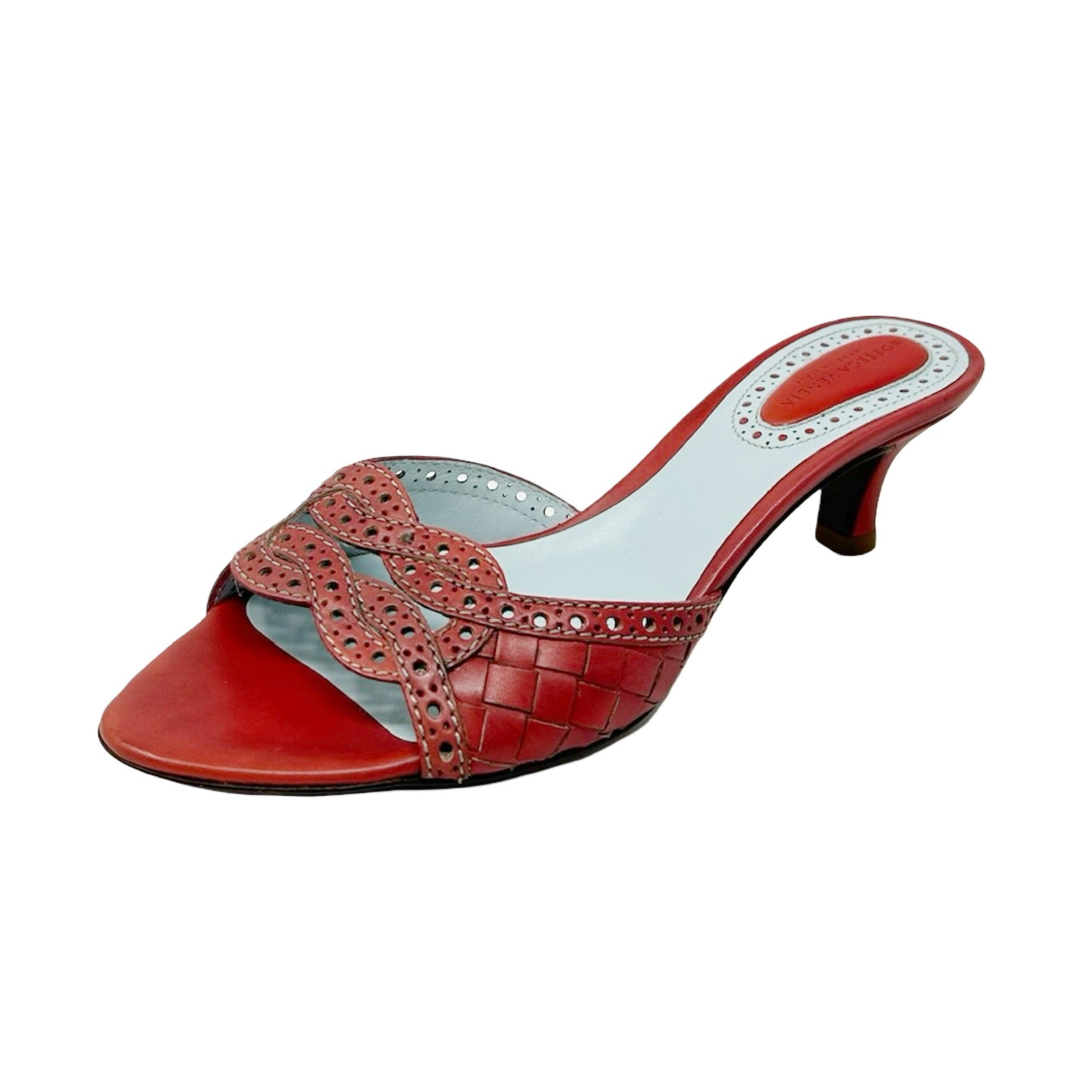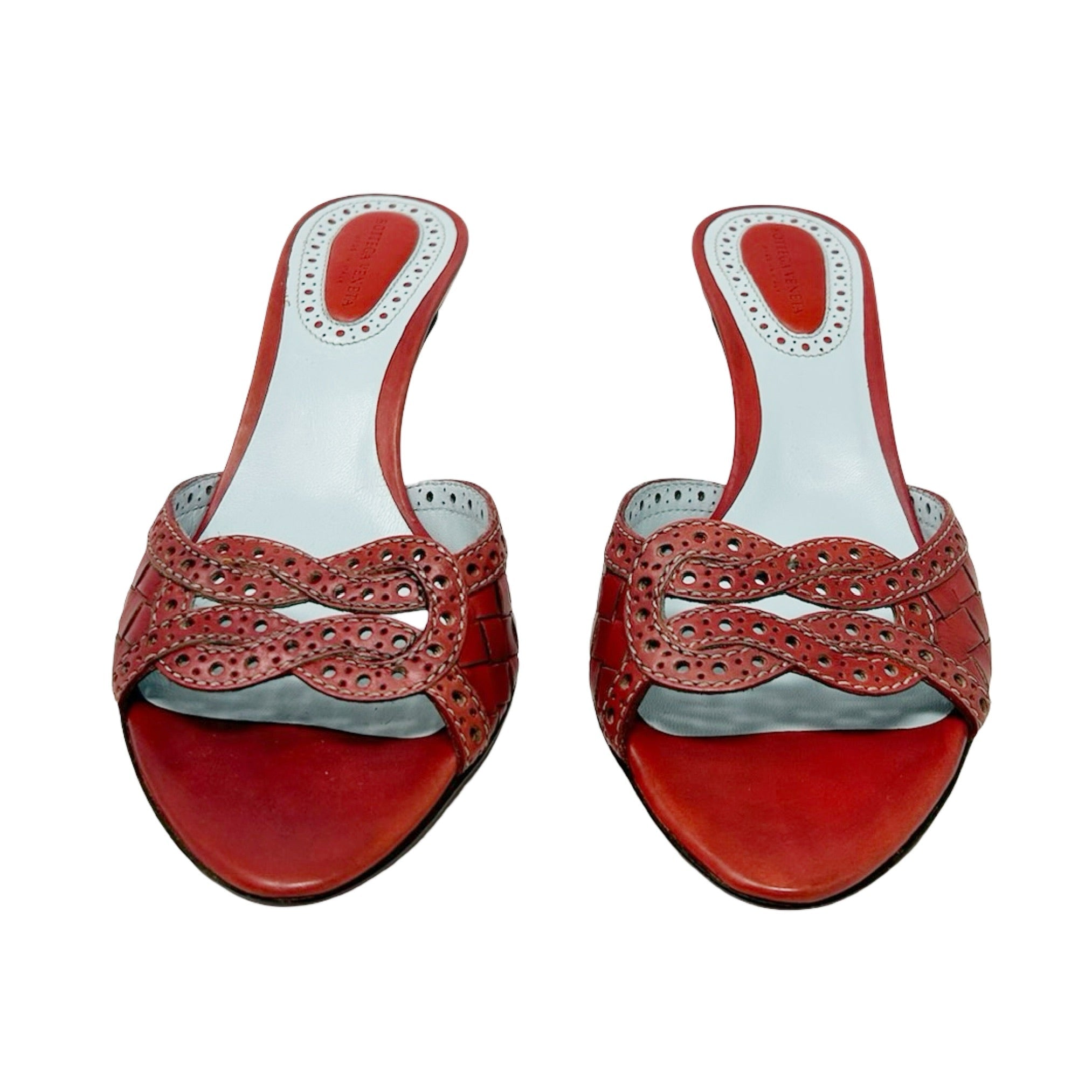 Description - Early 2000's red leather Bottega Veneta Intrecciato weave sandals with semi-pointed toes, baby blue leather insoles, white whipstitch trim; punched embellishments throughout leather, covered tonal heels, and woven knot detail at toe.