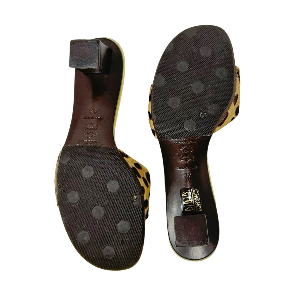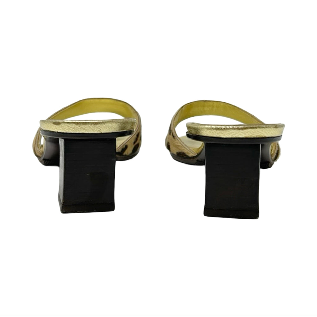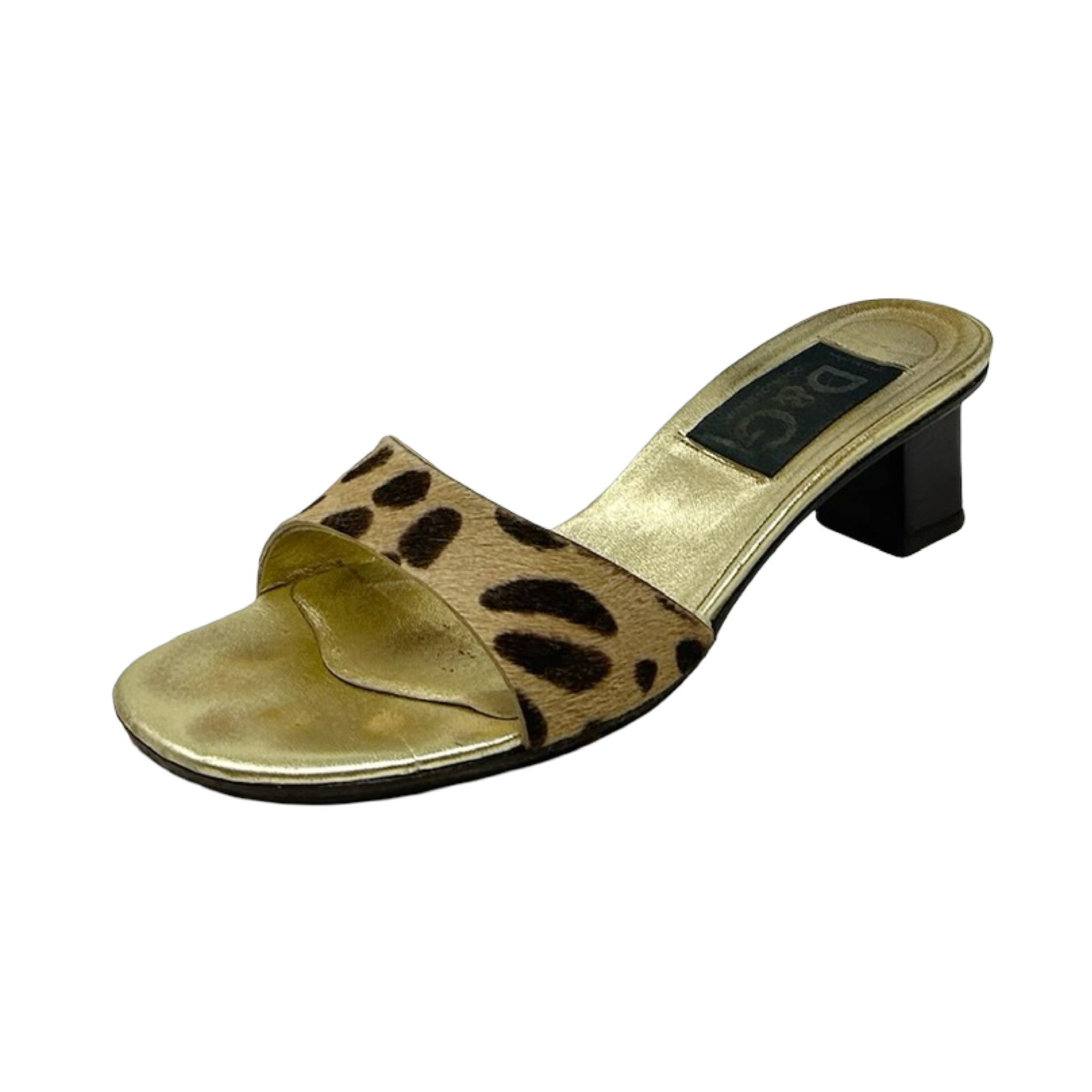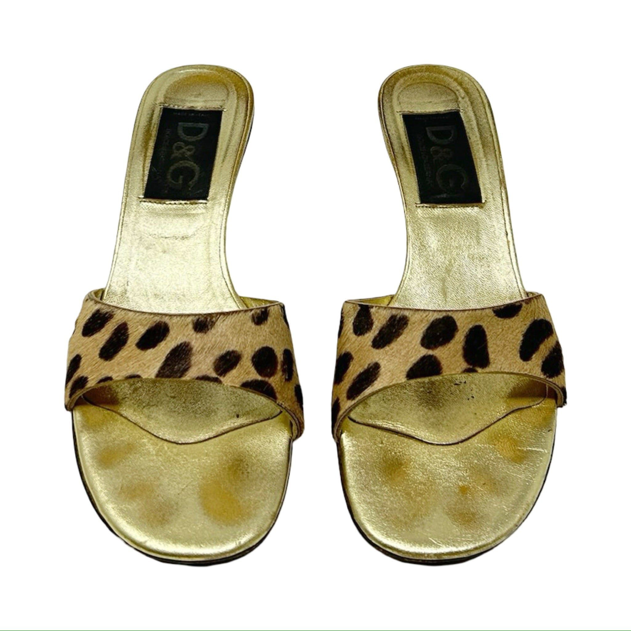 Description - Vintage Dolce & Gabbana animal print pony hair mules with single toe strap, gold toned leather insole, rounded toes and stacked wooden heels.