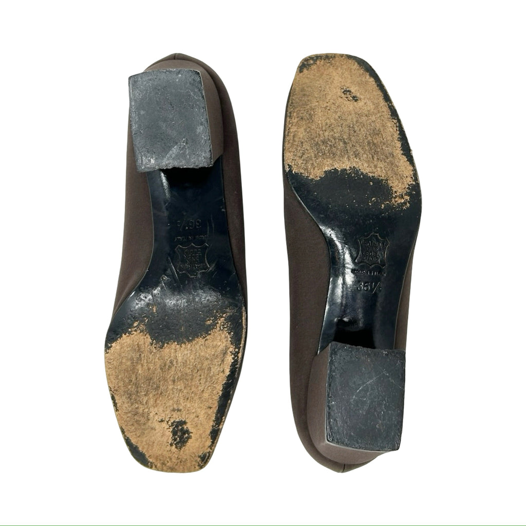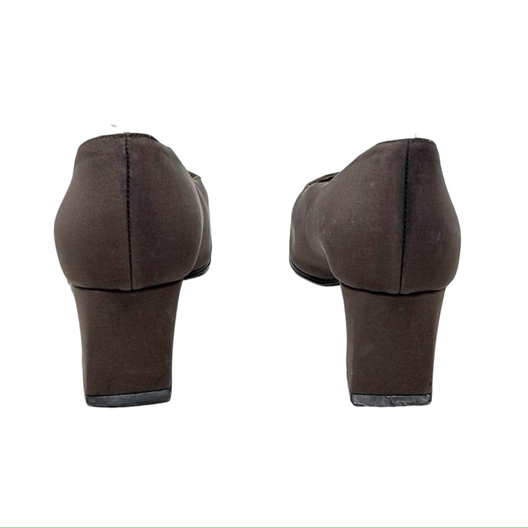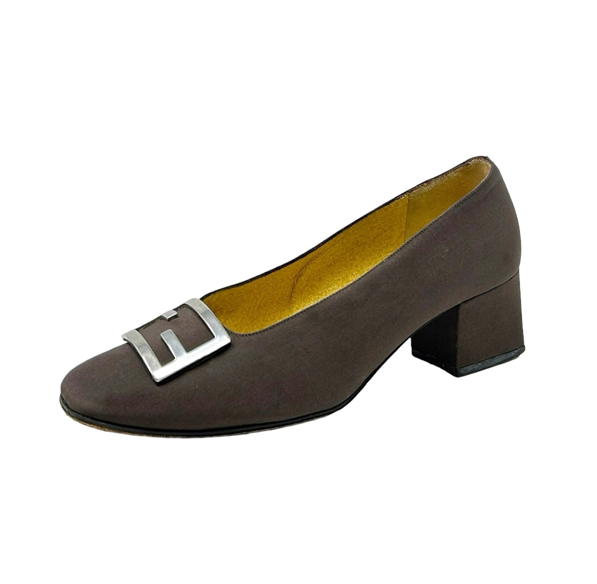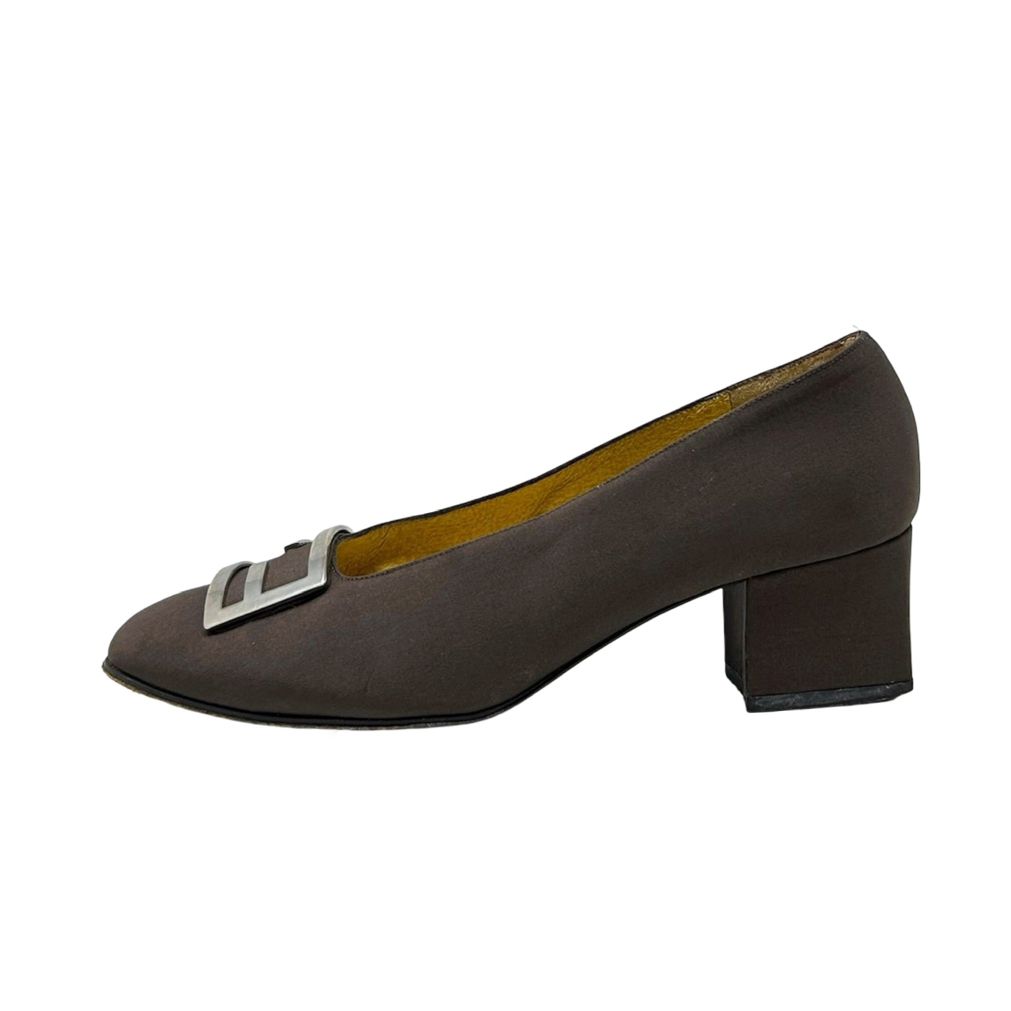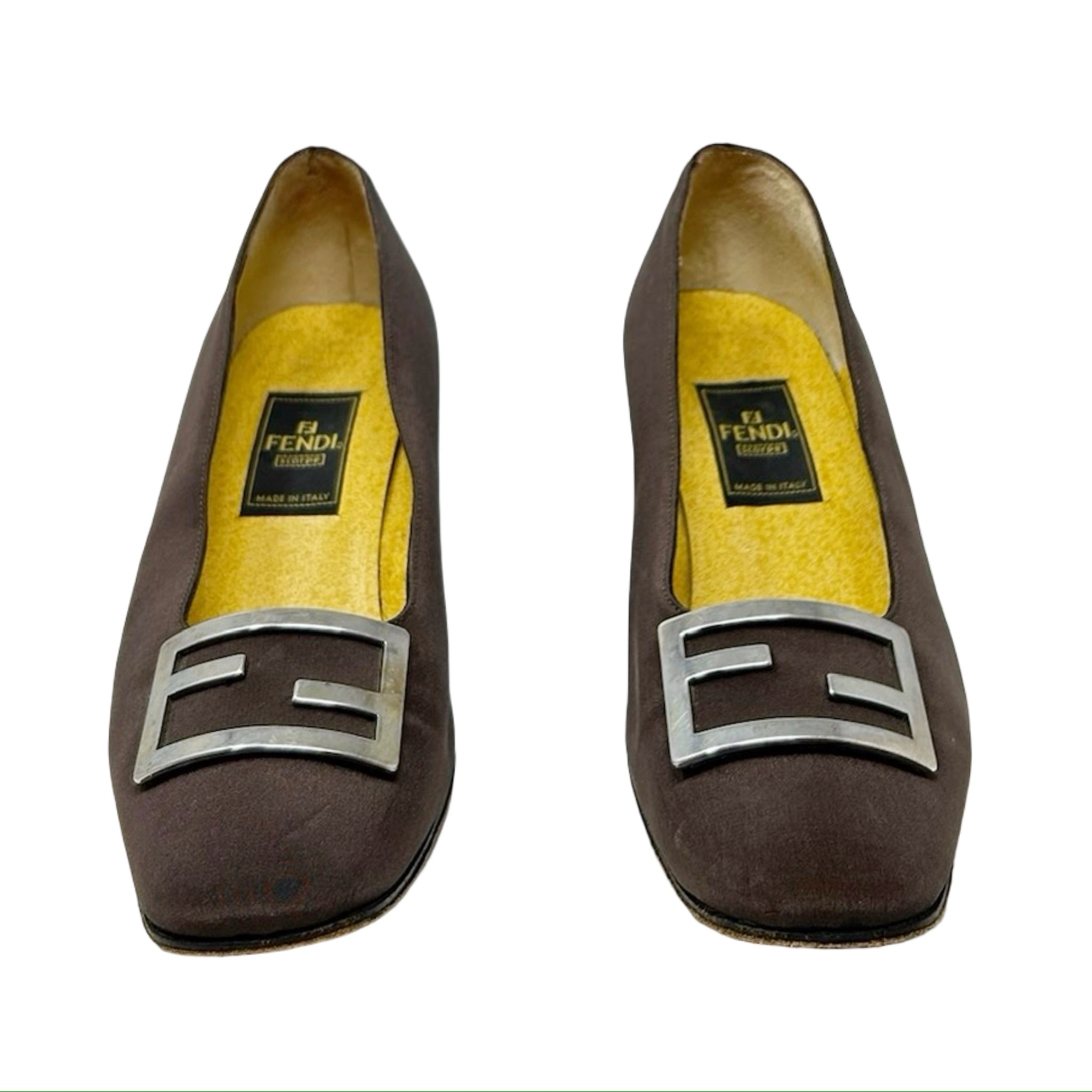 Description - Fendi brown satin pumps with gunmetal toned FF logo plate at toes, rounded toes, and covered heels.