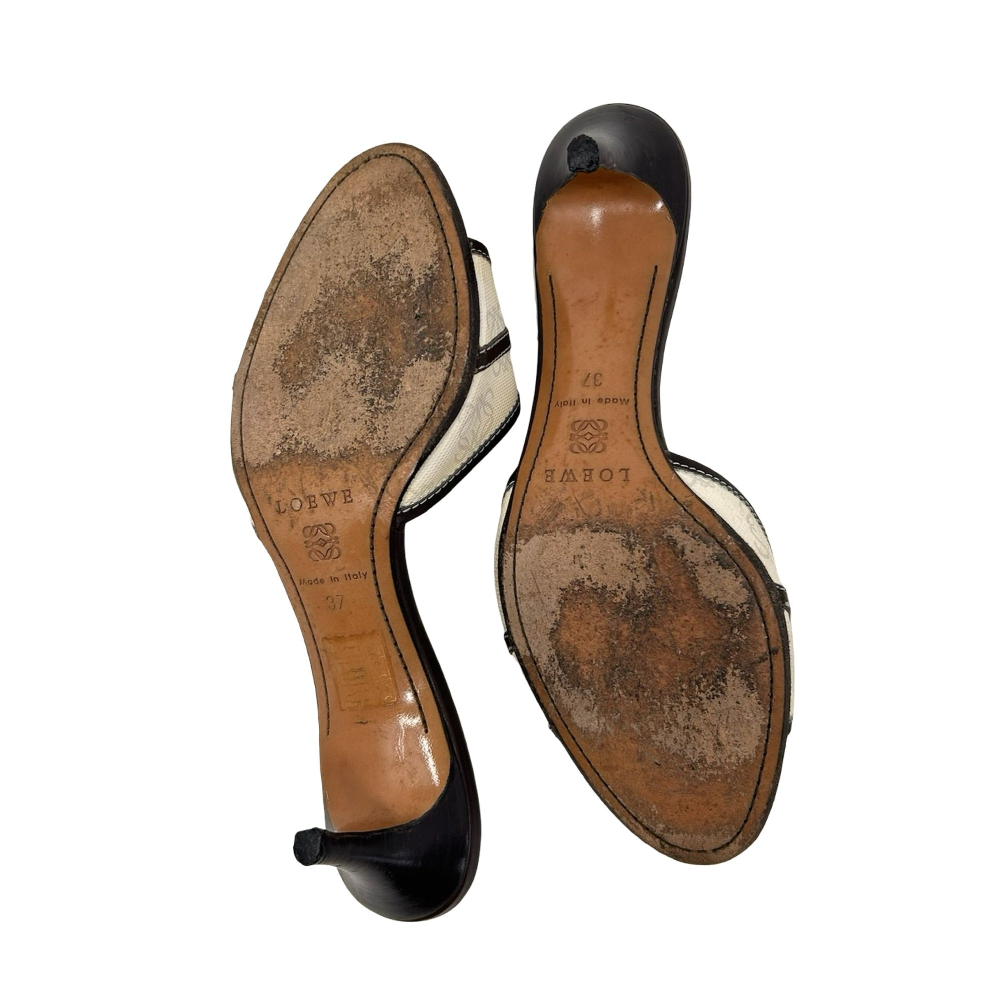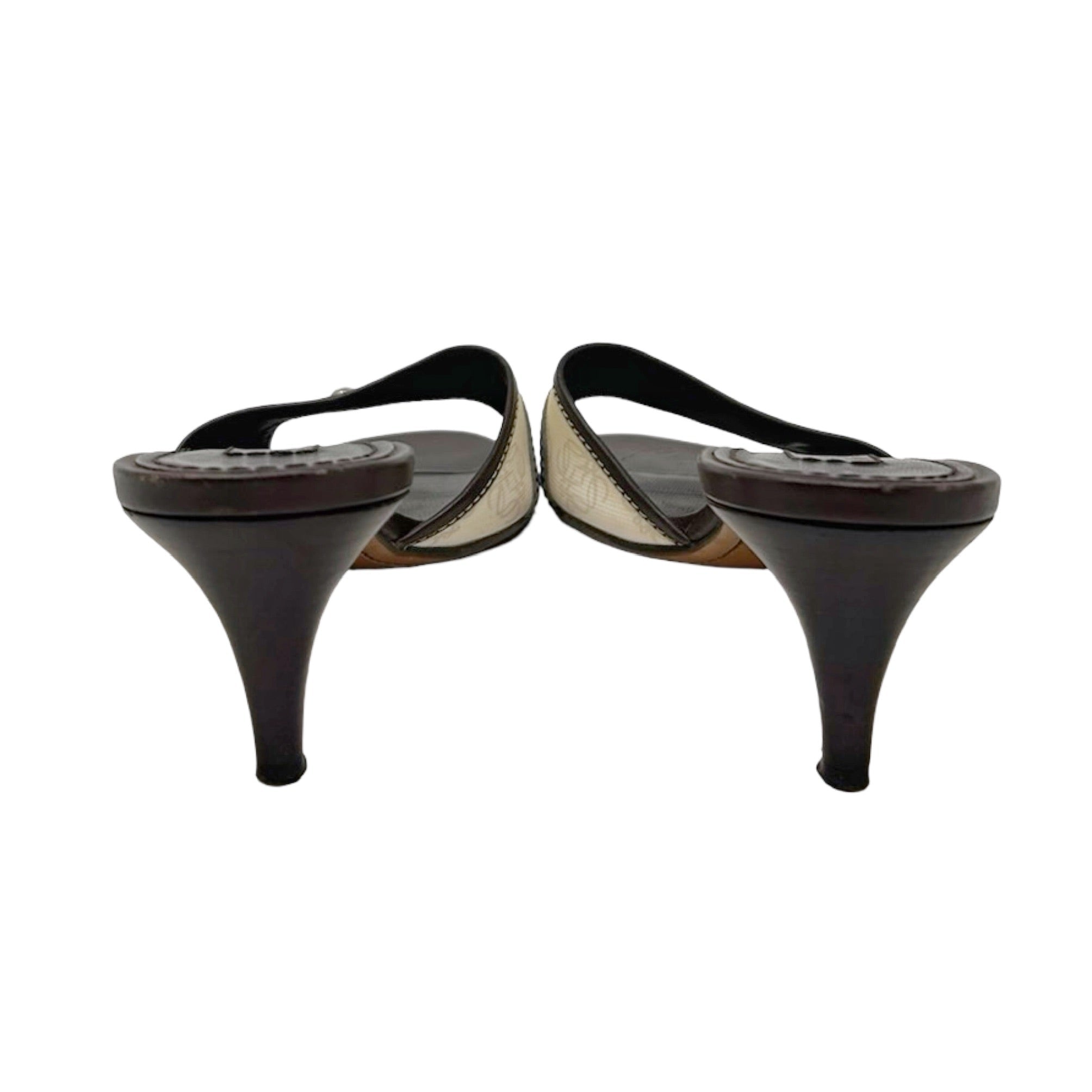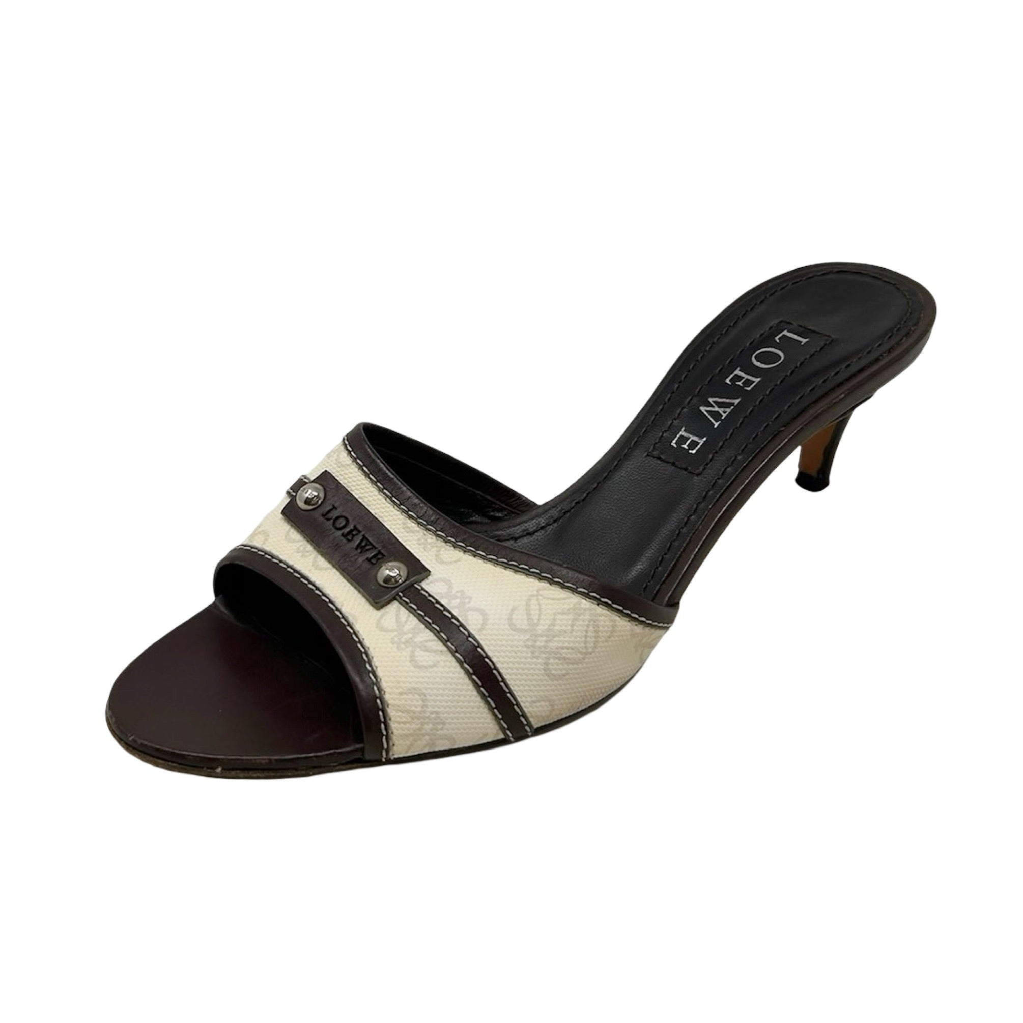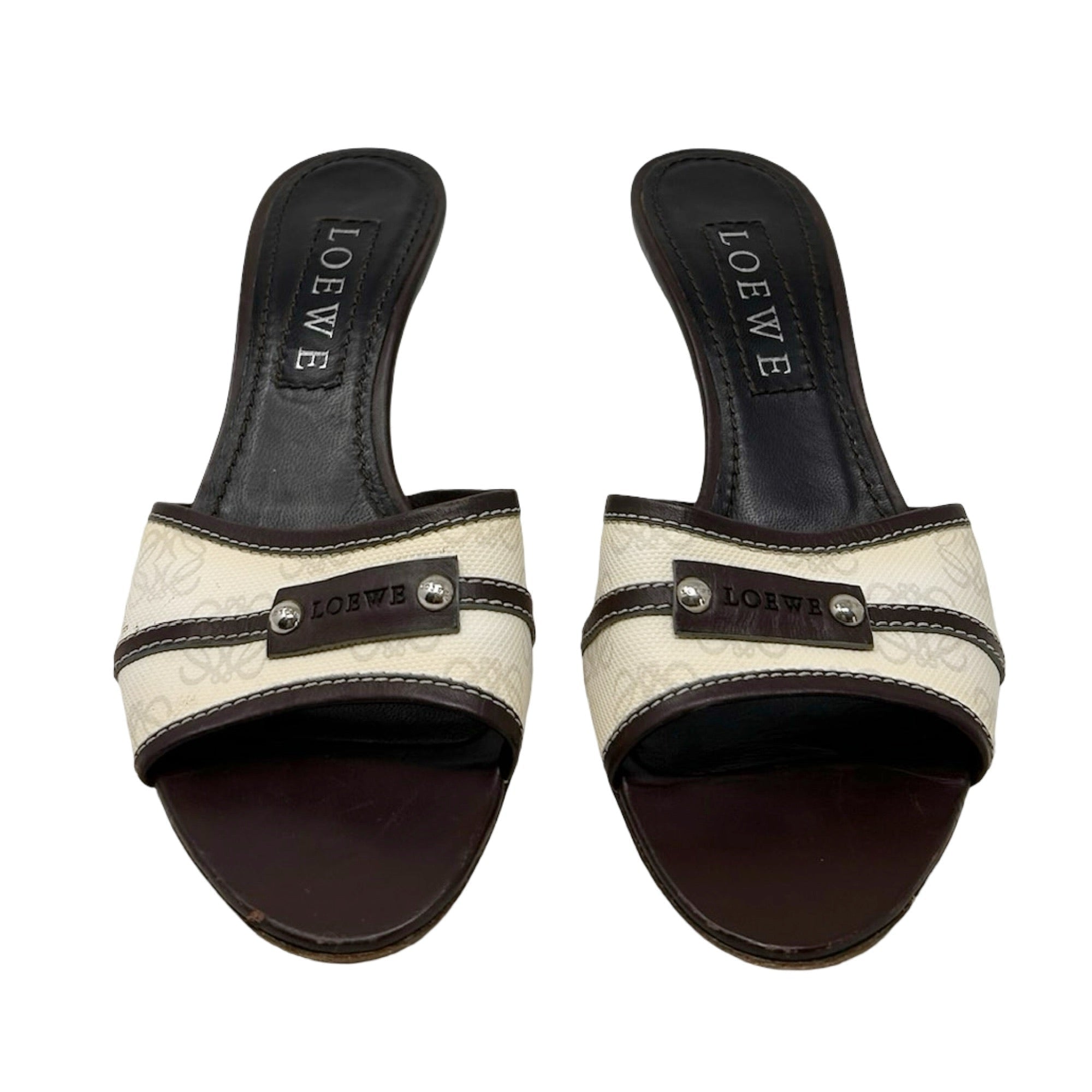 Description - Early 2000's off-white anagram canvas Loewe sandals with stacked wood heels, brown leather trim/embellishments, silver tone hardware, leather logo plate detail with stud embellishments, and rounded toes.