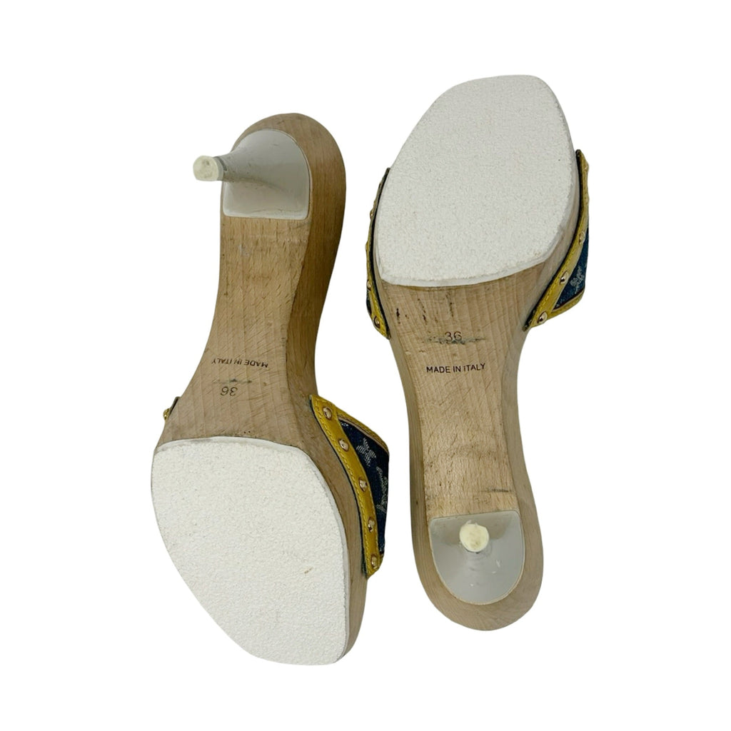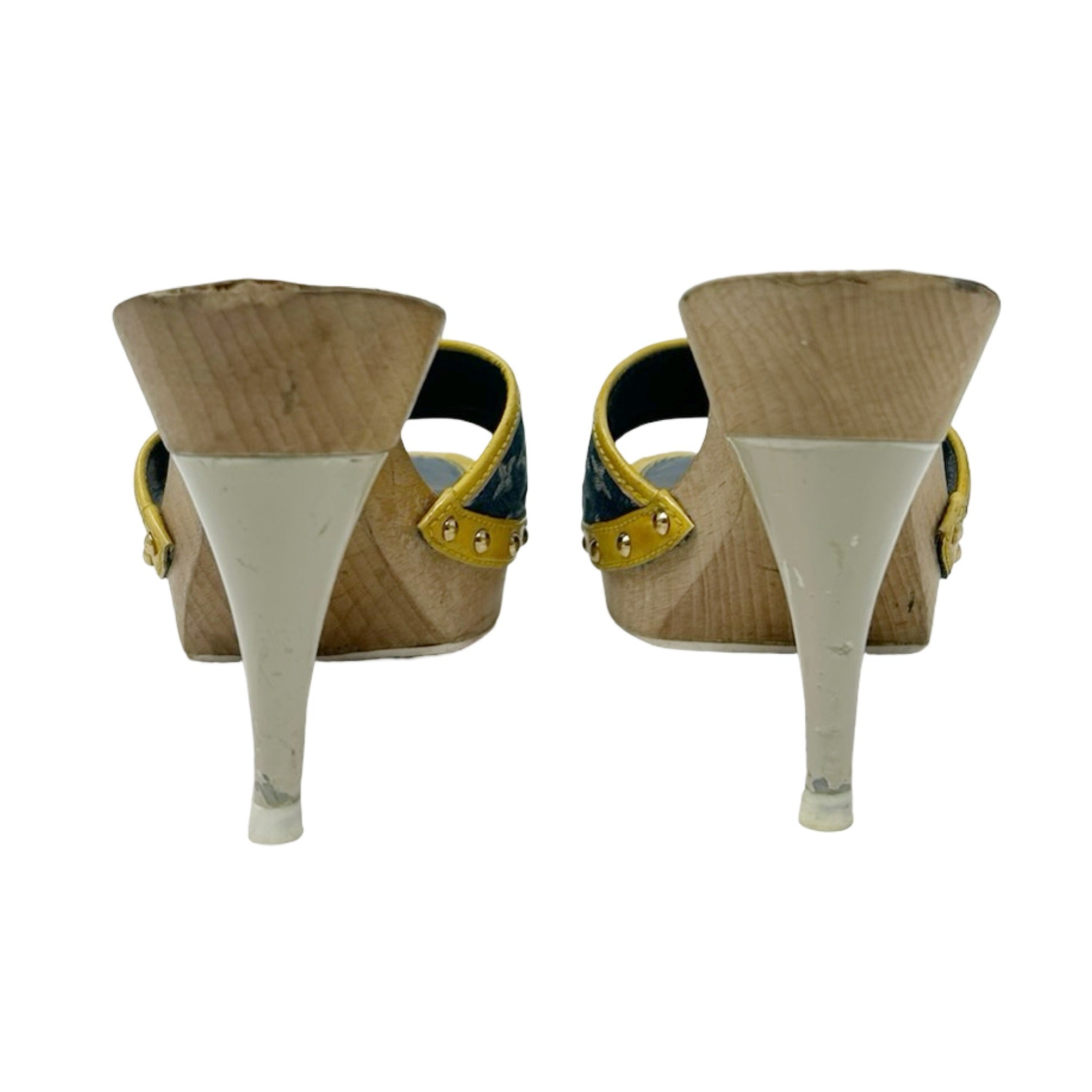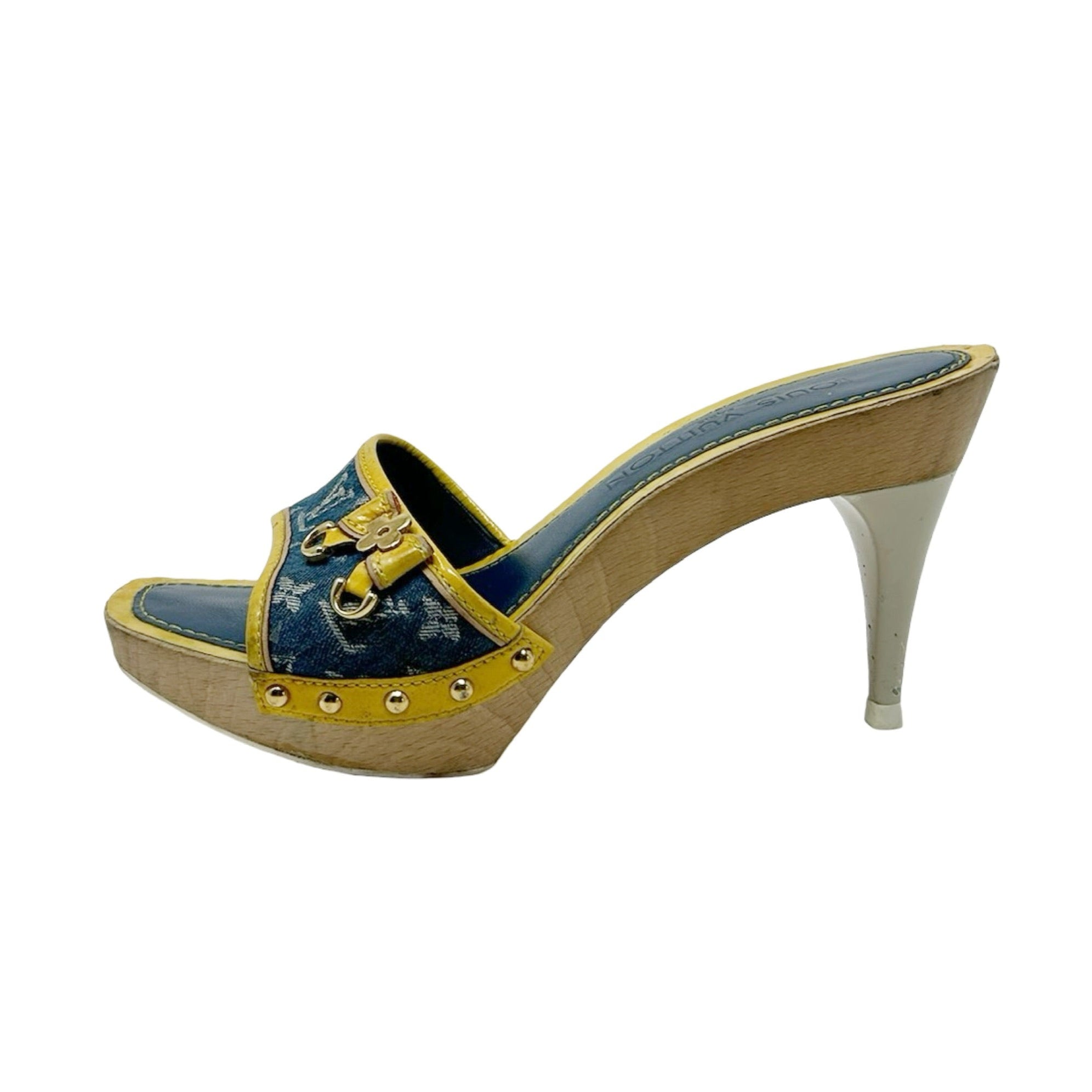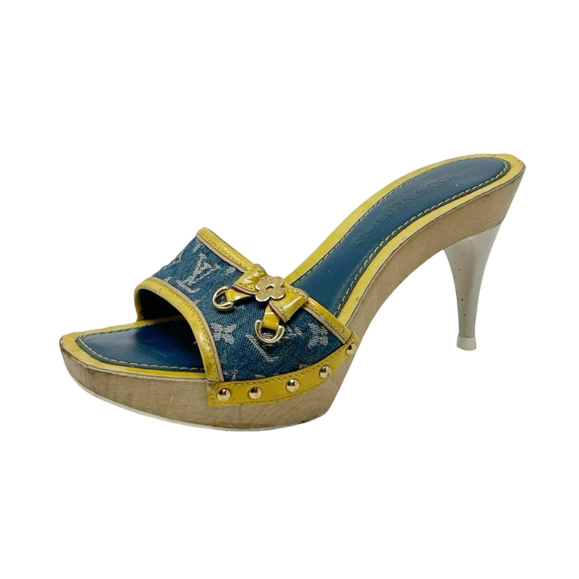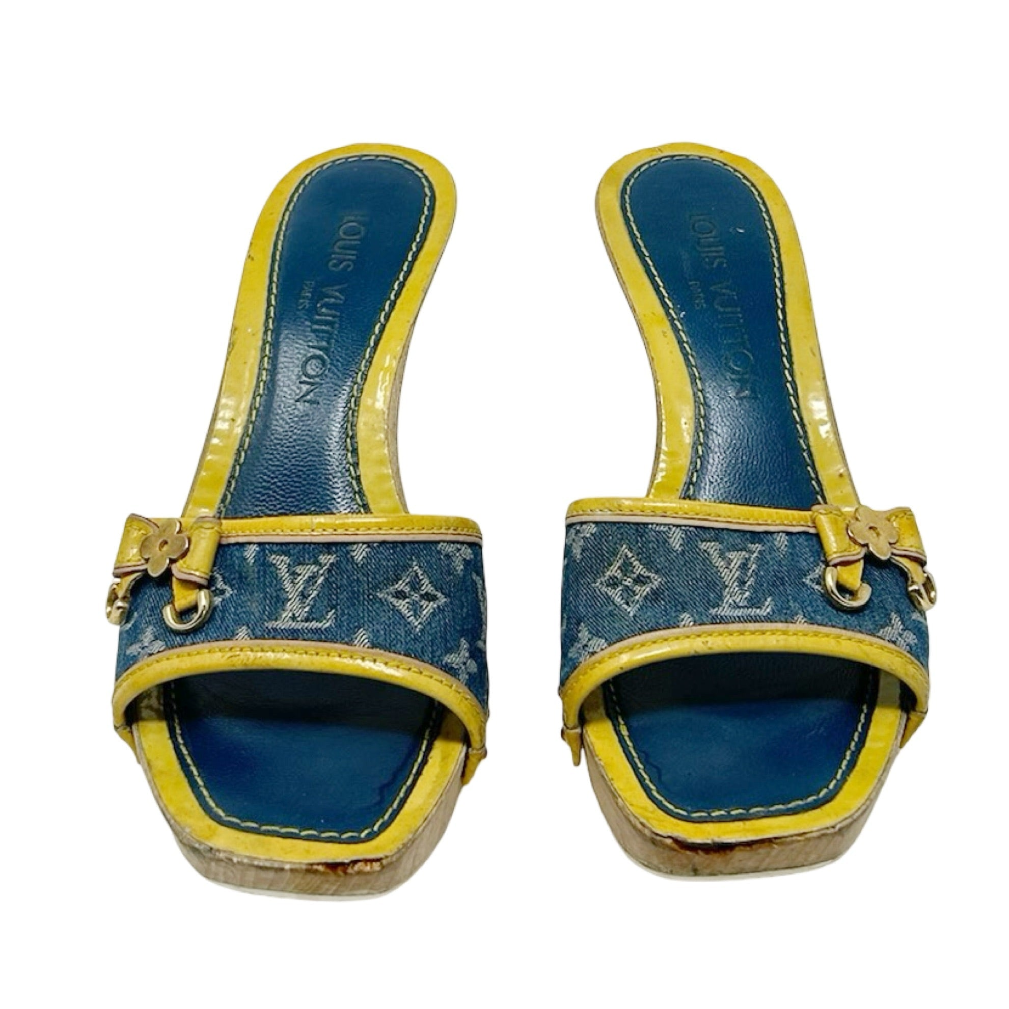 Description - Early 2000's blue denim Louis Vuitton monogram sandals with LV monogram throughout, yellow leather trim/embellishments, wooden sole, gold tone hardware, flower logo bow detail at toe strap, semi square toes, and coated neutral heels.