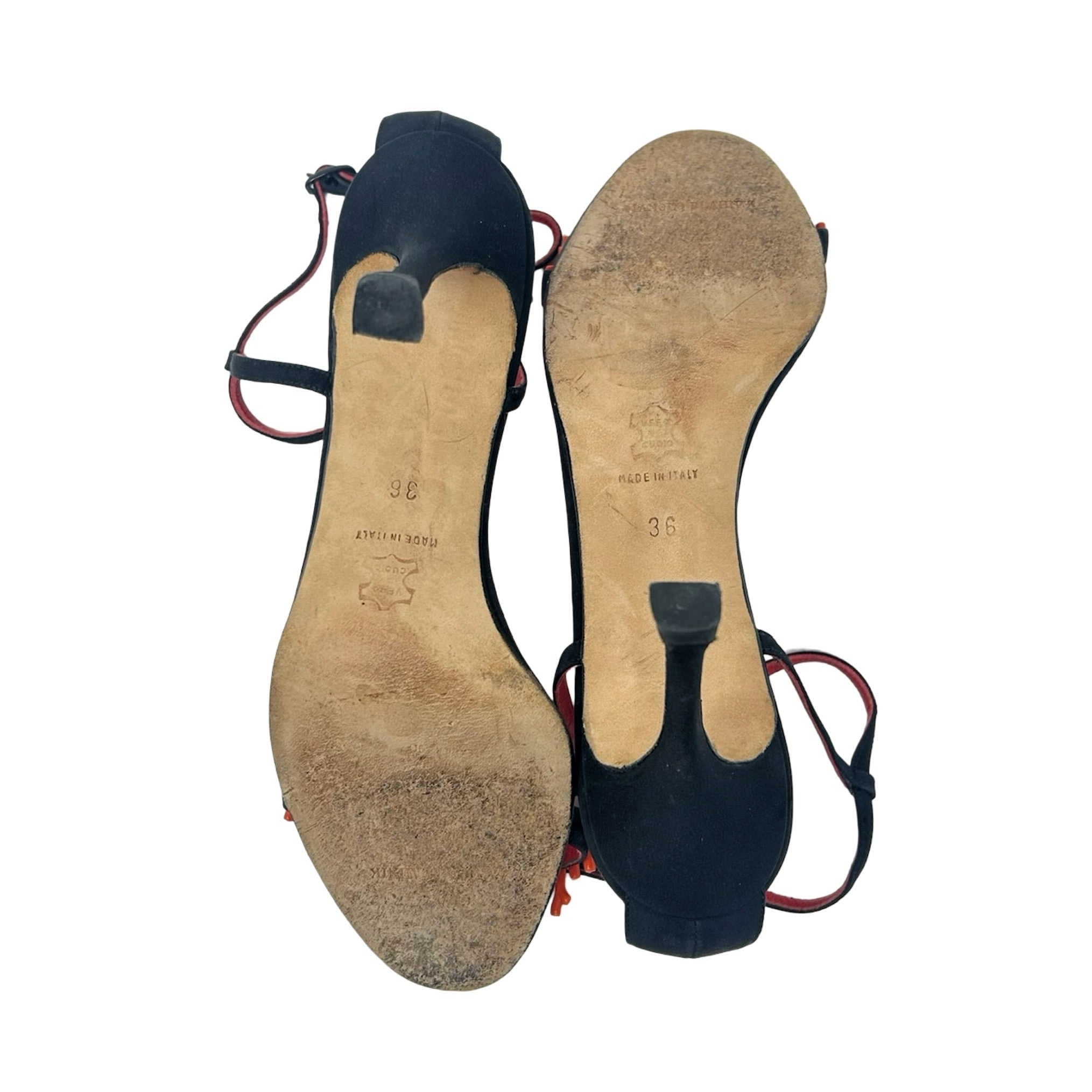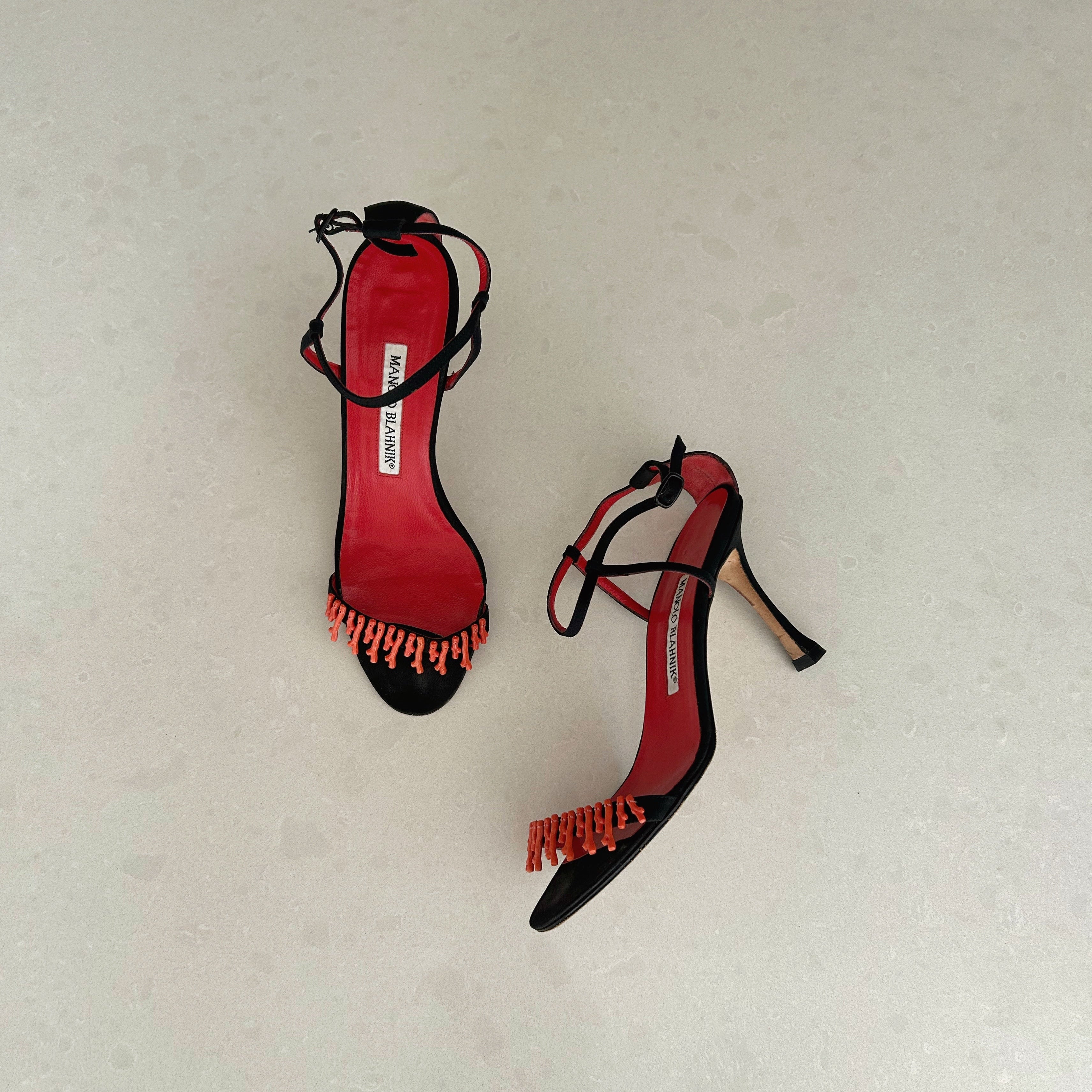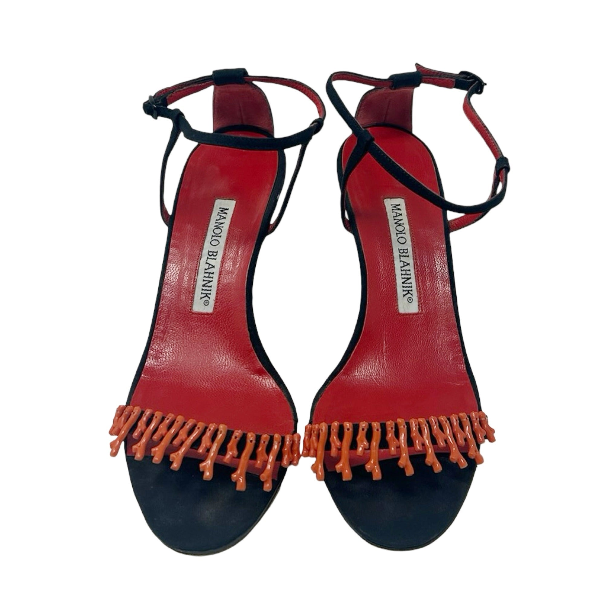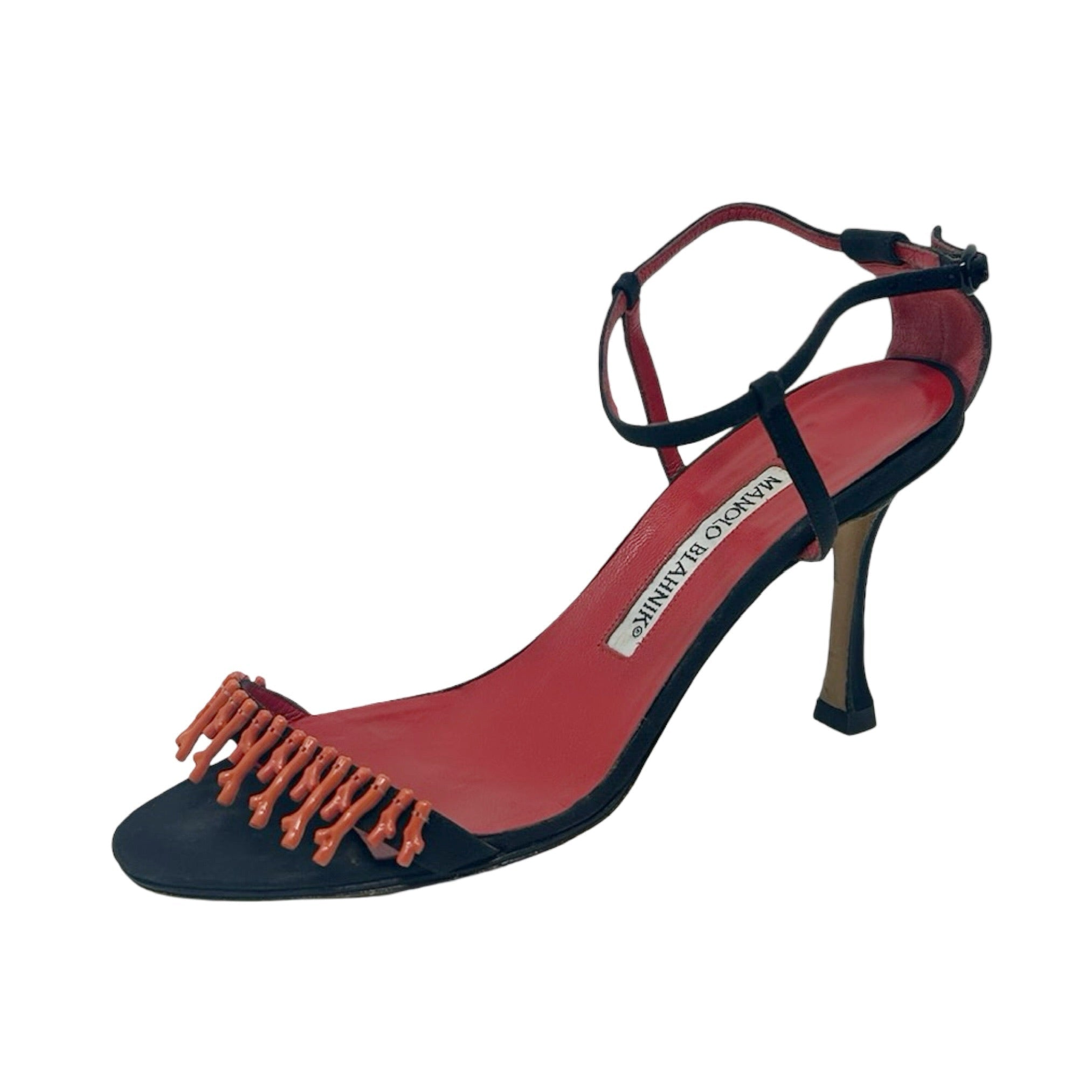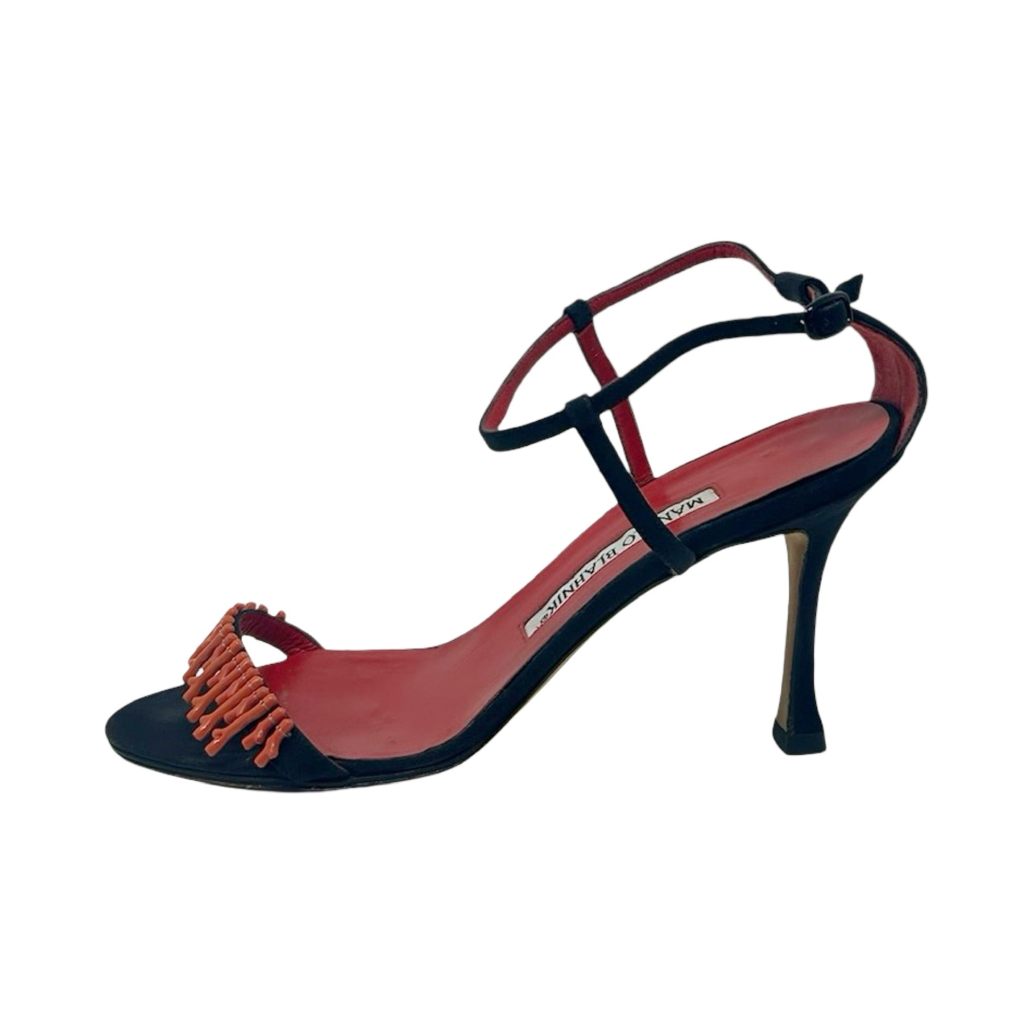 Description - Early 2000's black canvas Manolo Blahnik Coraletta sandals with red coral beading at toe strap, adjustable ankle strap, covered tonal heels and round toes.