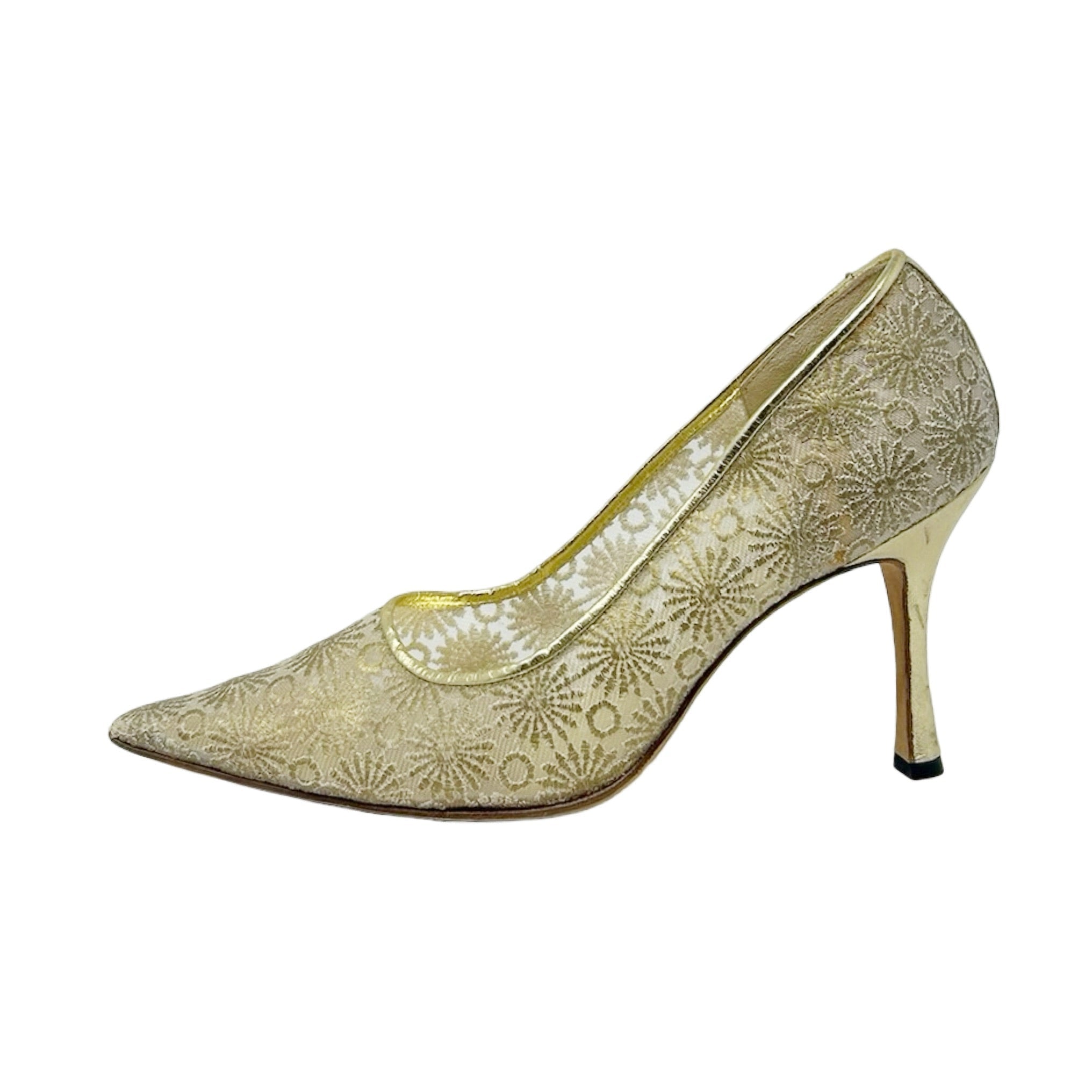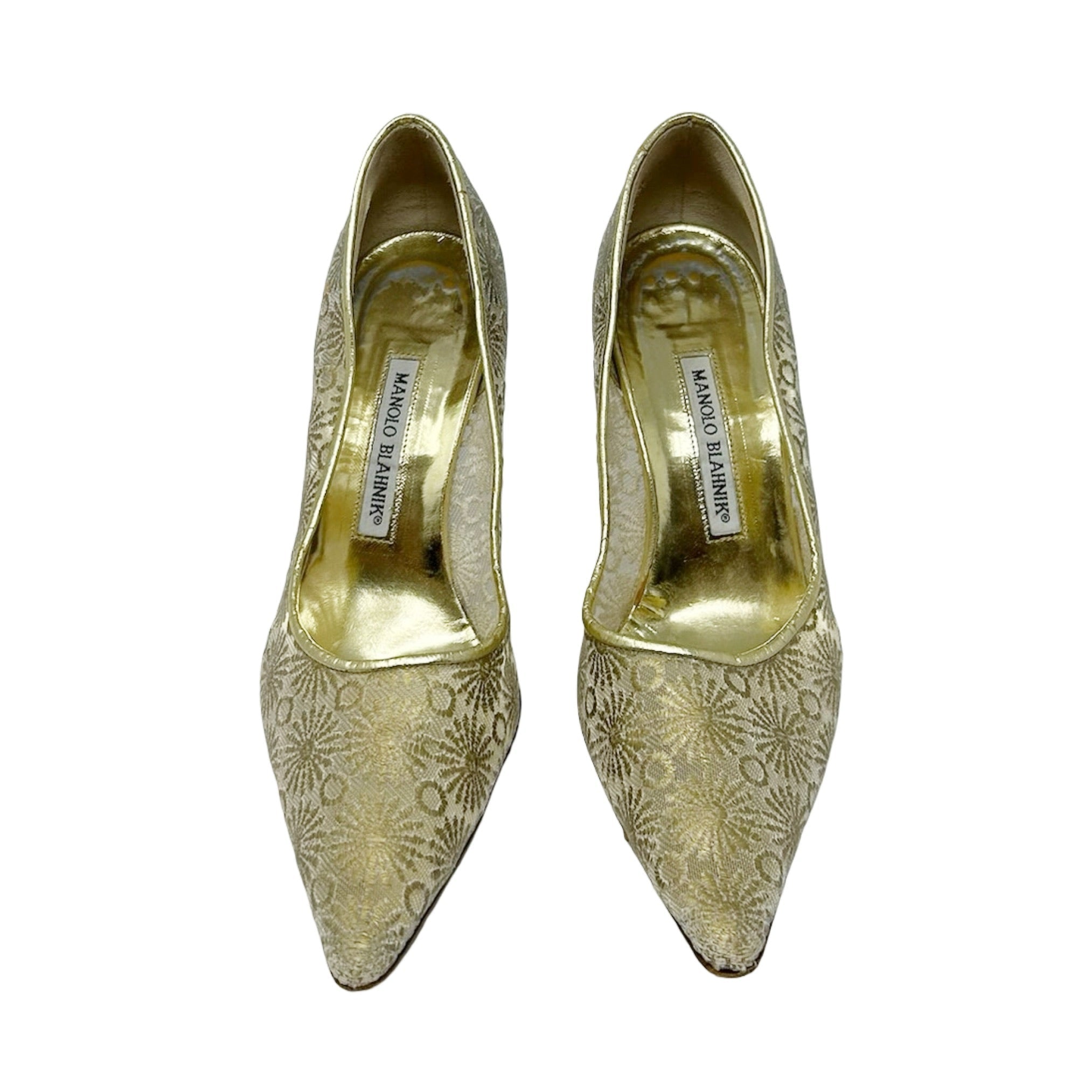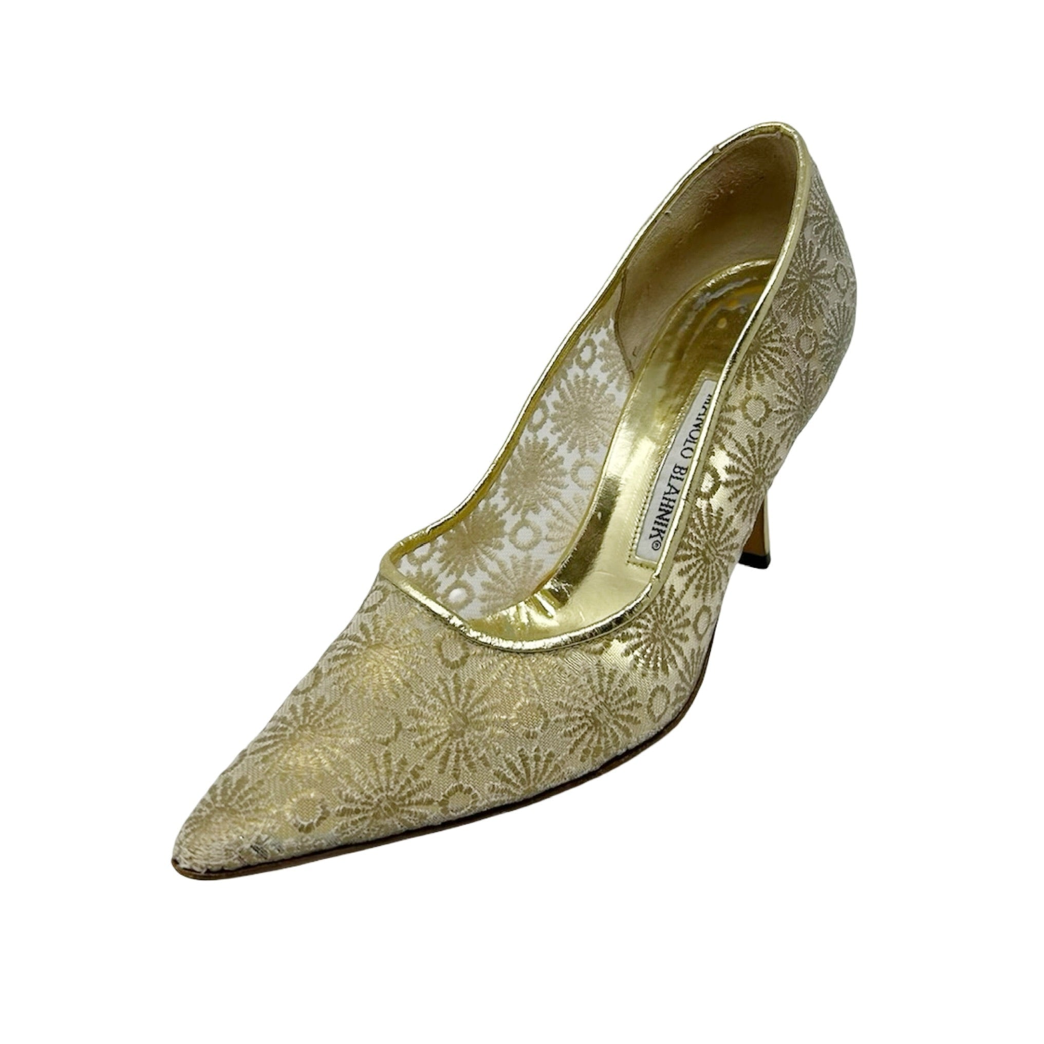 Description - Early 2000's metallic floral mesh Manolo Blahnik pumps with gold tone leather trim, leather covered heels and pointed toes.