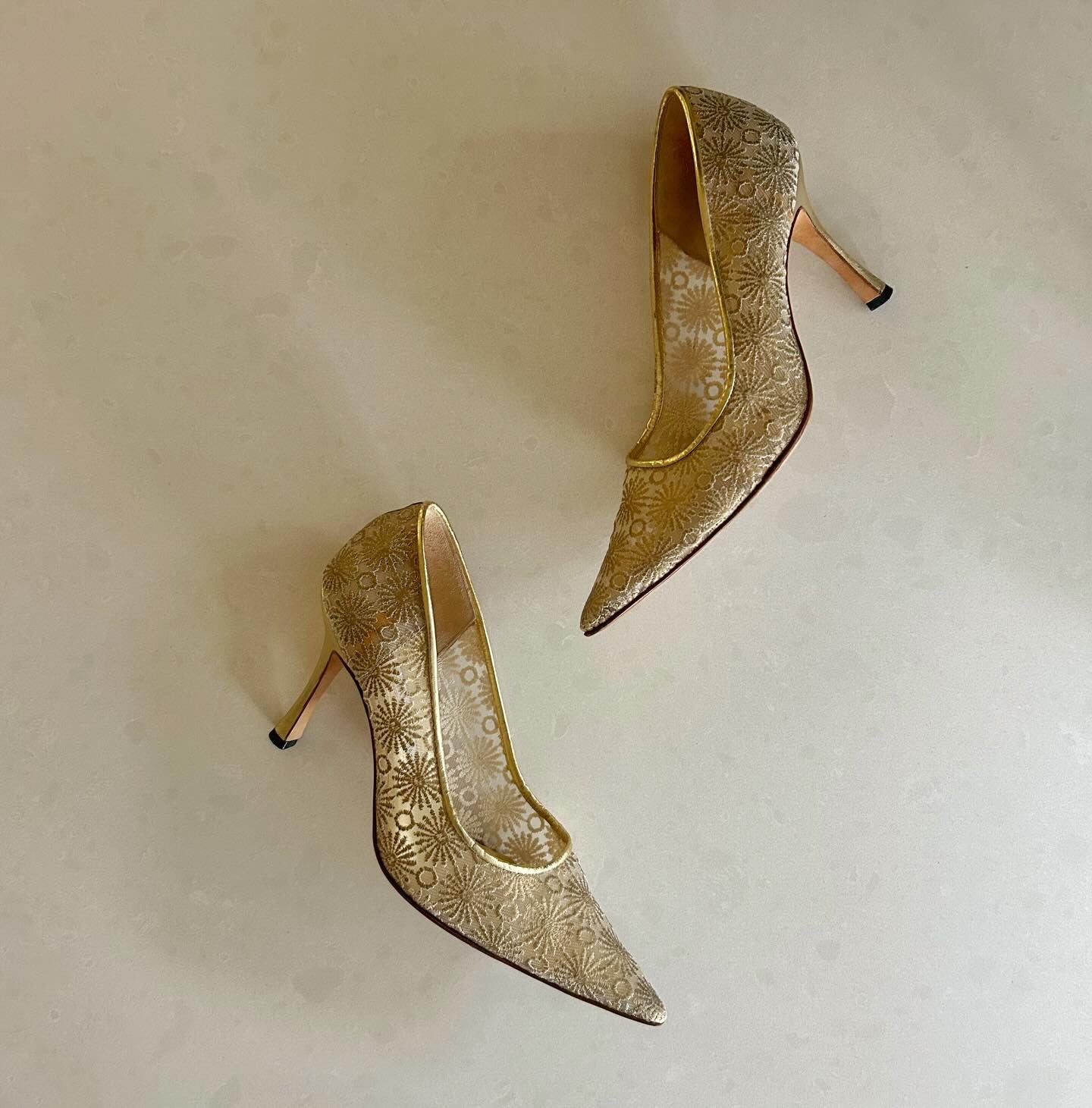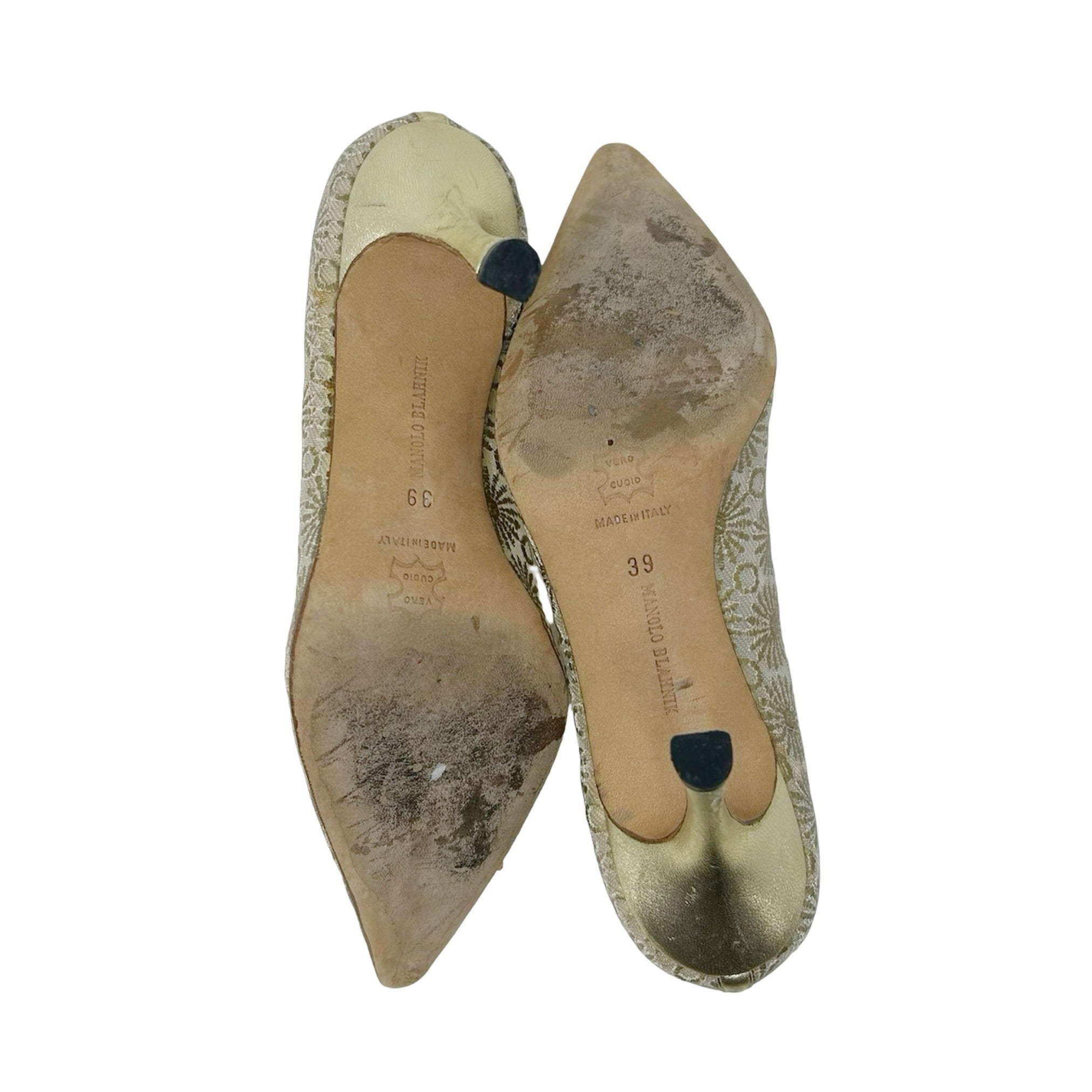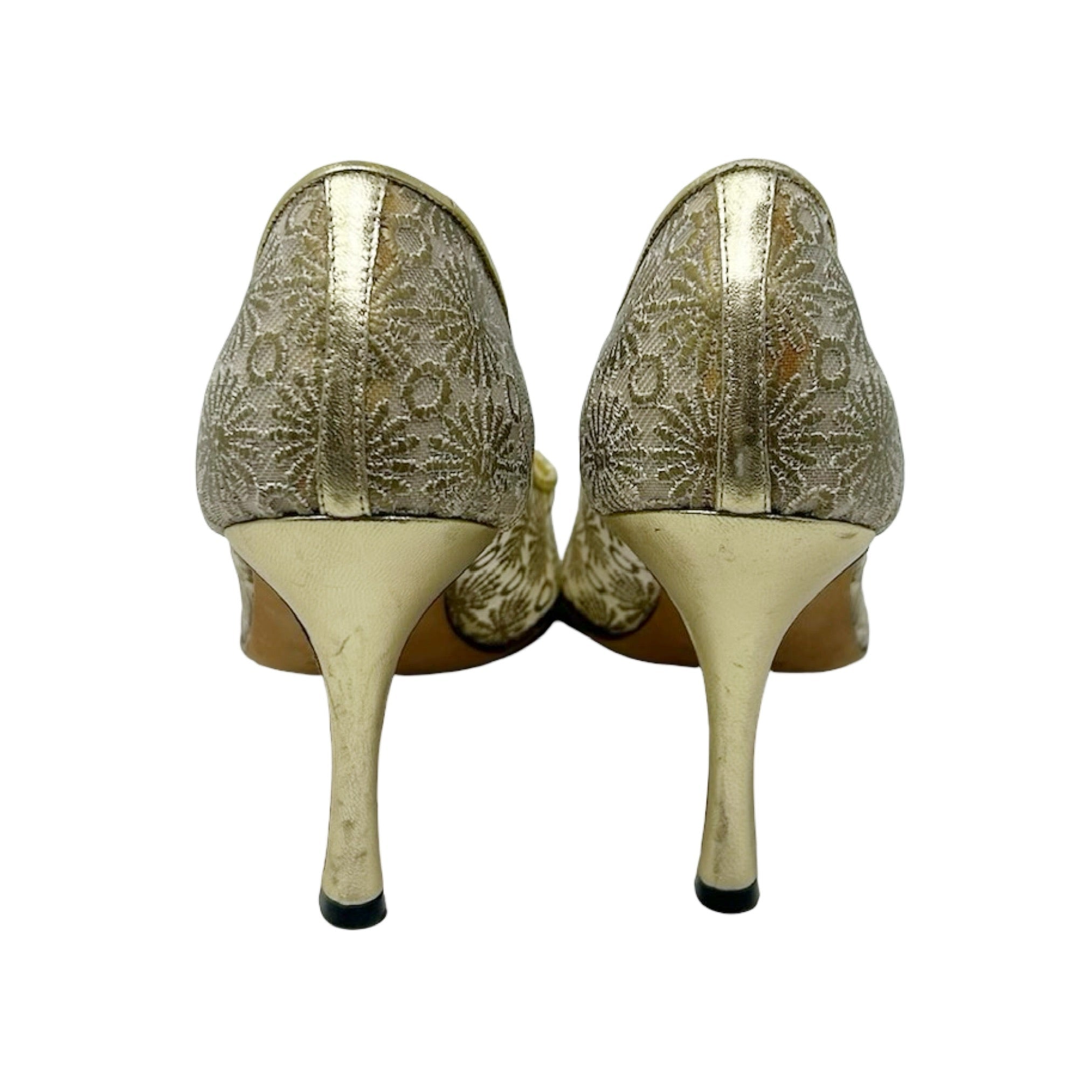 Description - Early 2000's metallic floral mesh Manolo Blahnik pumps with gold tone leather trim, leather covered heels and pointed toes.