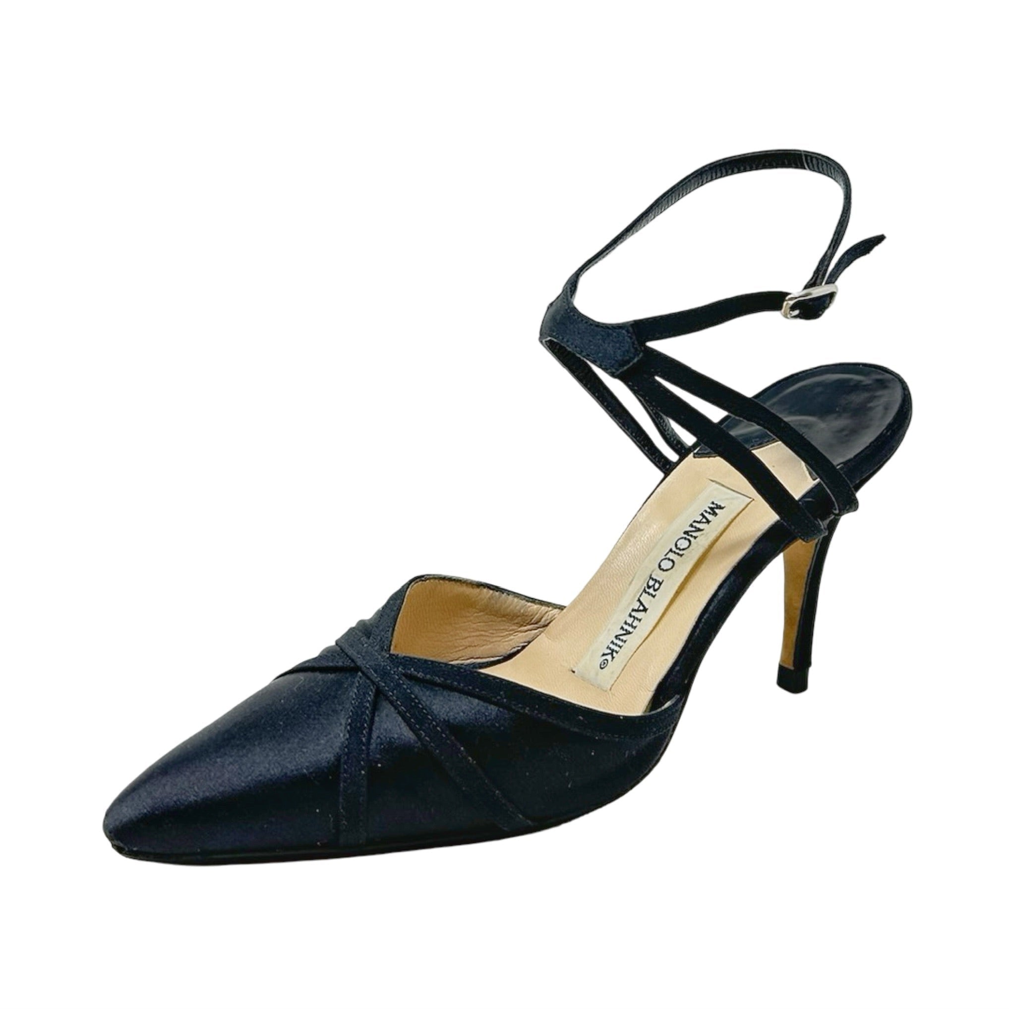 Description - Vintage black satin Manolo Blahnik pumps featuring pointed toes, covered heels, wrap around ankle straps with buckle closure.
