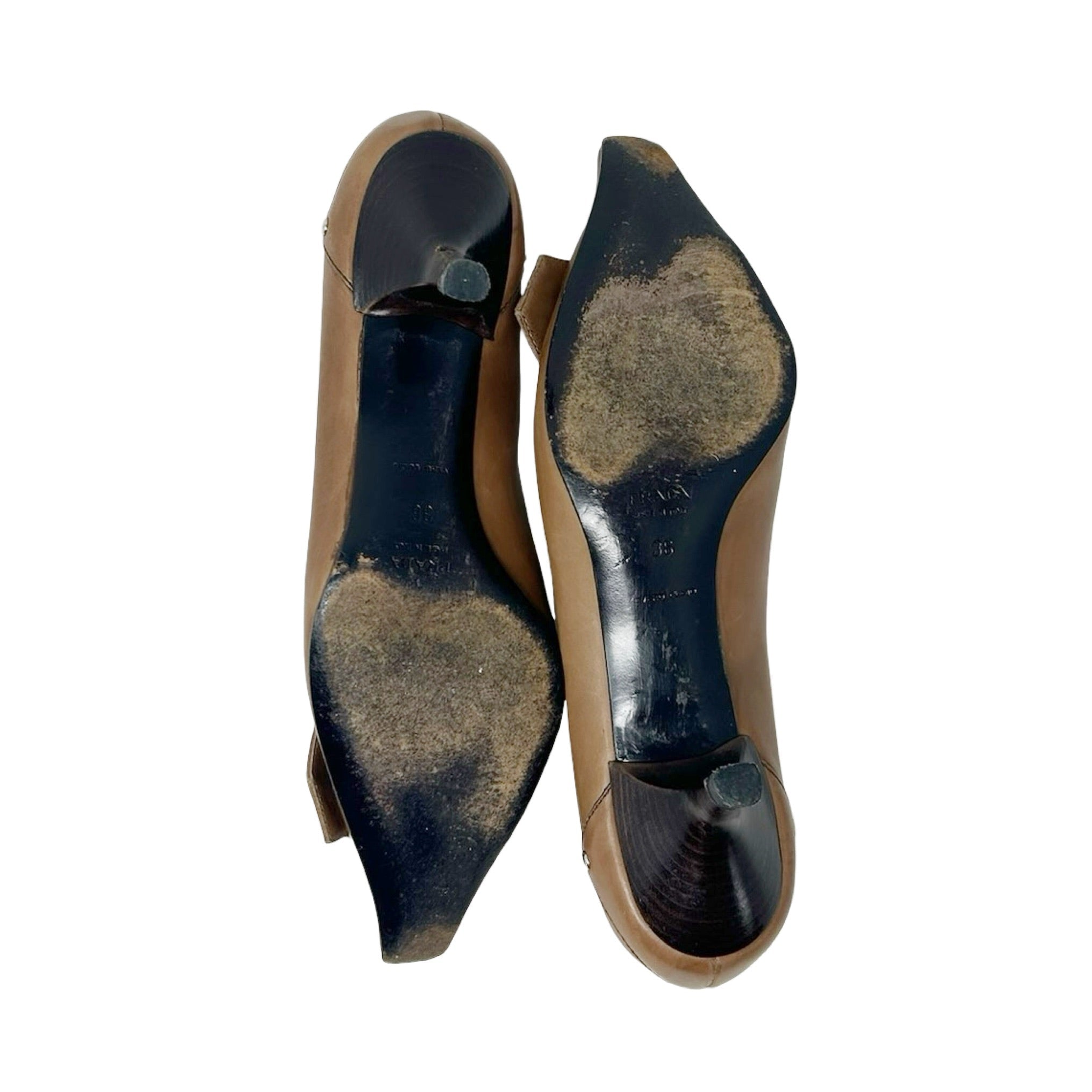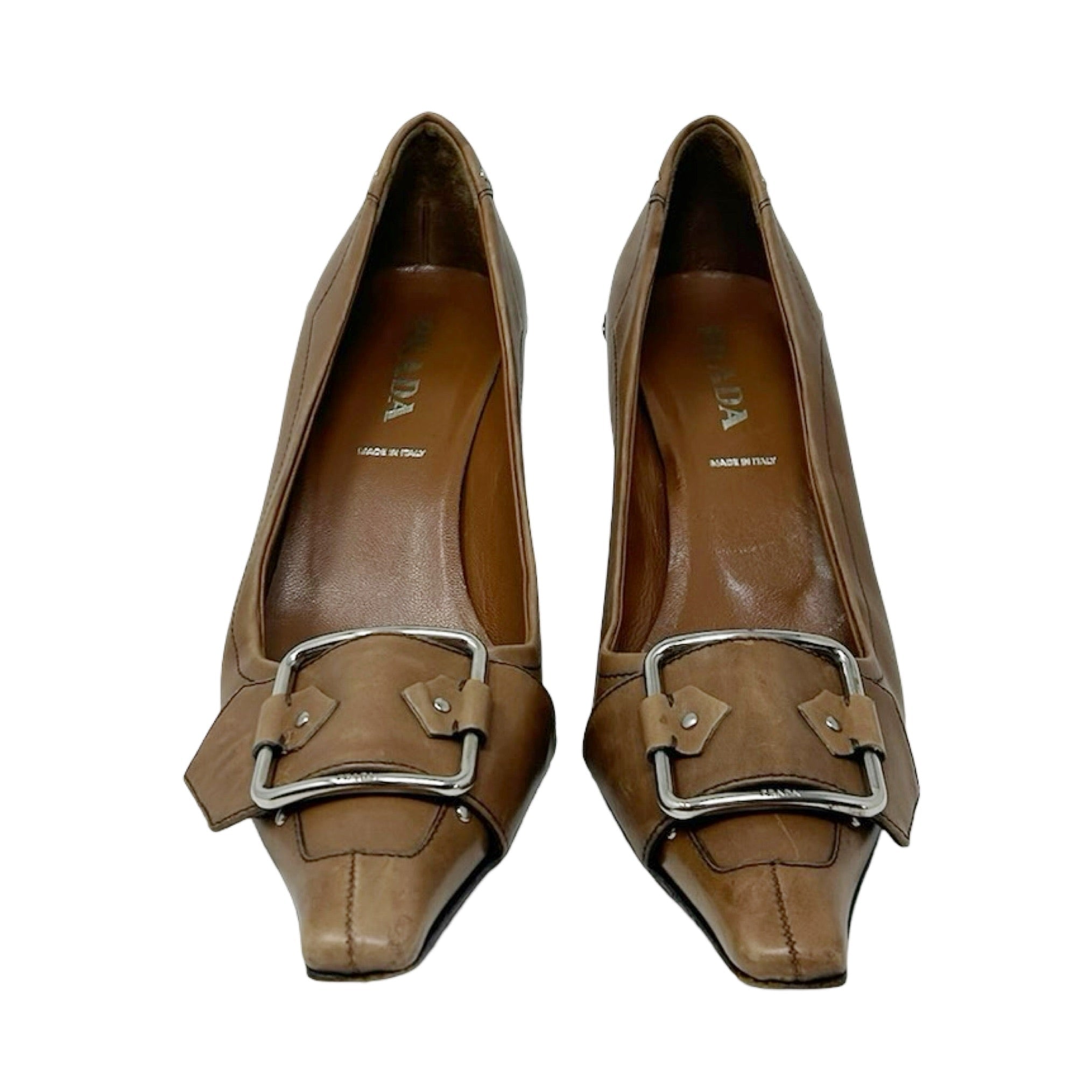 Description - Early 2000's tan leather Prada kitten heels with snip toes, silver tone hardware, logo embossed square buckle at toes, western stitching embellishment with studs, and stacked wood heels.