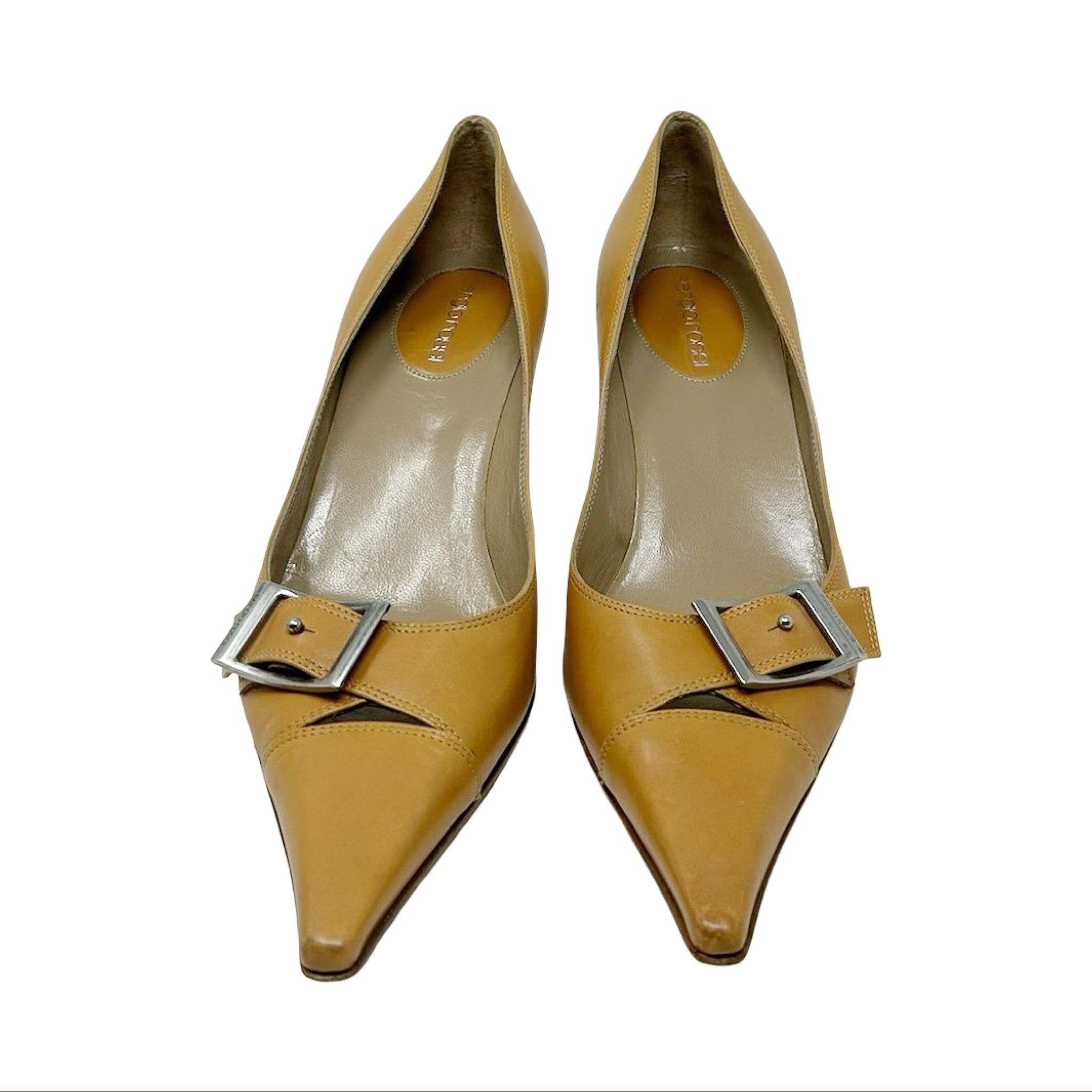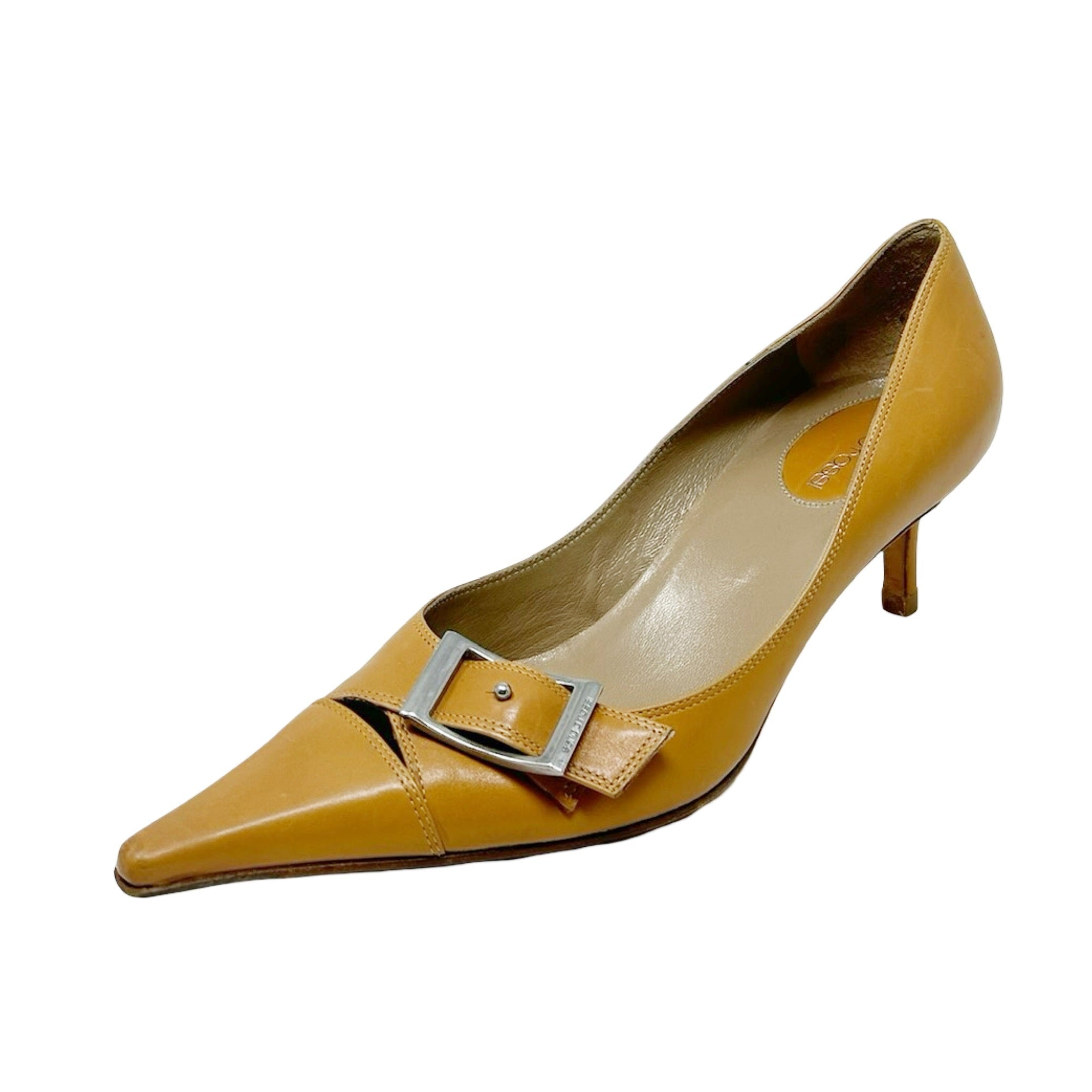 Description - Early 2000's tan leather Sergio Rossi pointed toe pumps with covered leather heels, cut out detail at toes, silver tone hardware and logo embossed buckle details.