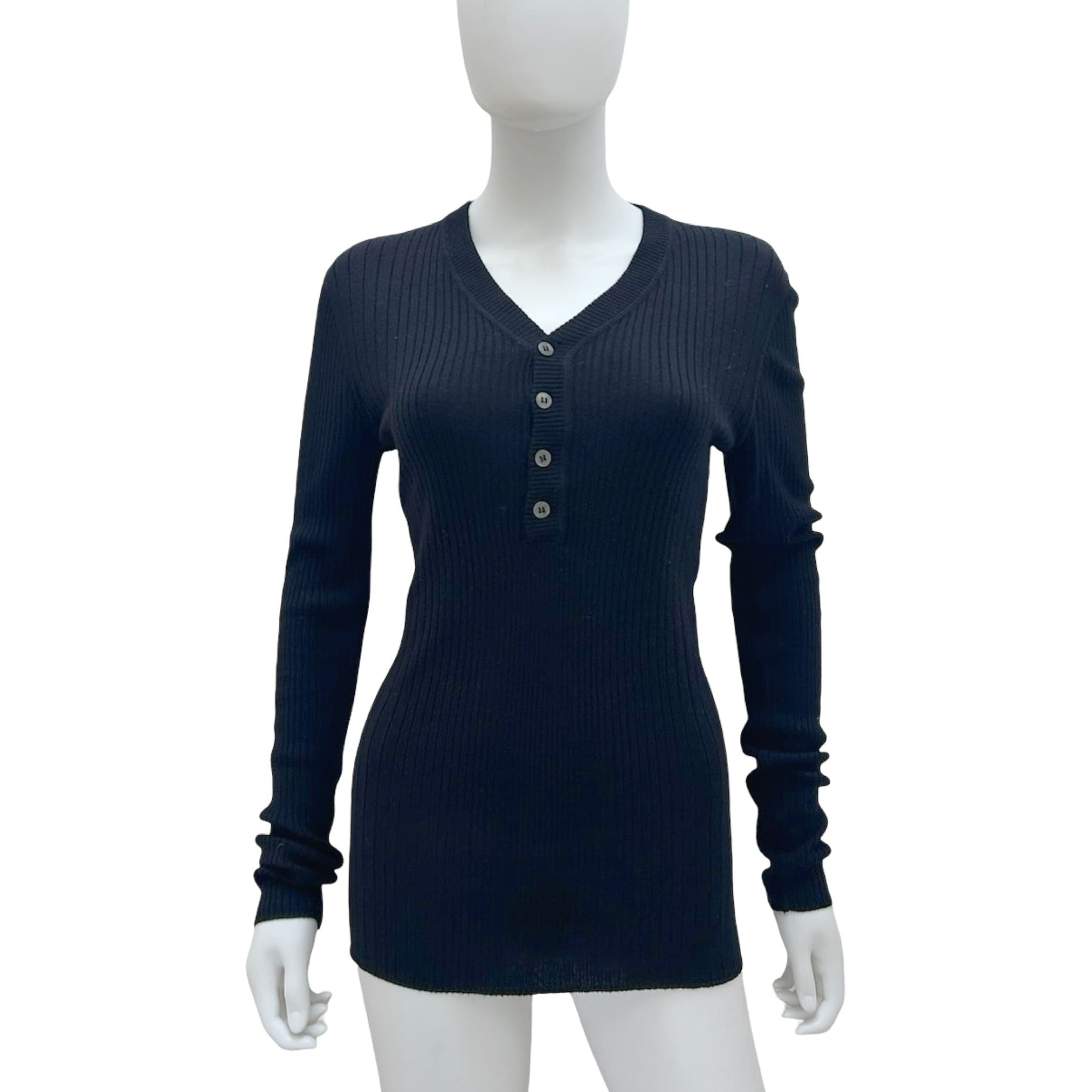 Description - Early 2000's Dolce & Gabbana black ribbed long sleeve henley top with rib knit trim and button details.