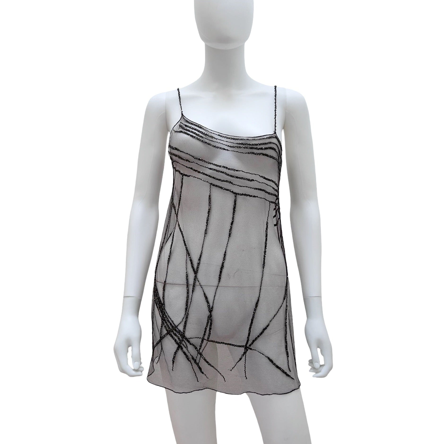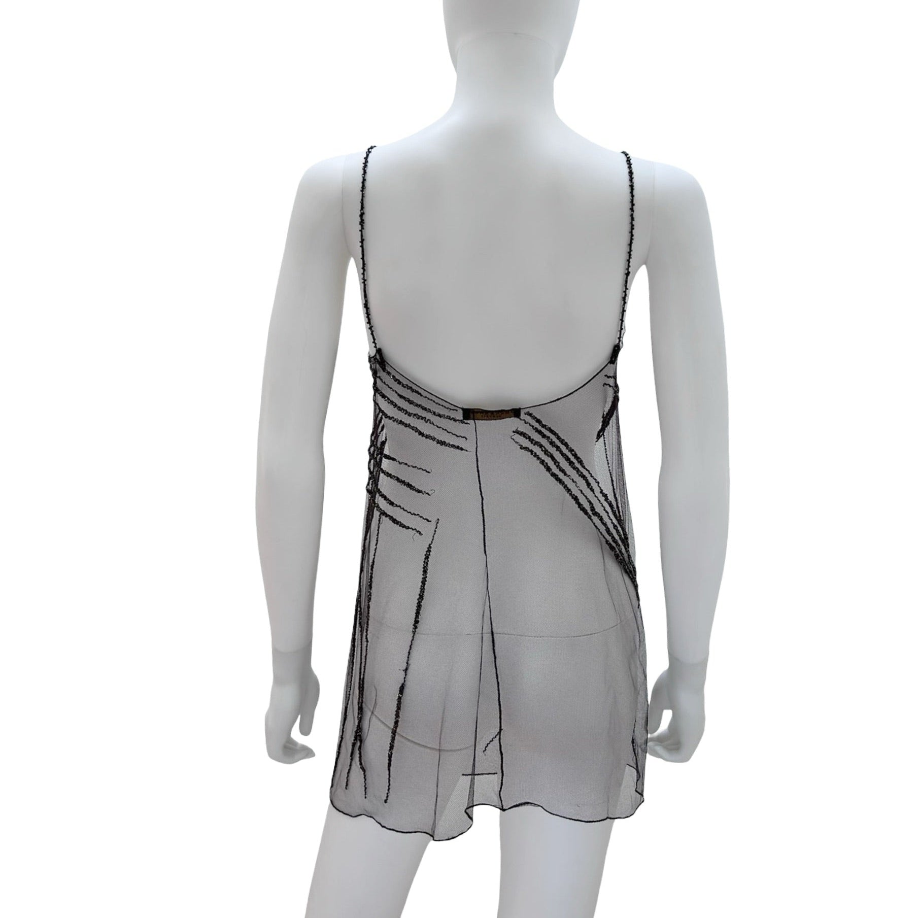 Description - Vintage sheer brown Donna Karan New York sleeveless top with scoop neck, beaded details throughout, and bead embellished spaghetti straps.