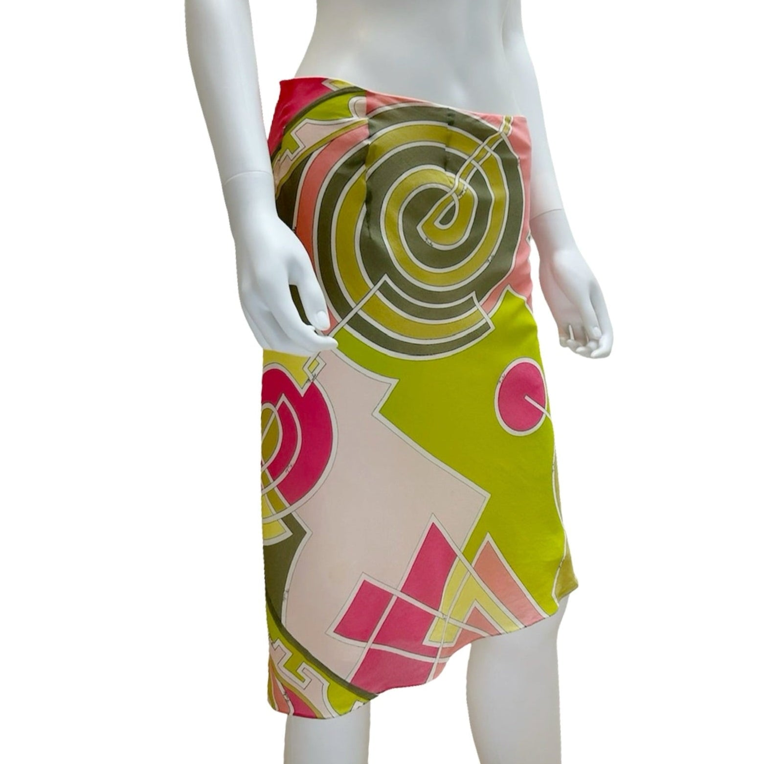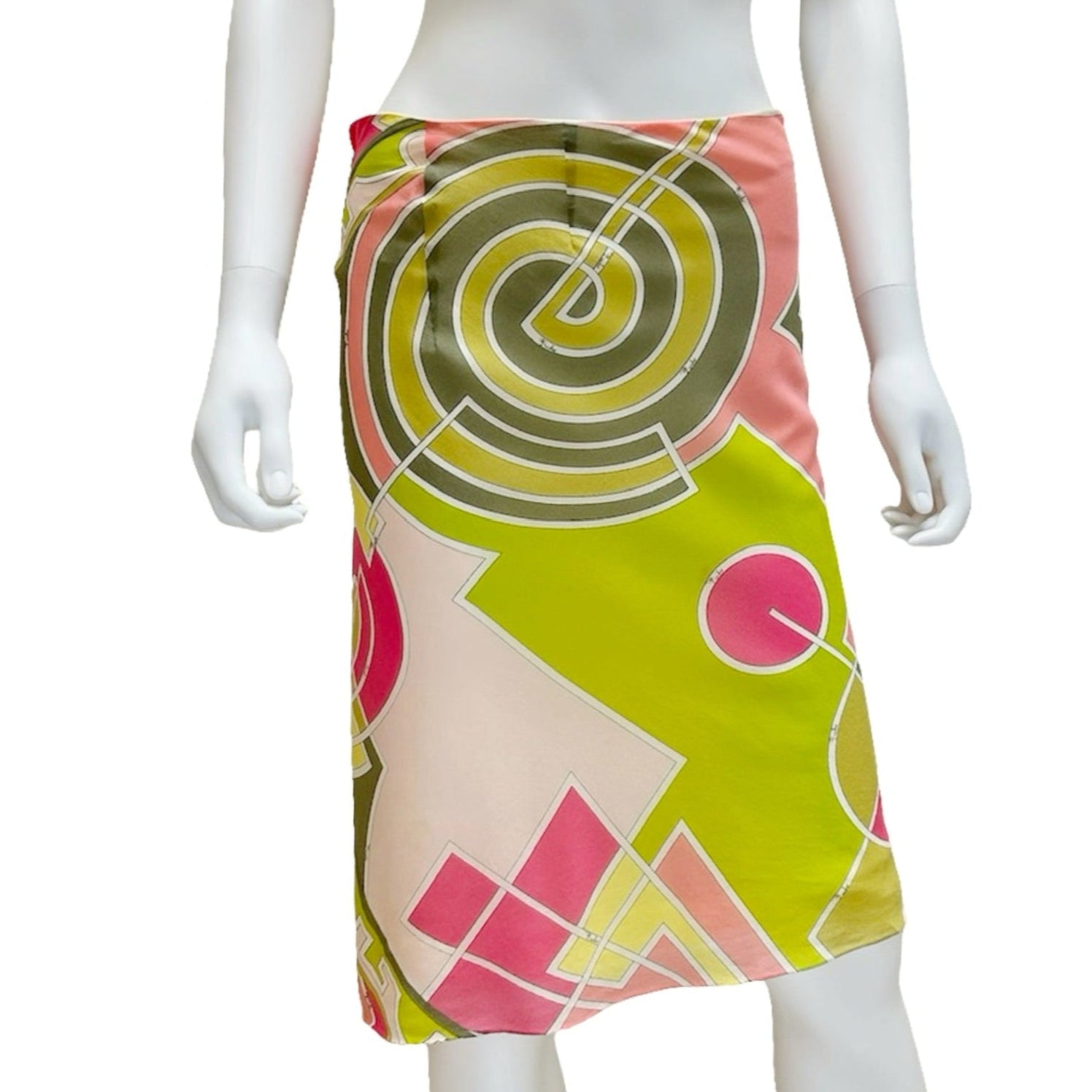 Description - Vintage multicolour silk blend Emilio Pucci midi skirt with geometric print thoughout and elastic waistband.