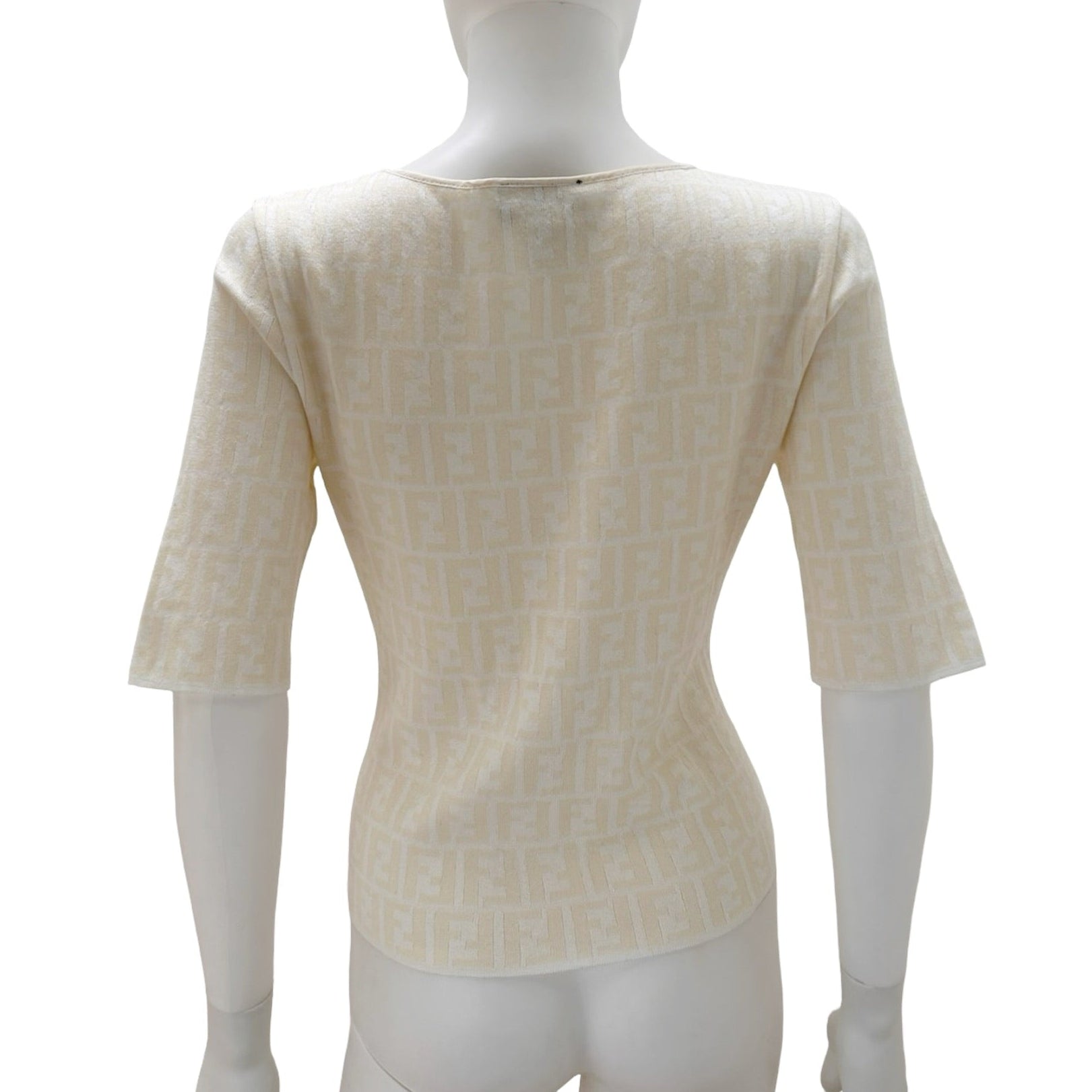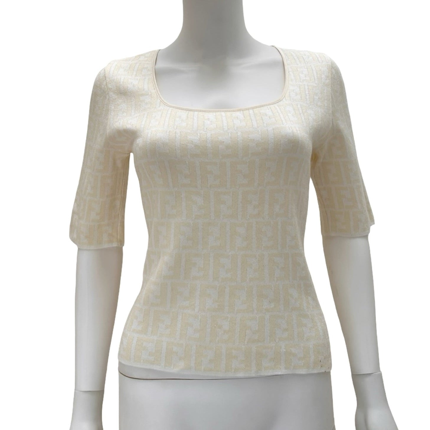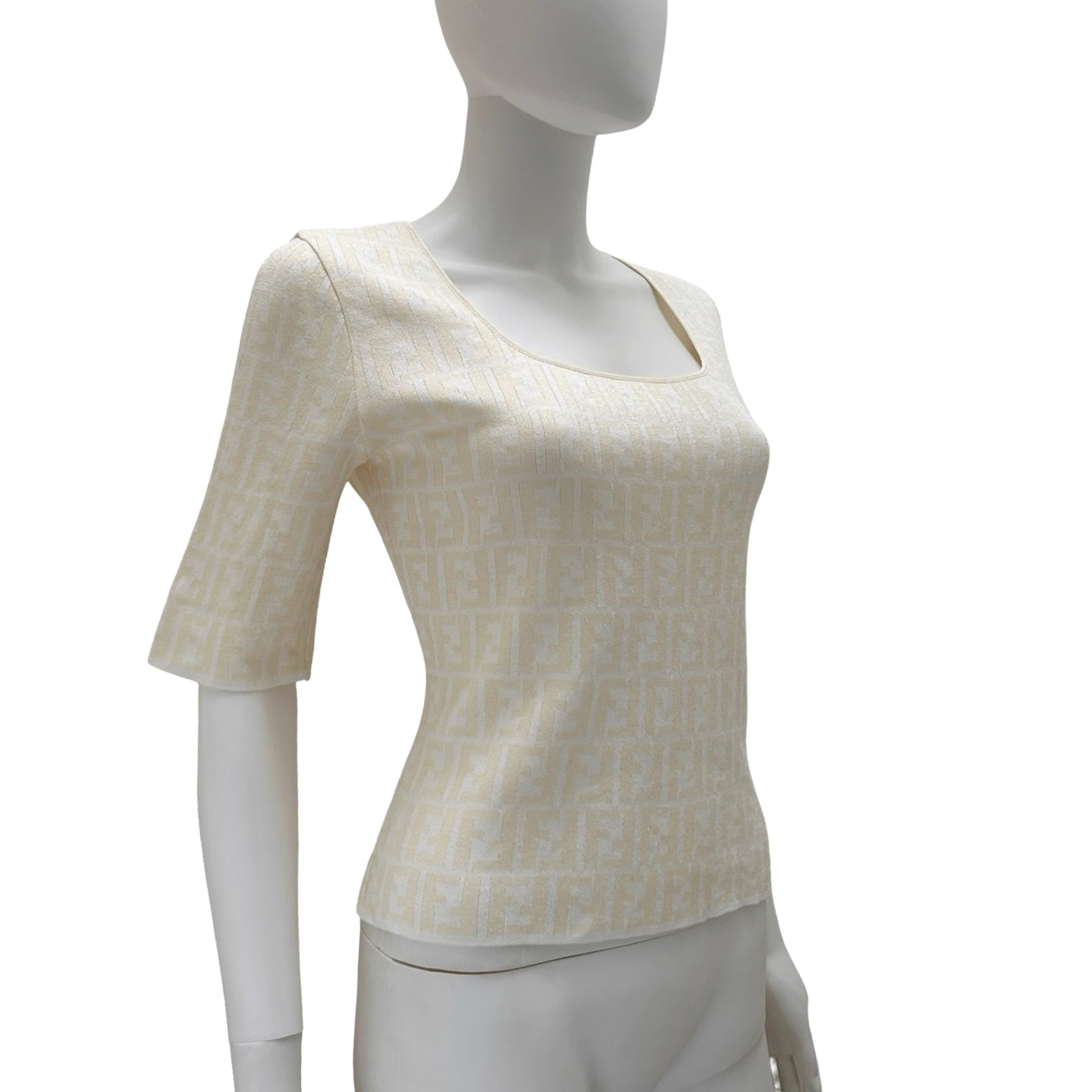 Description - 1990's white knit Fendi short sleeve with scoop neck and FF logo Zucca print pattern throughout.