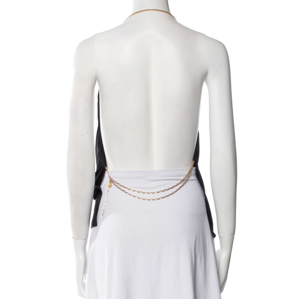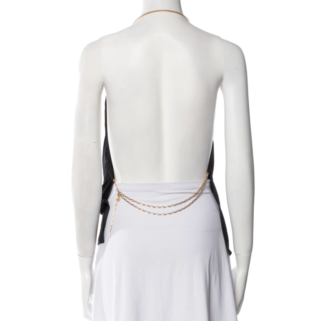 Description - Black silk Loewe draped sleeveless halter neck top with gold tone hardware and chain link accents.