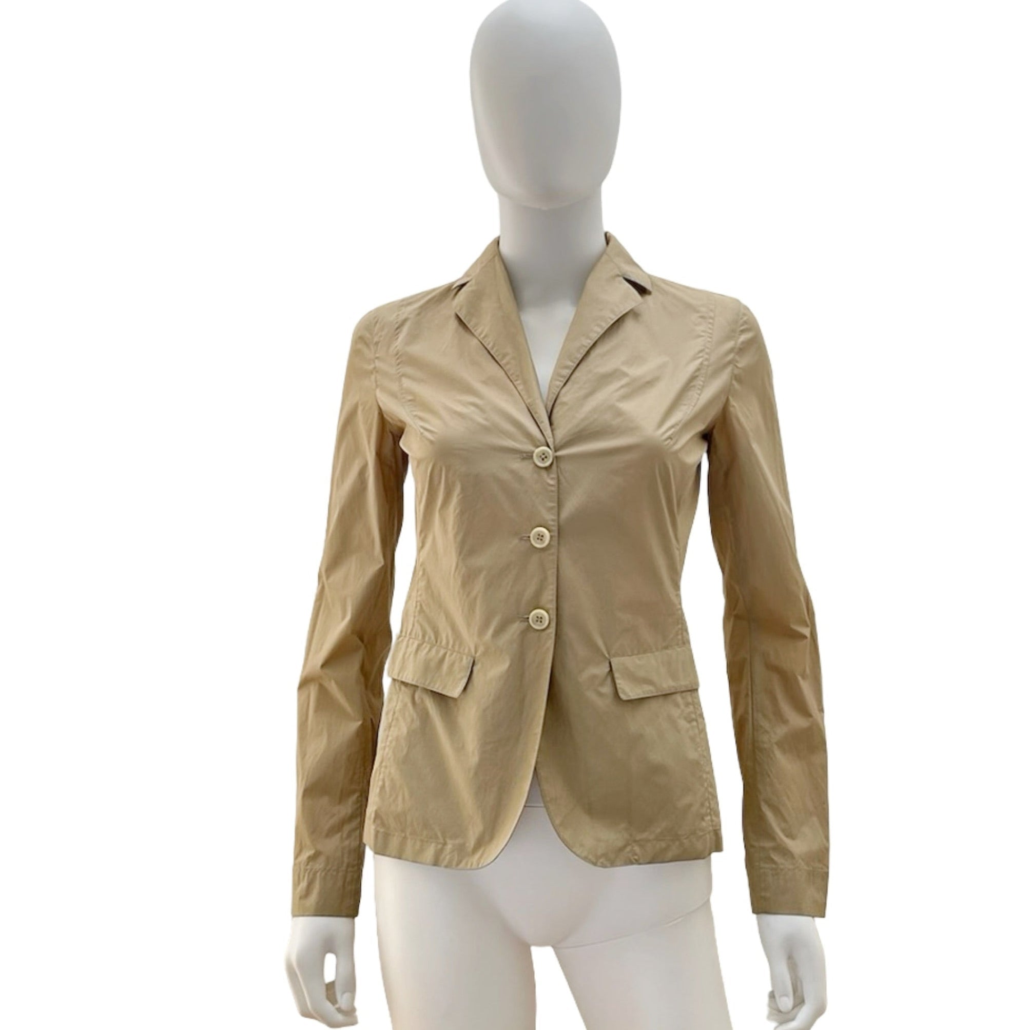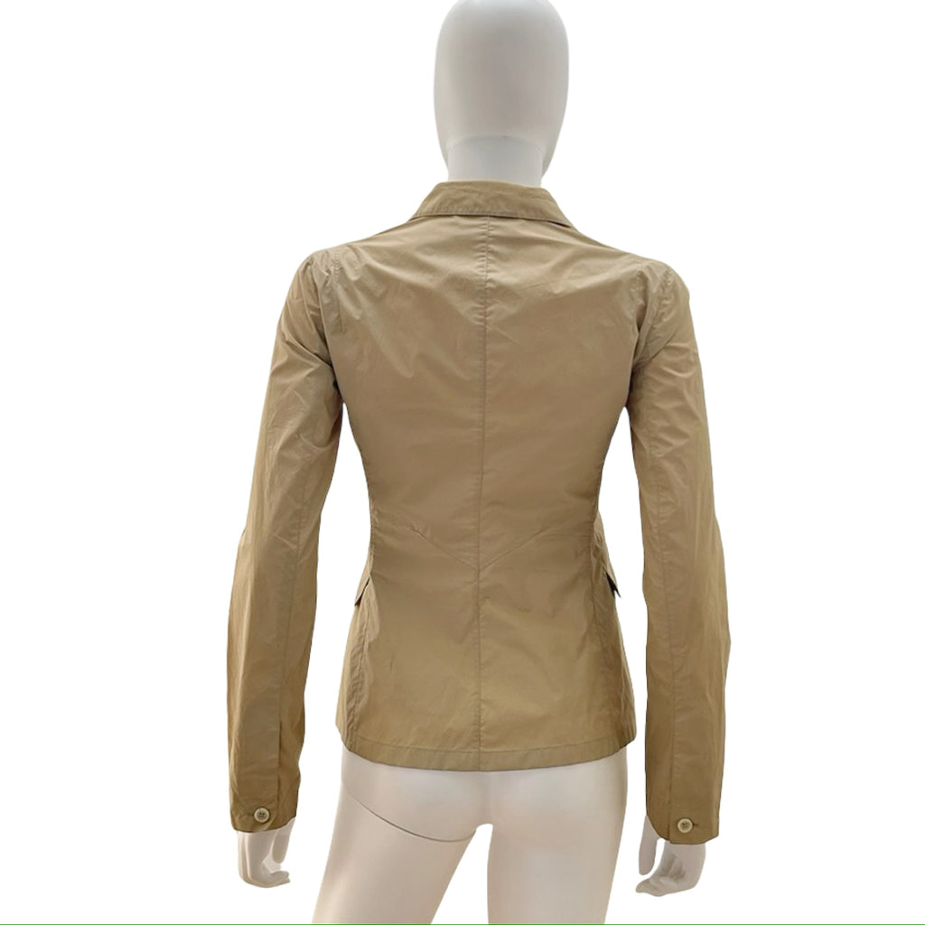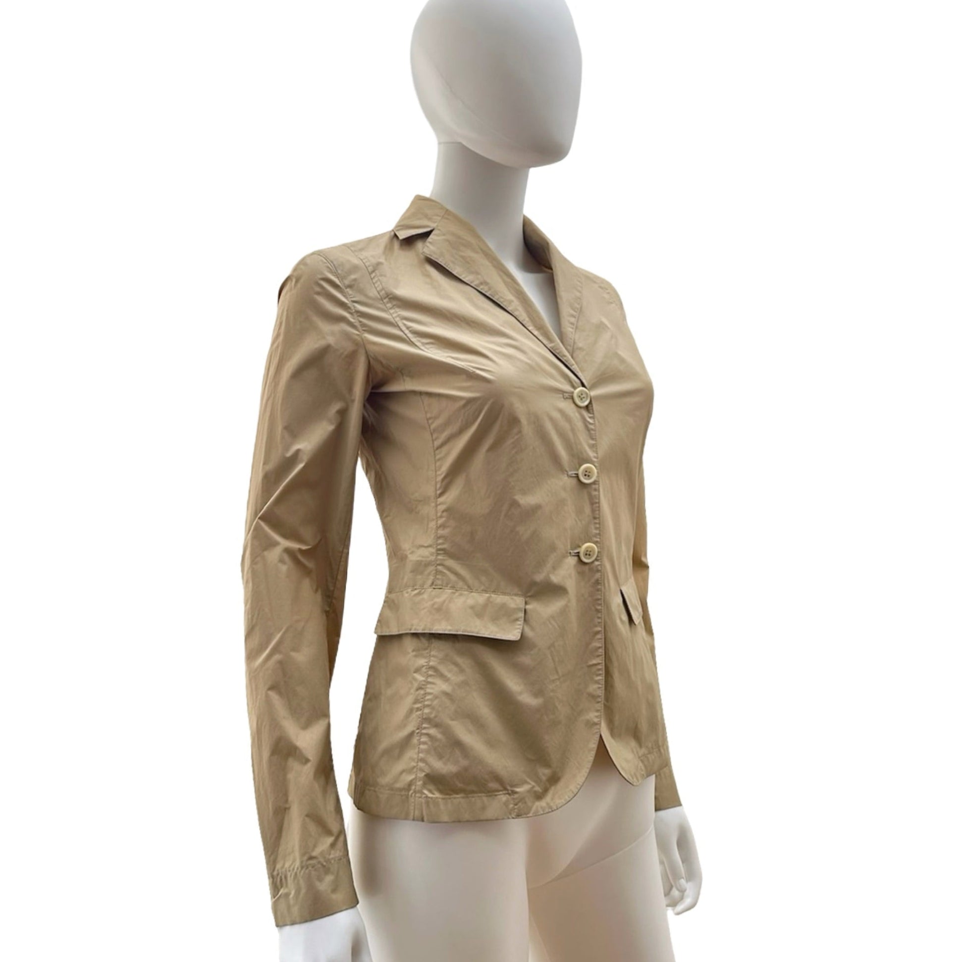 Description - Early 2000's neutral nylon Prada blazer with pointed collar, button up closure at front and dual pockets at front.