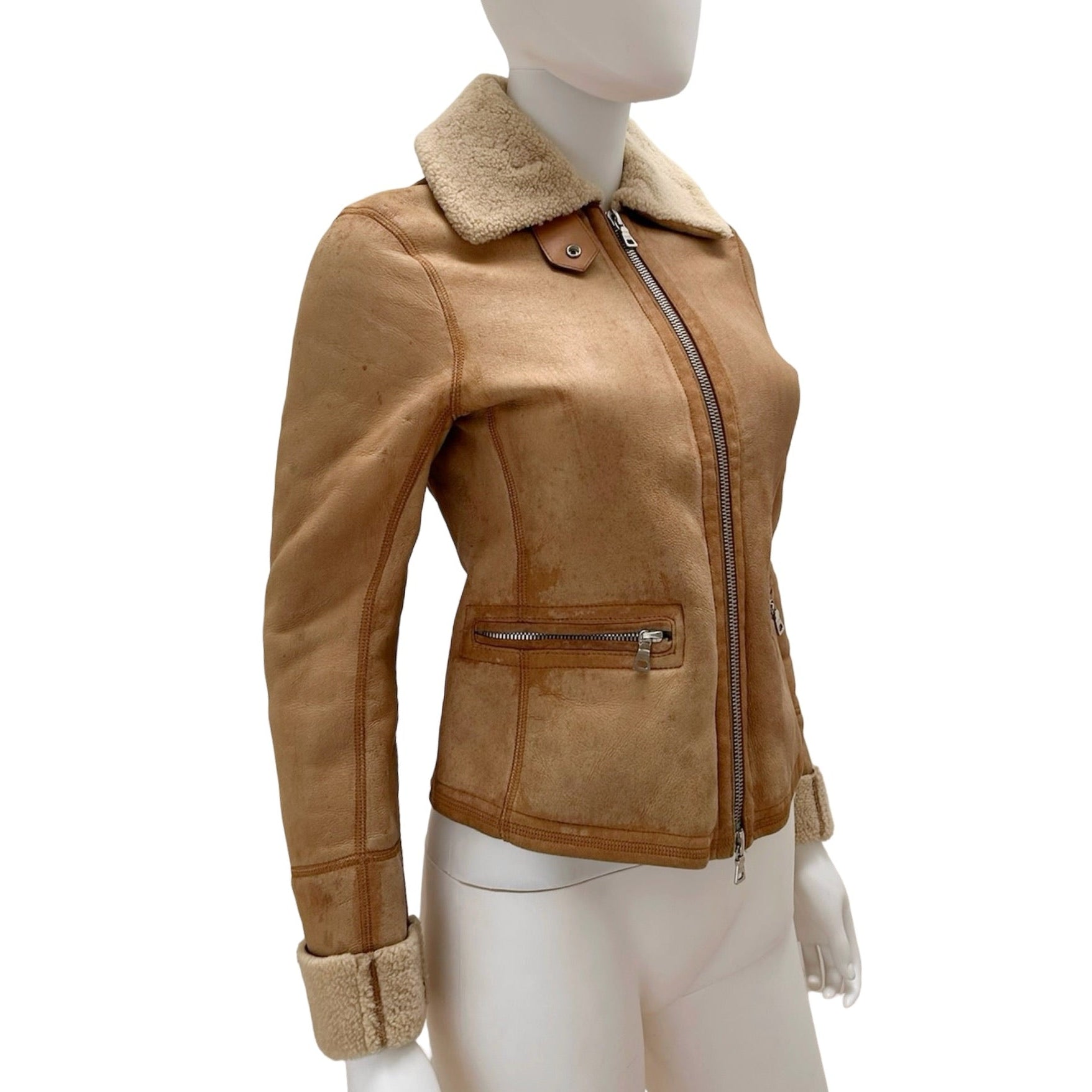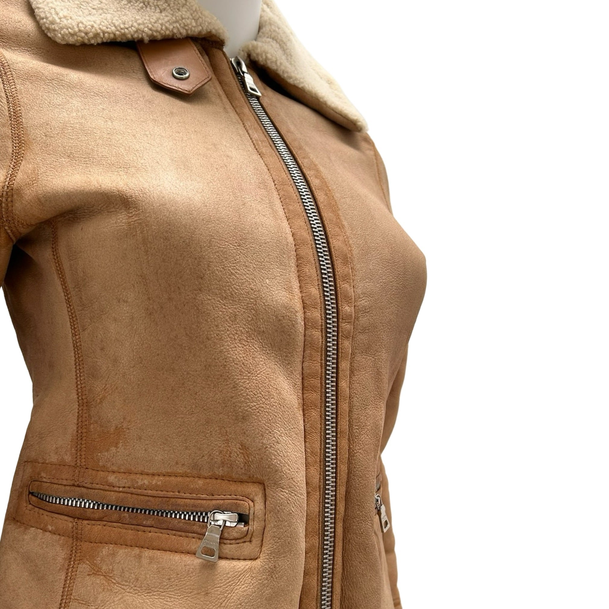 Description - Vintage neutral leather shearling aviator jacket with dual zip up closure at front, dual zip up pockets at sides, pointed collar and shearling lining with cuff detail at sleeves.