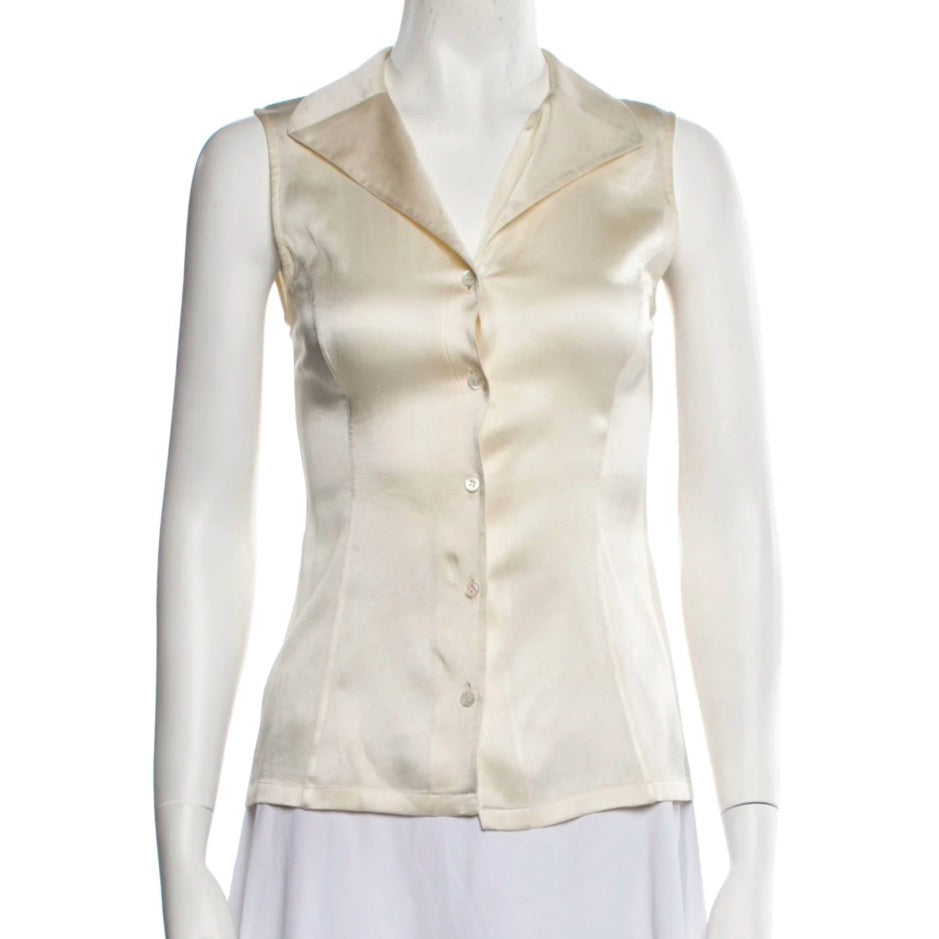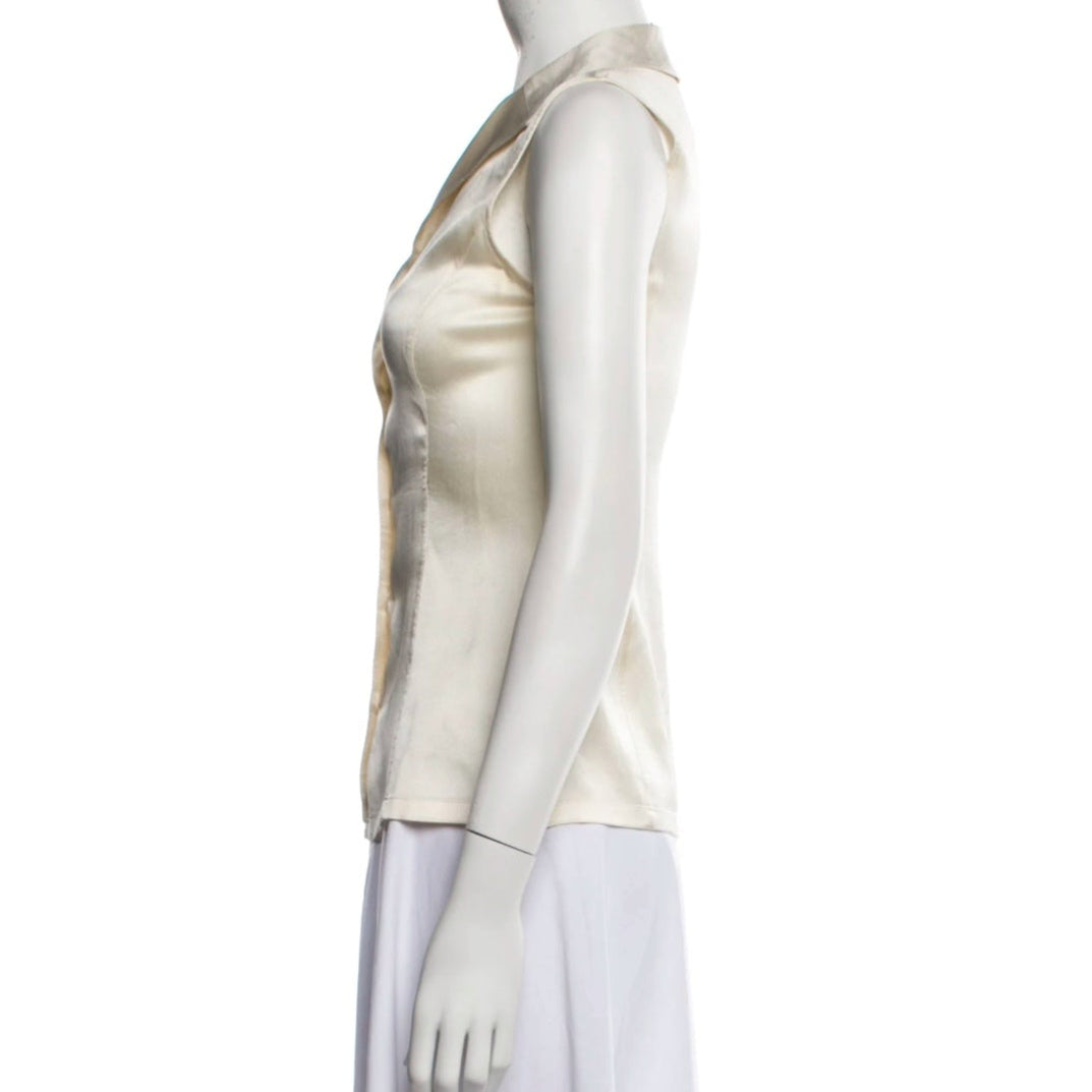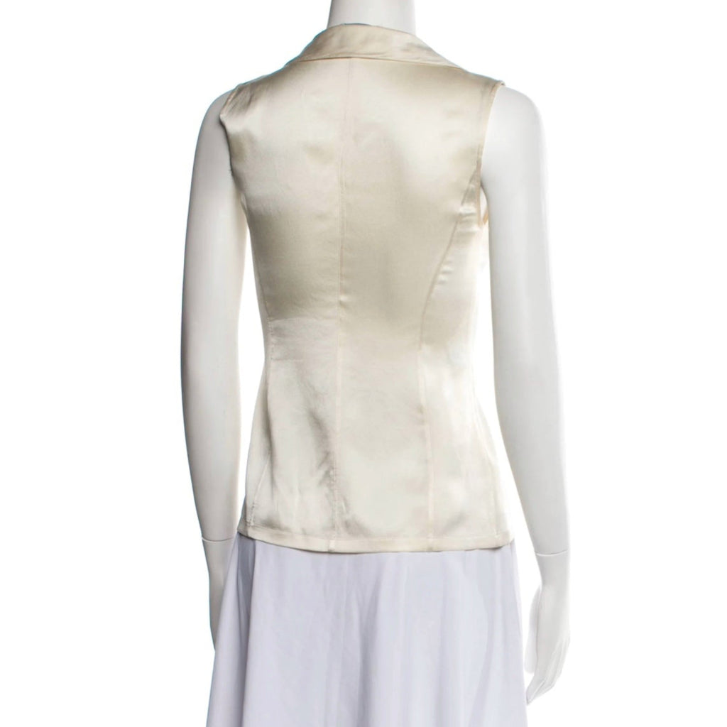 Description - Vintage white satin silk Prada sleeveless top with button up closure at front, pointed collar, and darted details throughout.